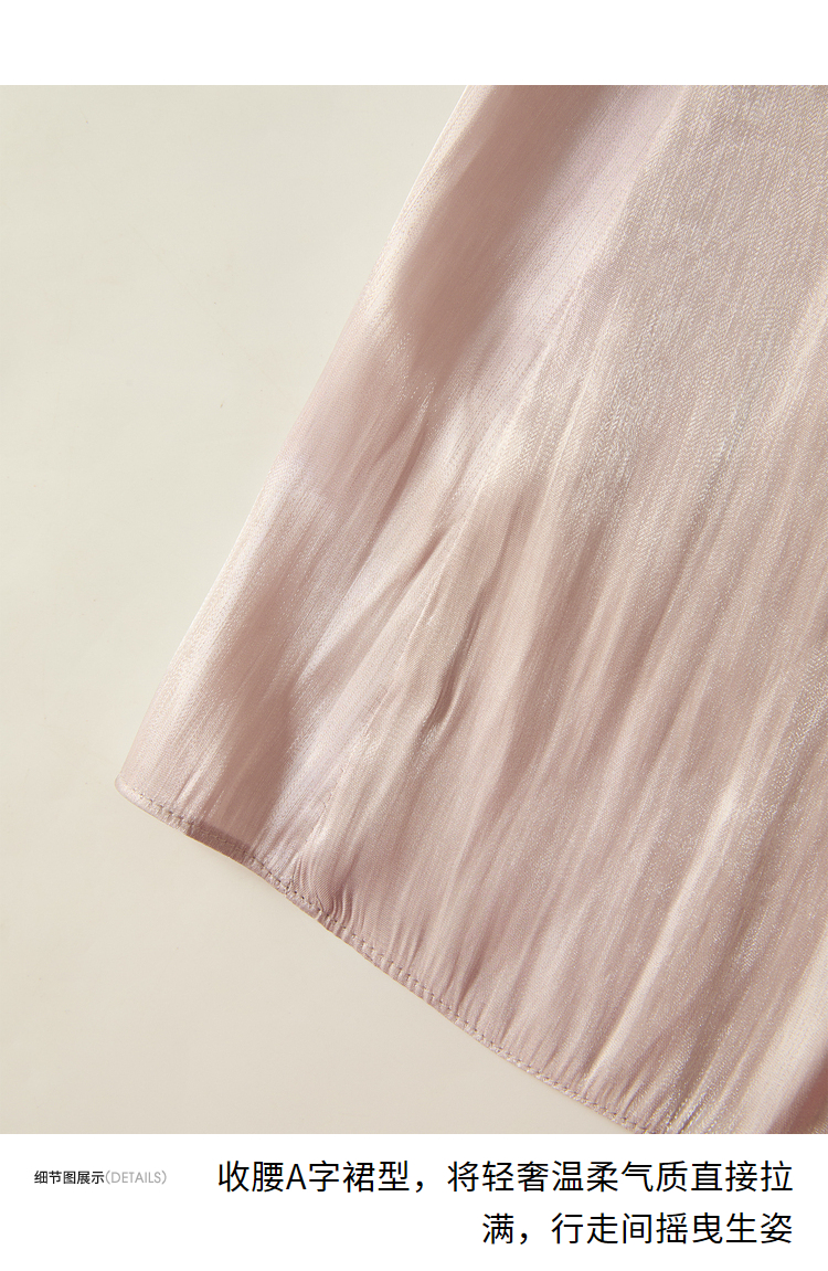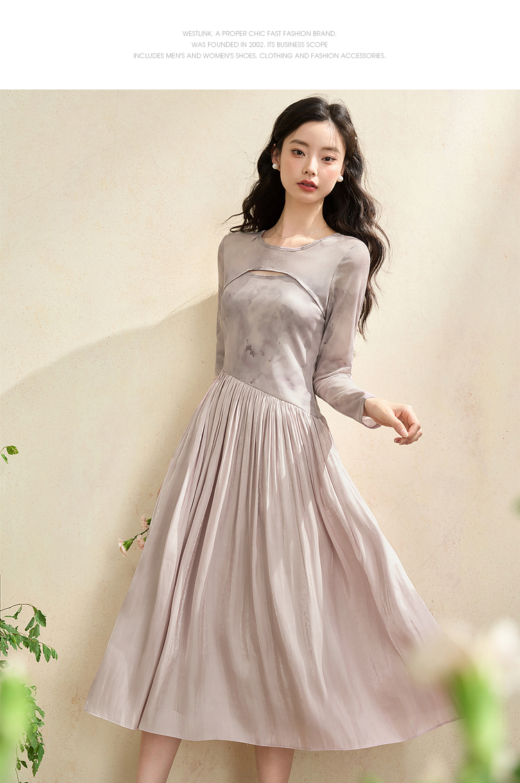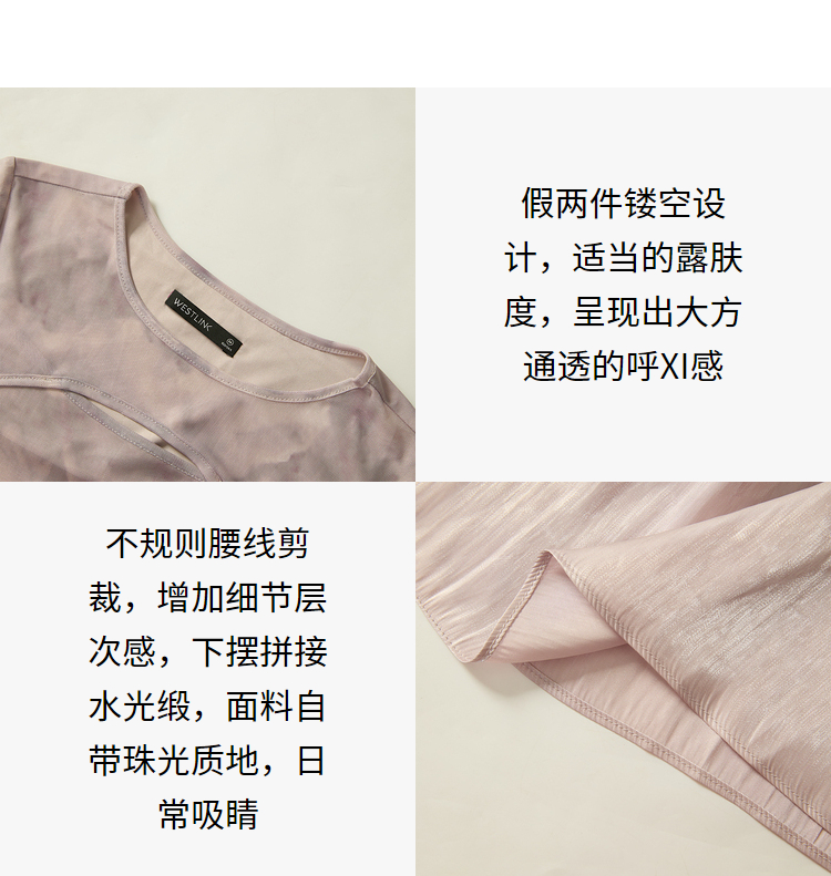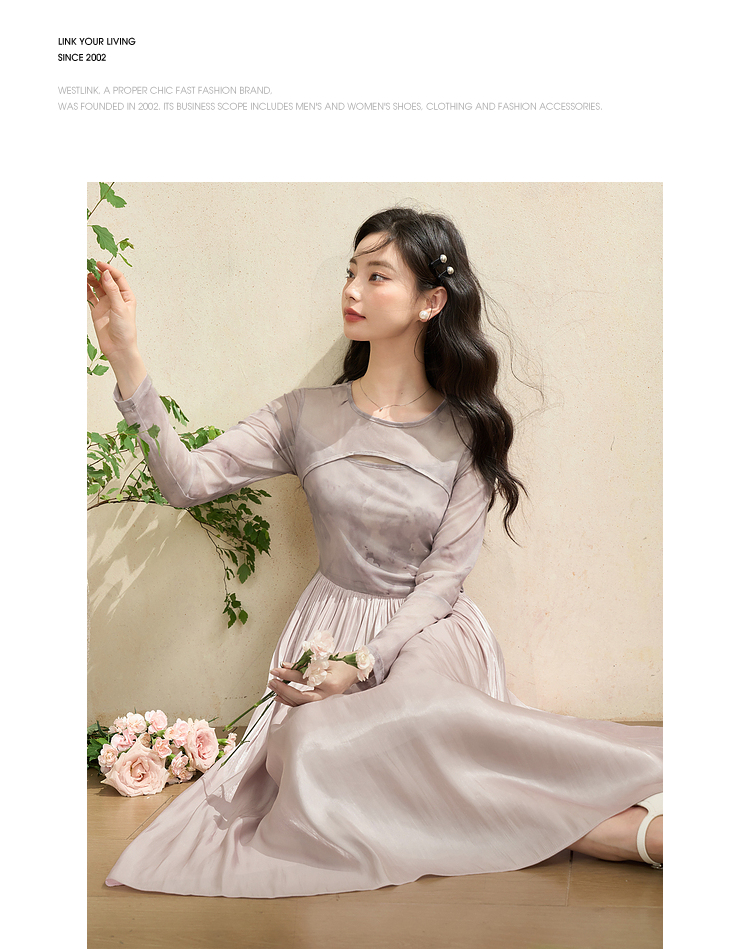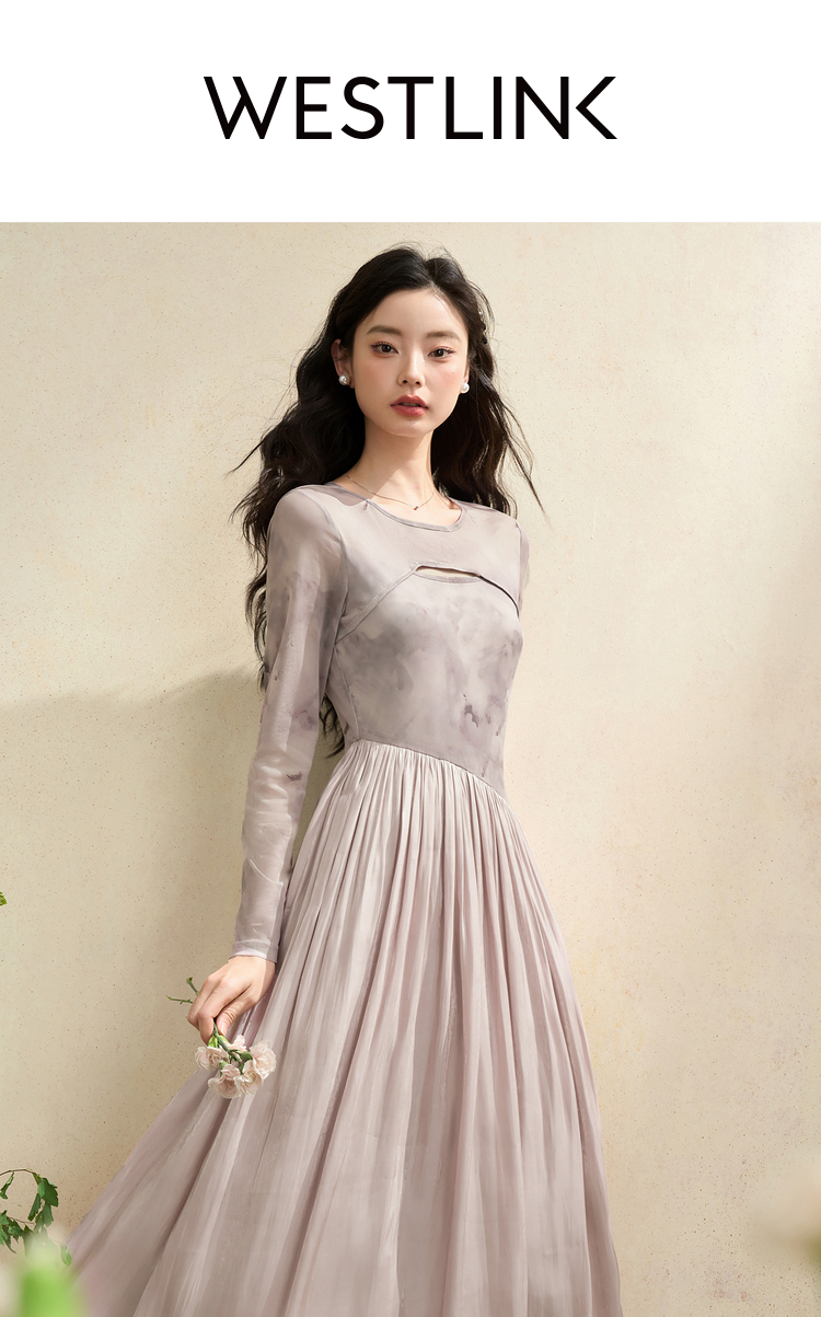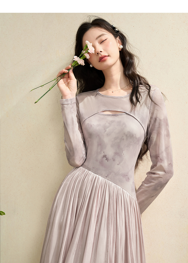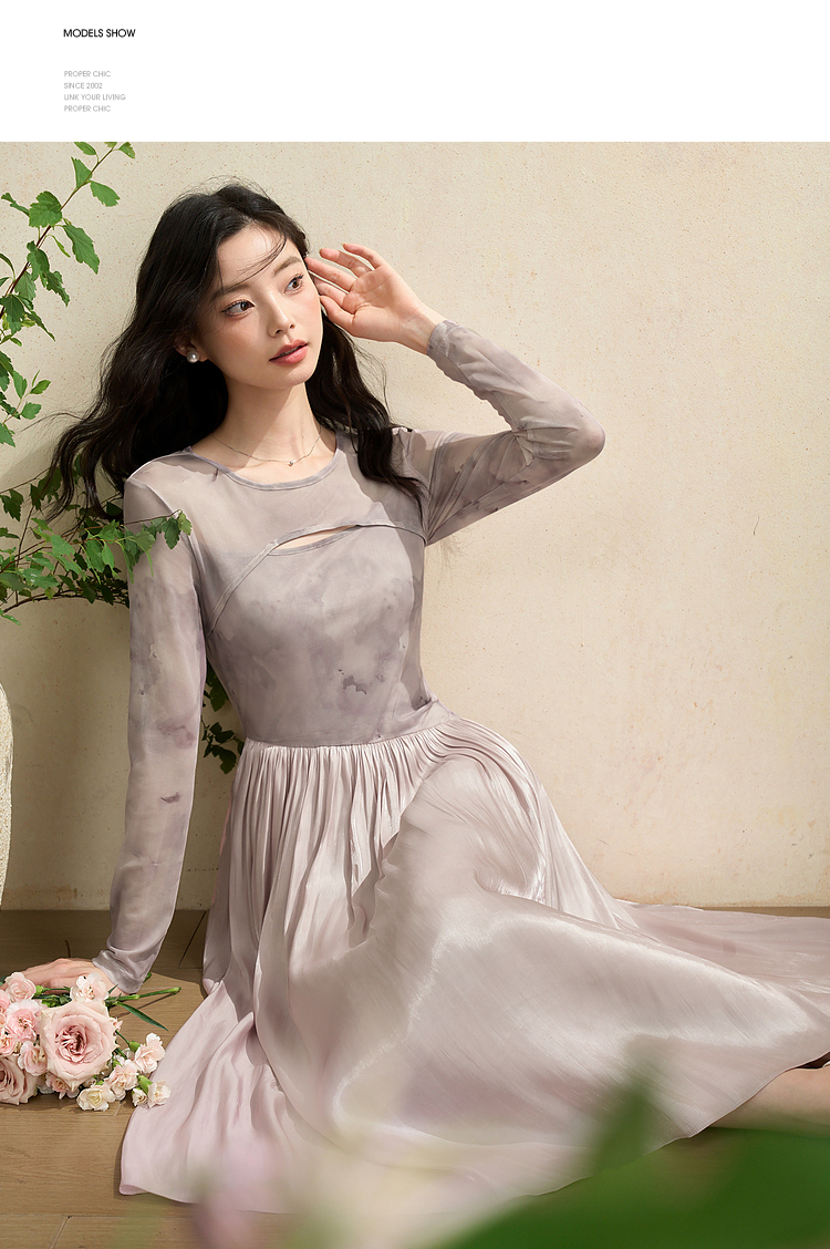 假两件设计感印花网纱拼接镂空连衣裙女轻奢温柔长裙V2942193