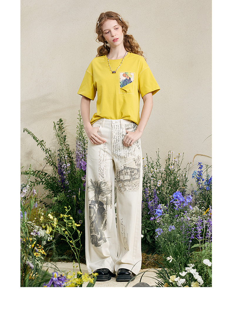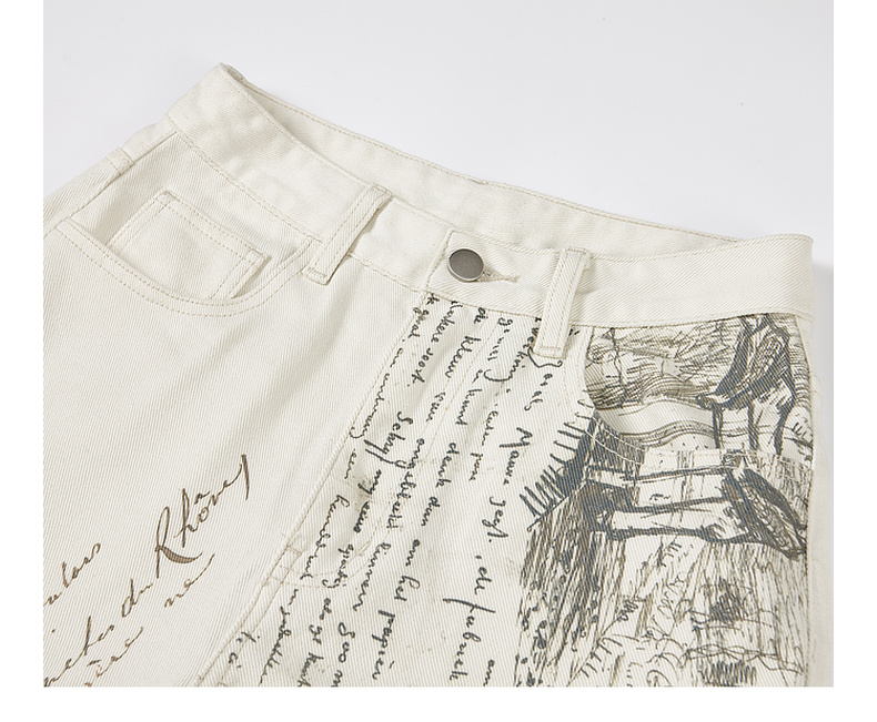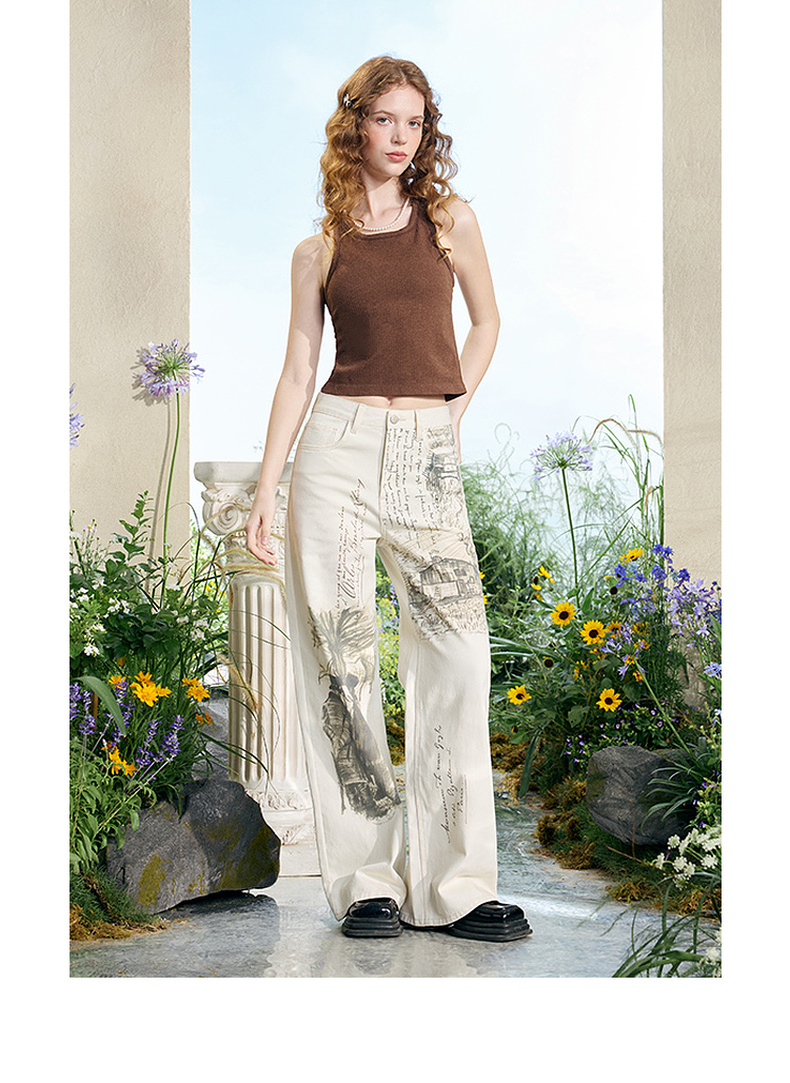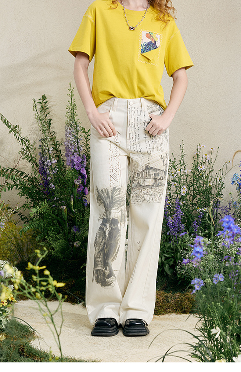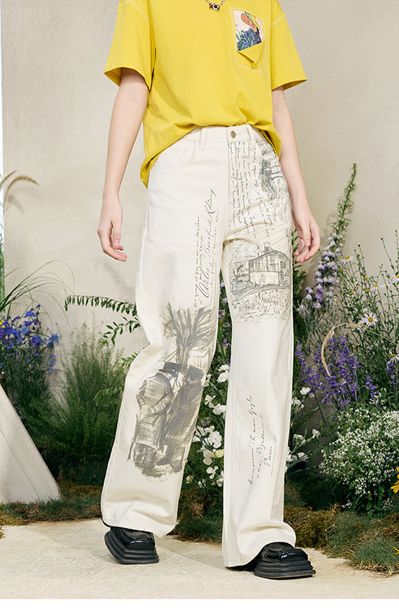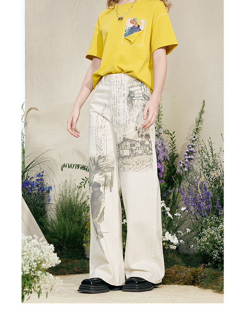 两三事梵高文艺 泛黄诗行 2025夏季新款文艺风印花阔腿牛仔裤女