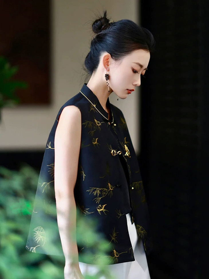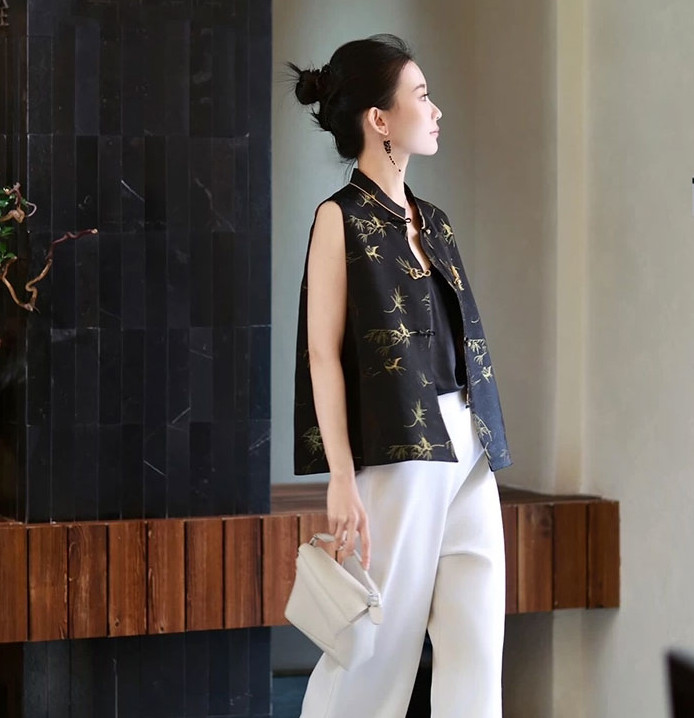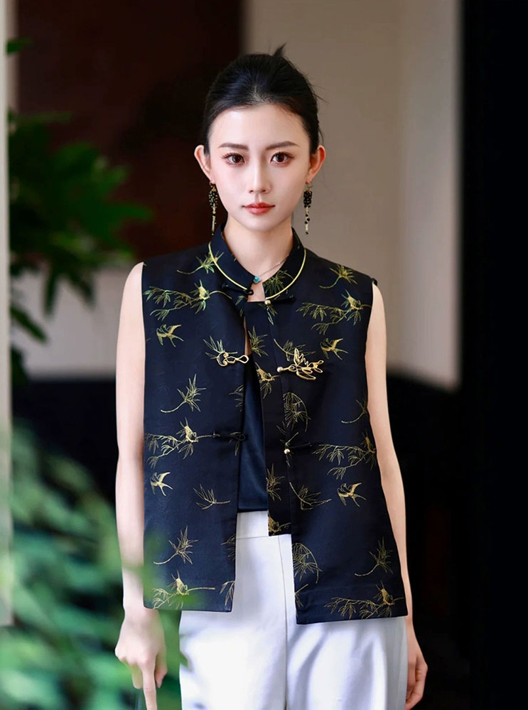 新中式「竹燕春晖」马甲为独家定制首发款,面料图案为全新研发新制,现在下单需预售7-10,一件高级的设计款衣服值得等待,介意慎拍,望见谅!