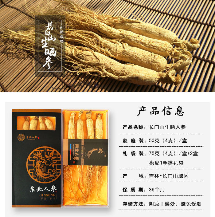 【产品规格】 长白山生晒人参【家庭装】4支共50克/盒,【精美礼品装】4支共75克✖️2盒(送手提袋)(每箱都是独立的包装,如购买多件分多个包裹发出,可能会前后陆续到货)。