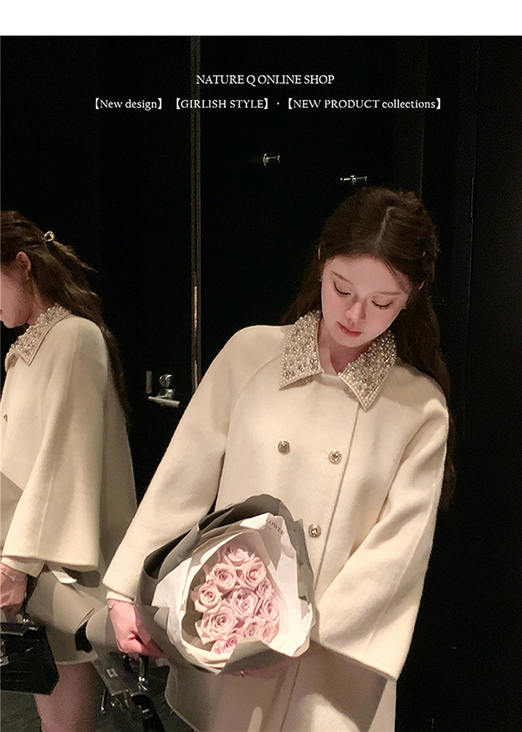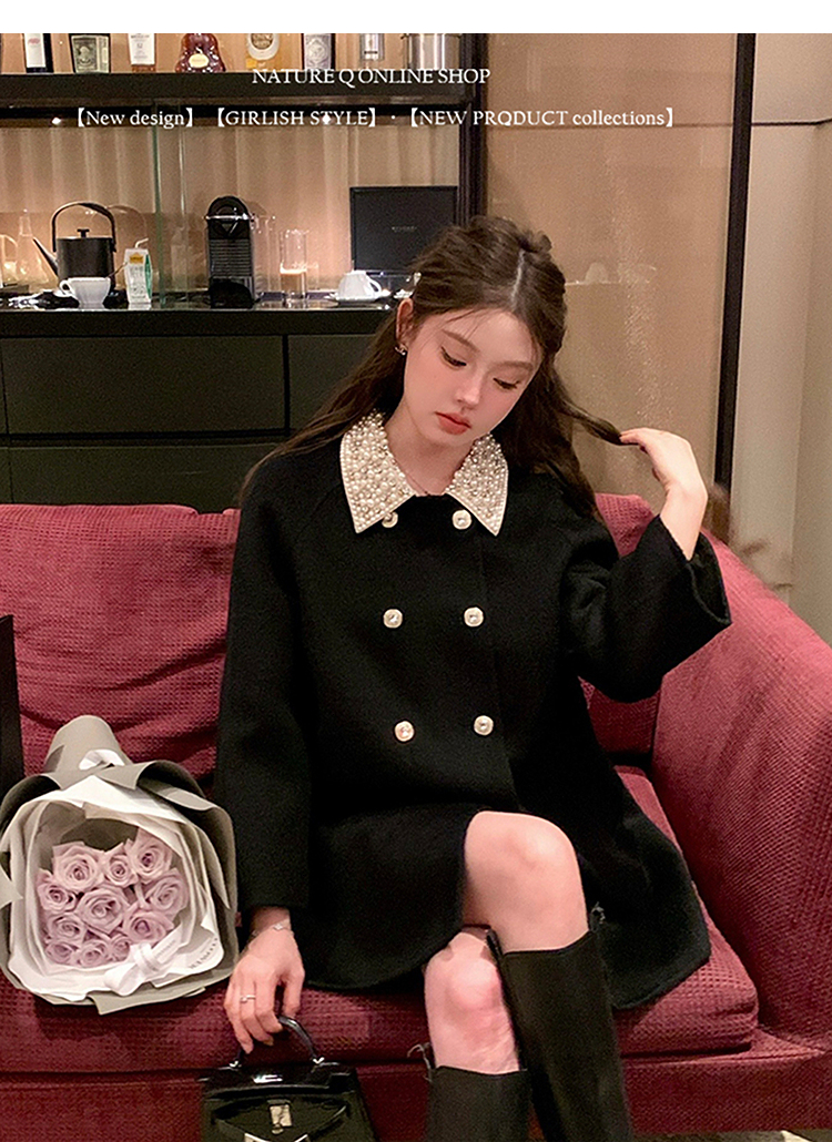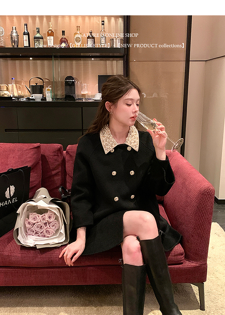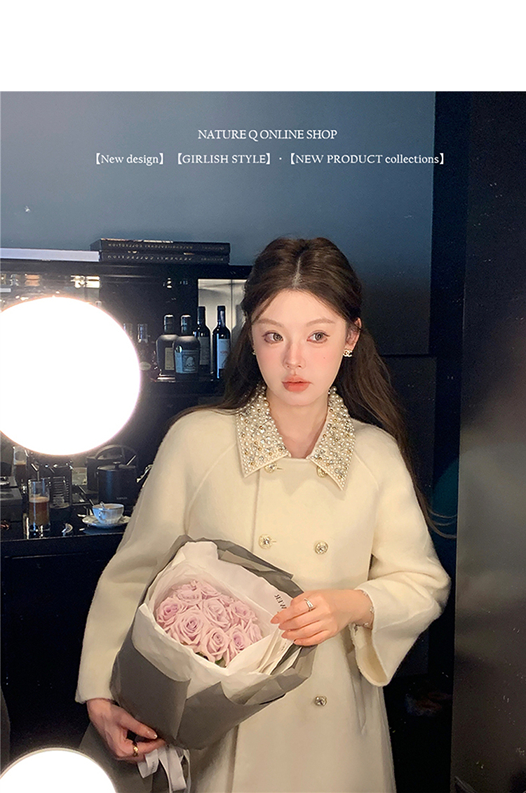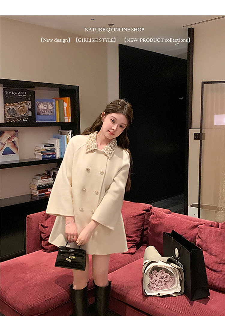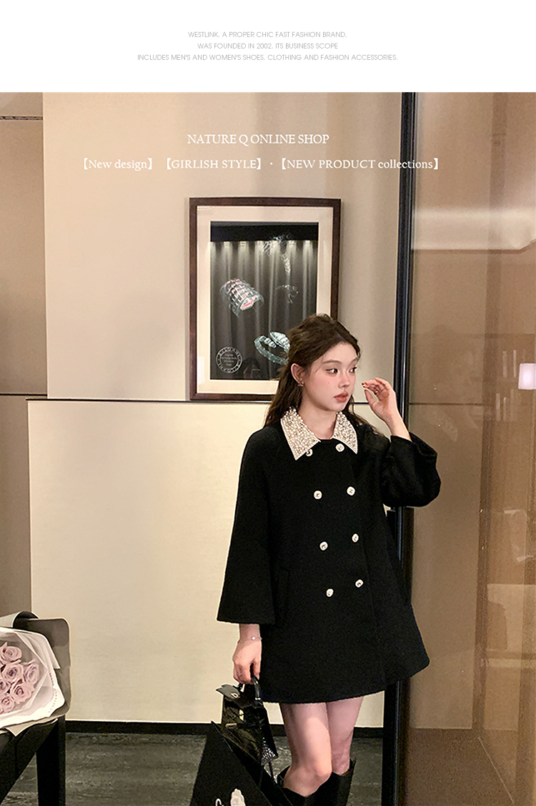 西遇中长款呢料外套女冬季新款富家千金钉珠领口双排扣大衣SS141336