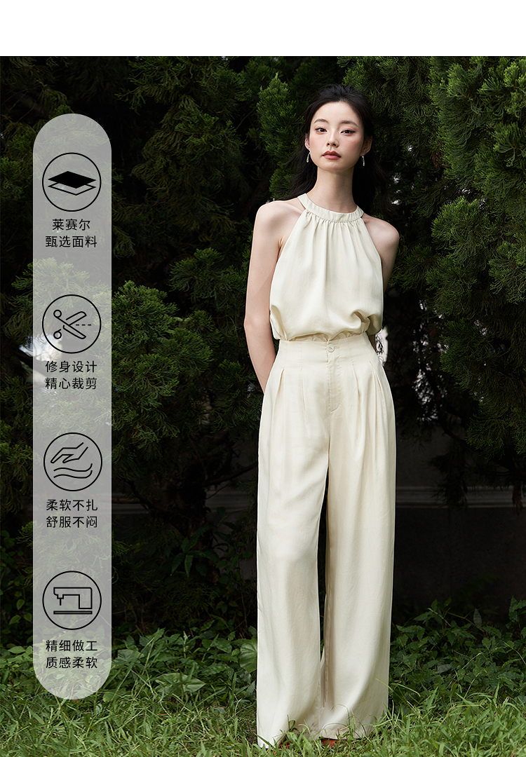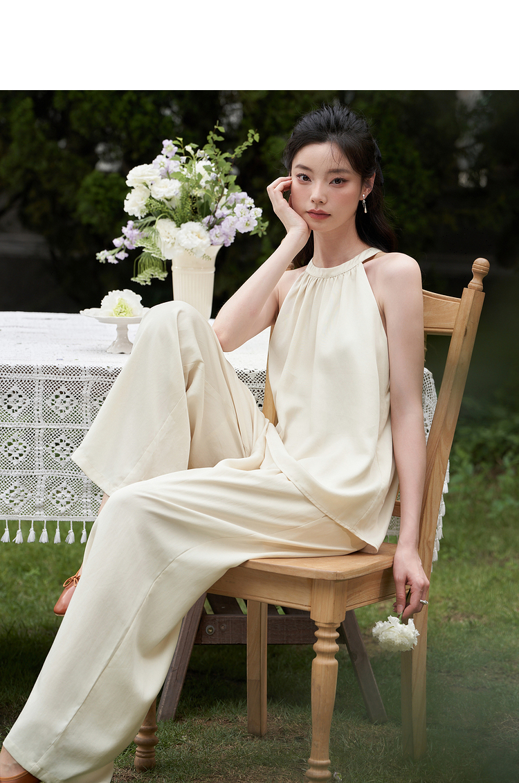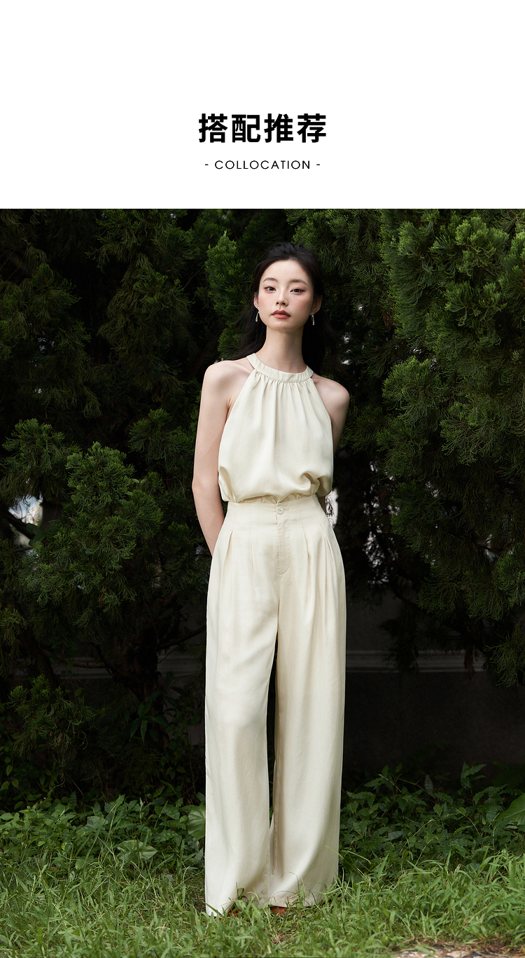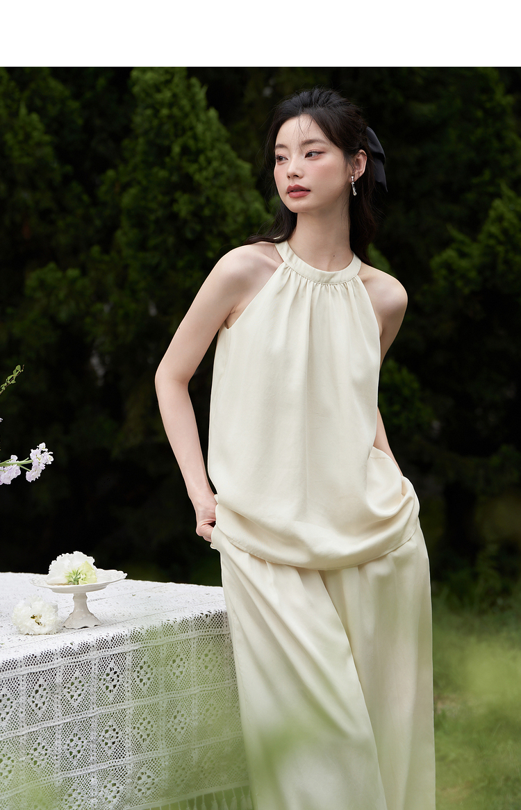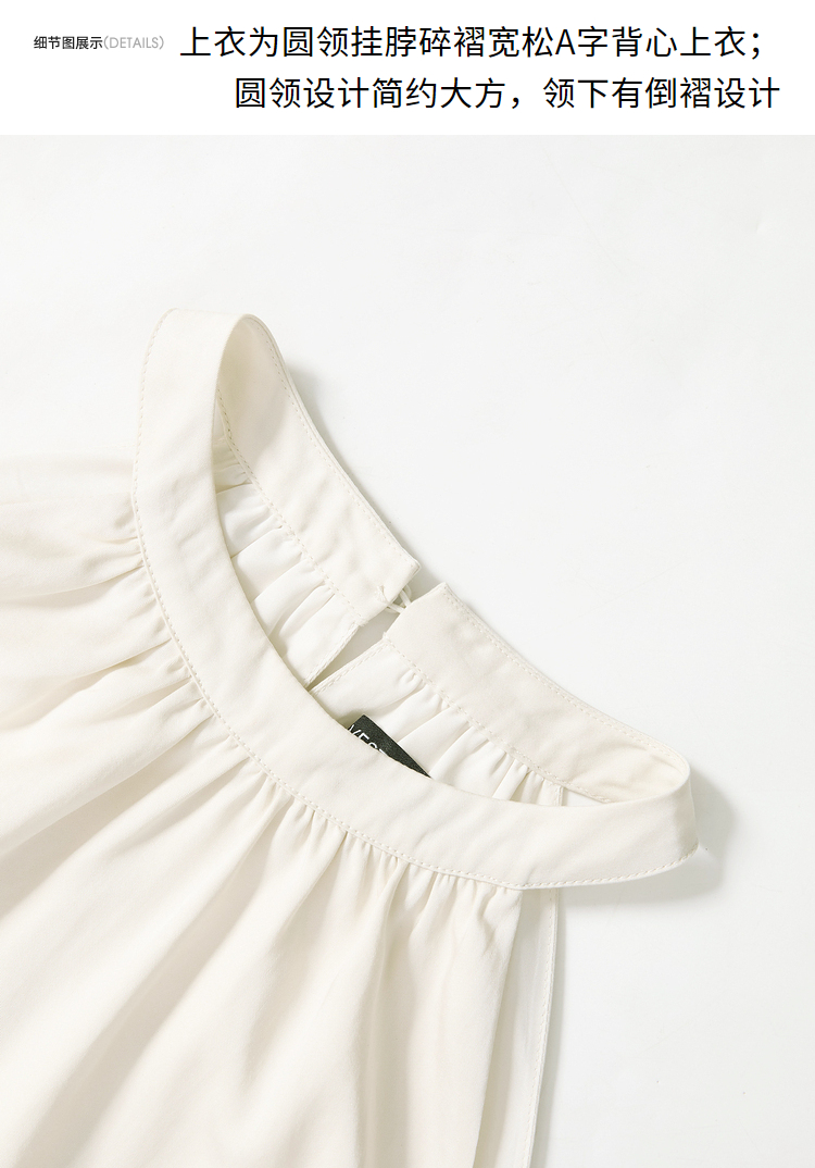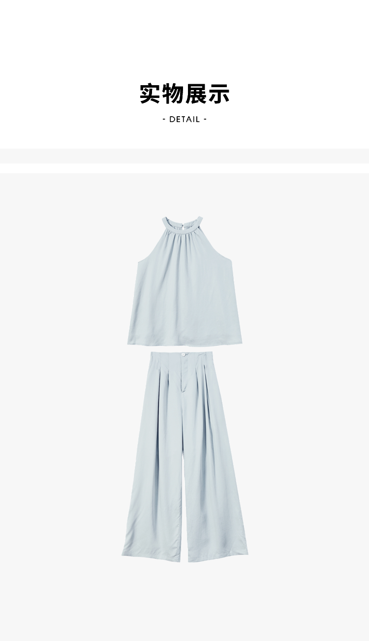 设计简约通勤风两件套女夏圆领挂脖碎褶上衣搭阔腿裤套装V1541335