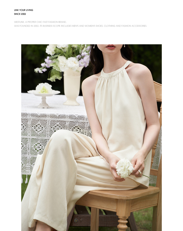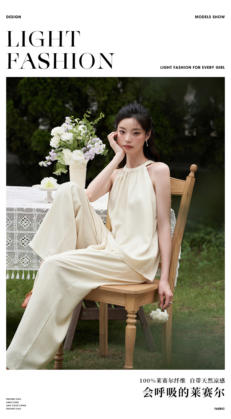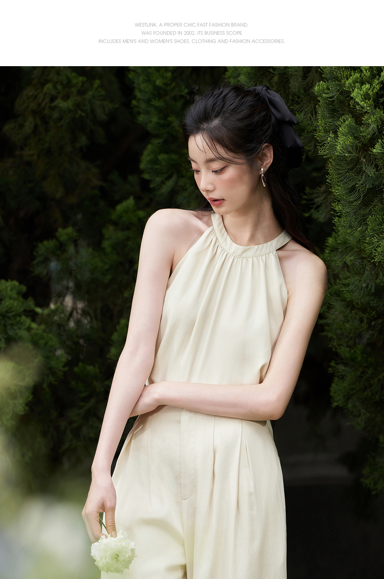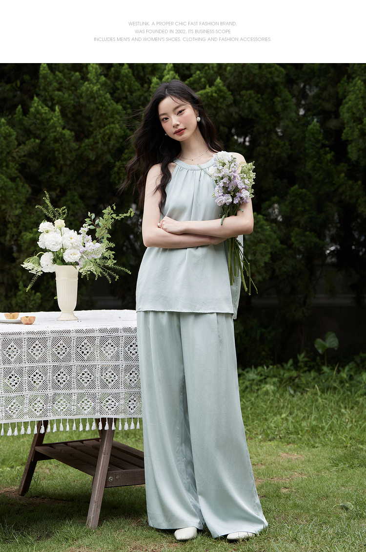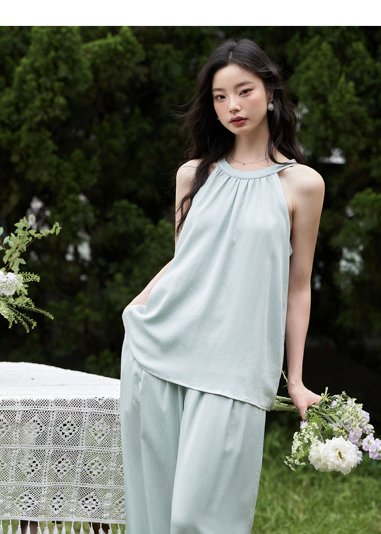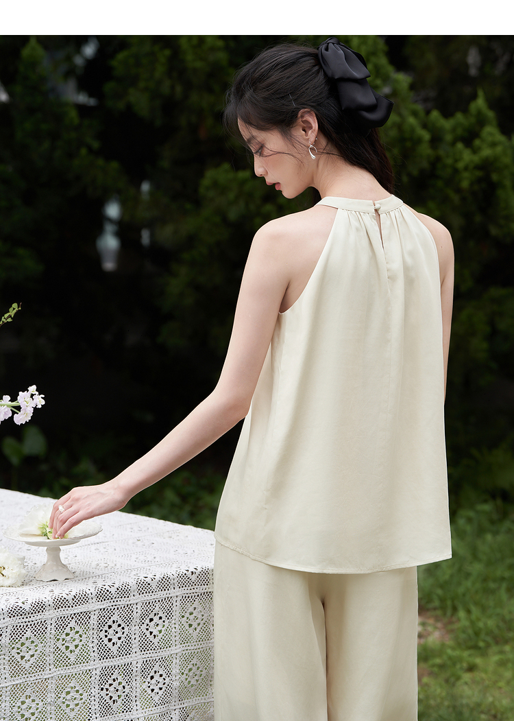 设计简约通勤风两件套女夏圆领挂脖碎褶上衣搭阔腿裤套装V1541335