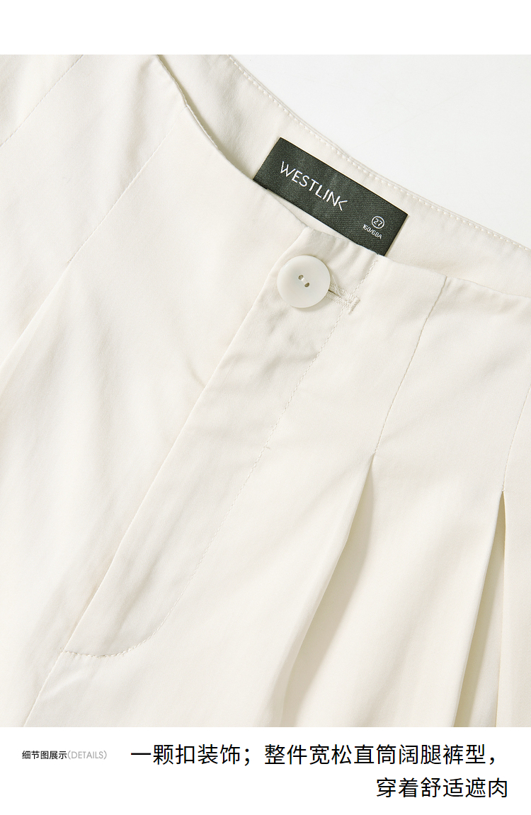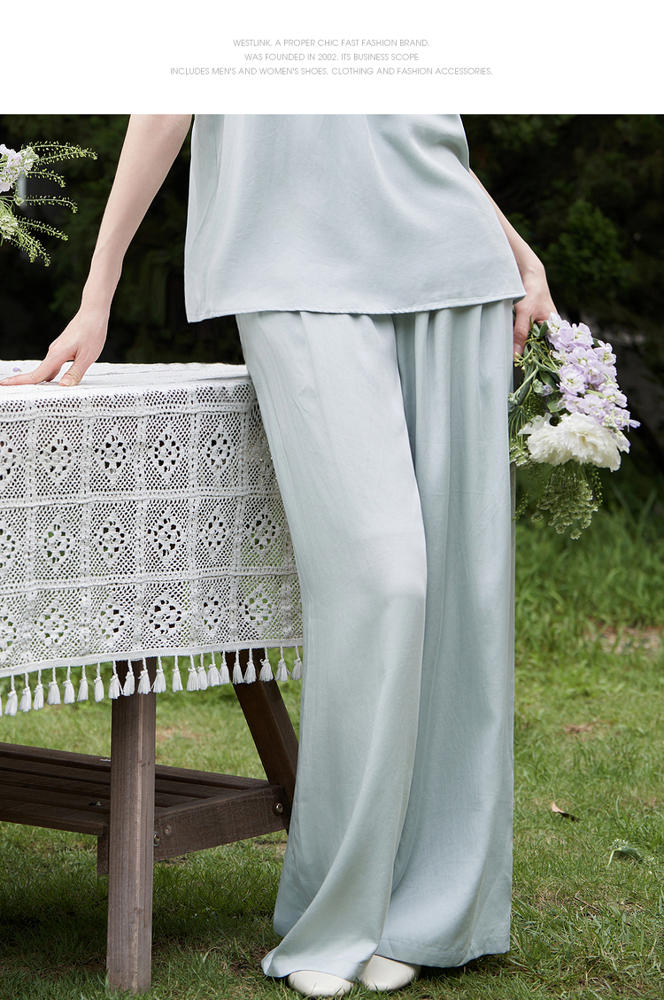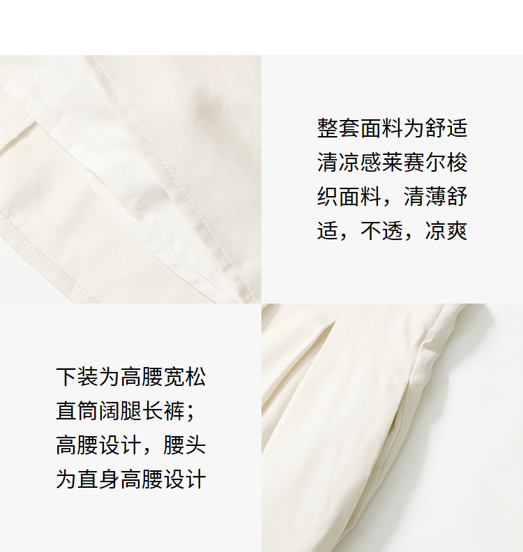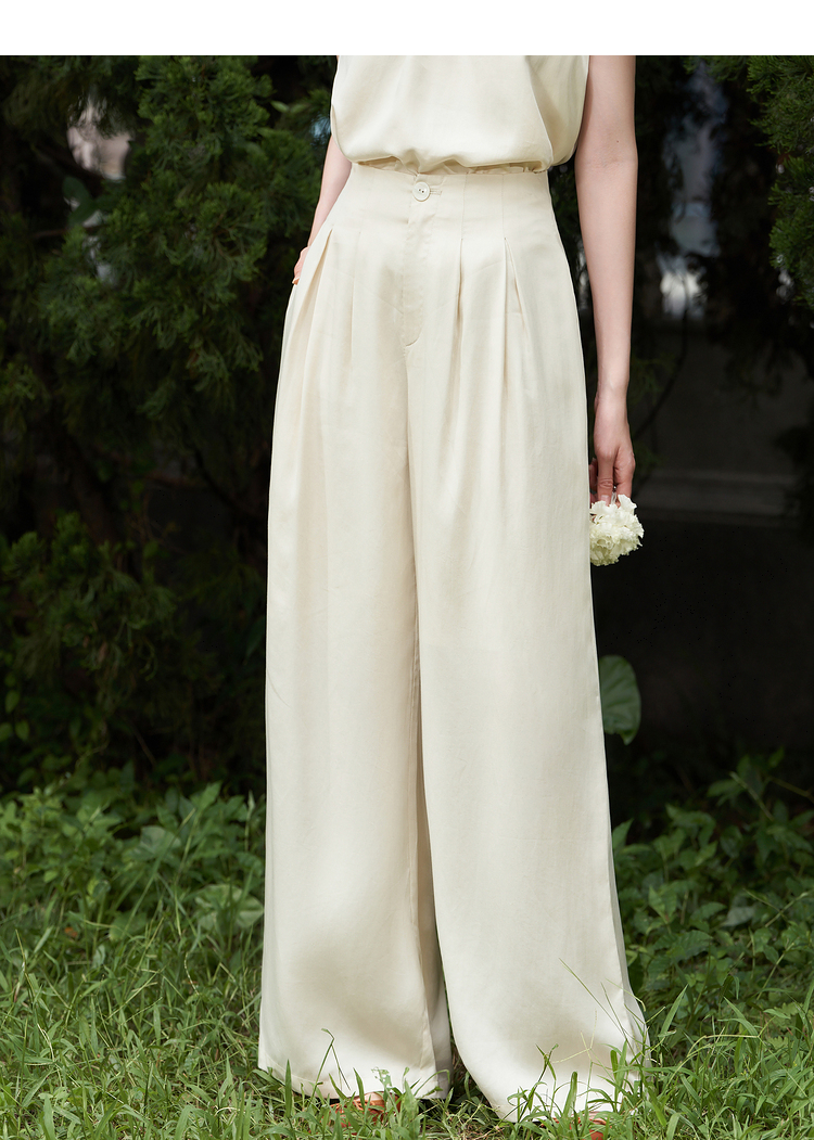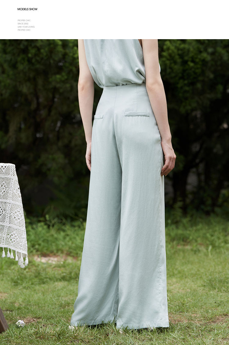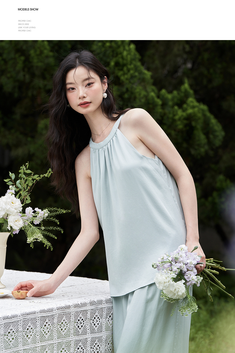 设计简约通勤风两件套女夏圆领挂脖碎褶上衣搭阔腿裤套装V1541335