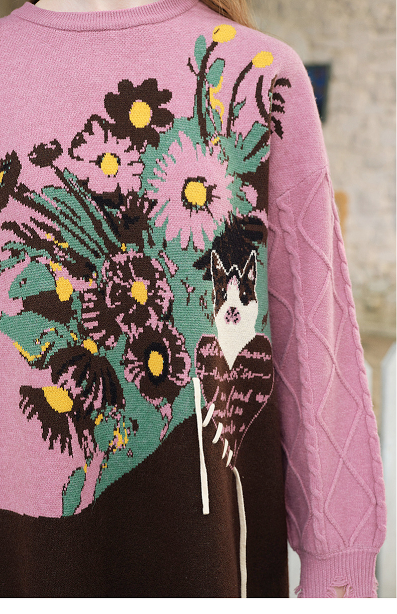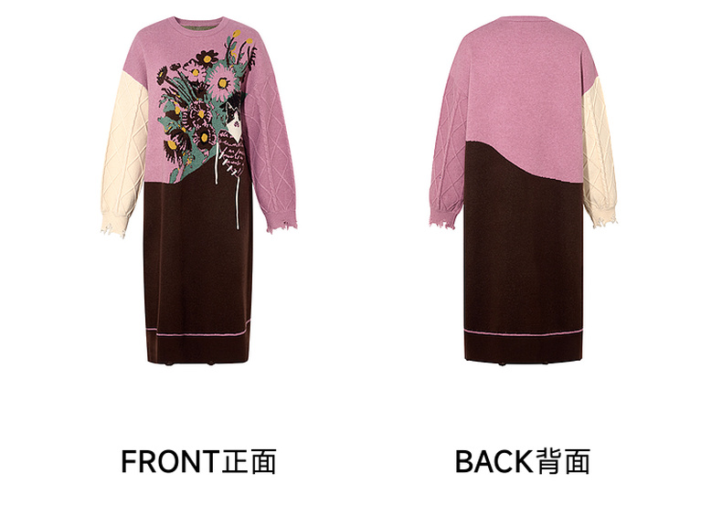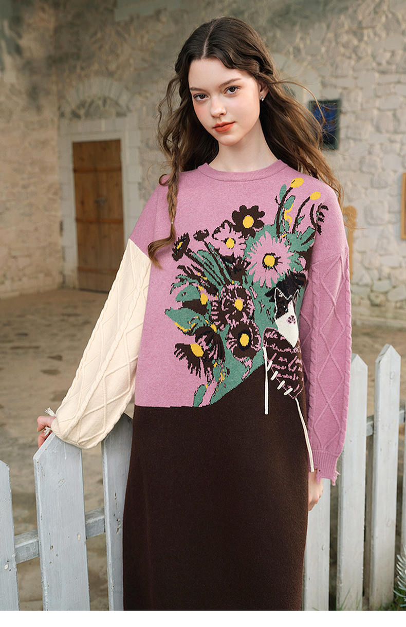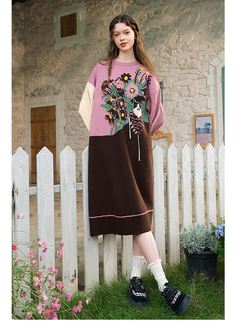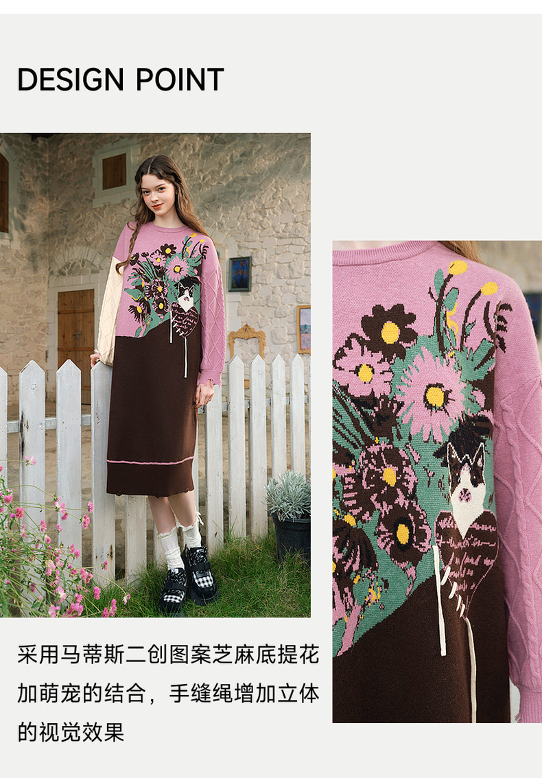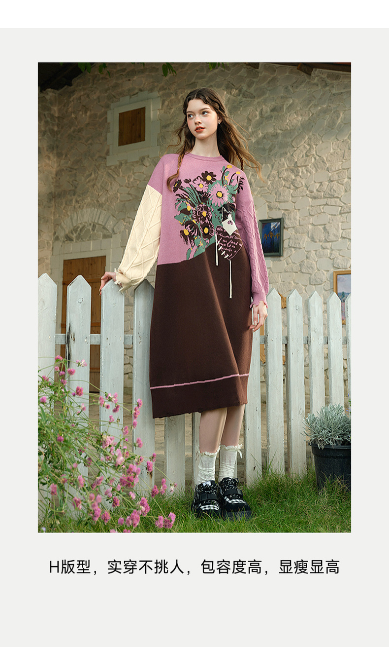 两三事花雨传信2025春新款拼色流苏花卉图案磨破袖口毛衣裙连衣裙