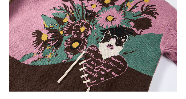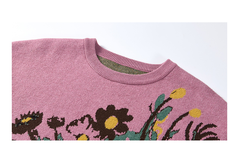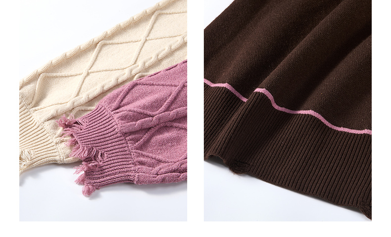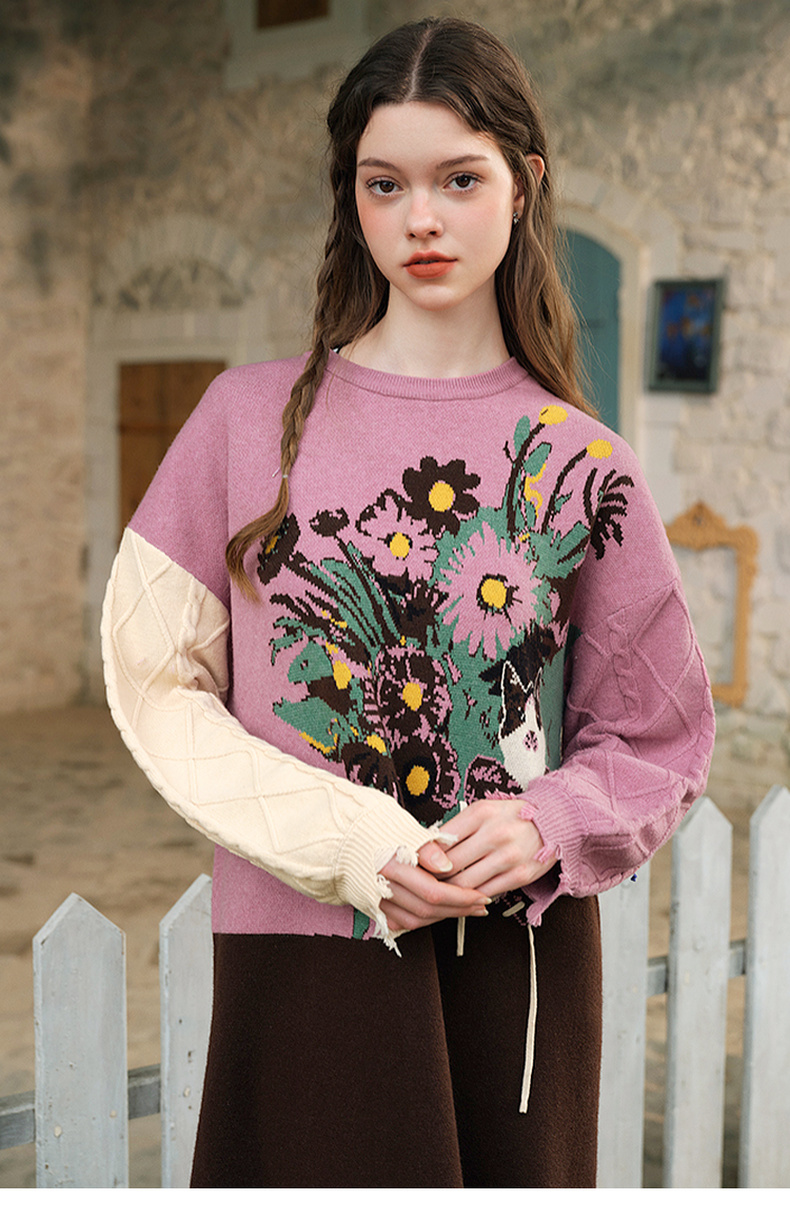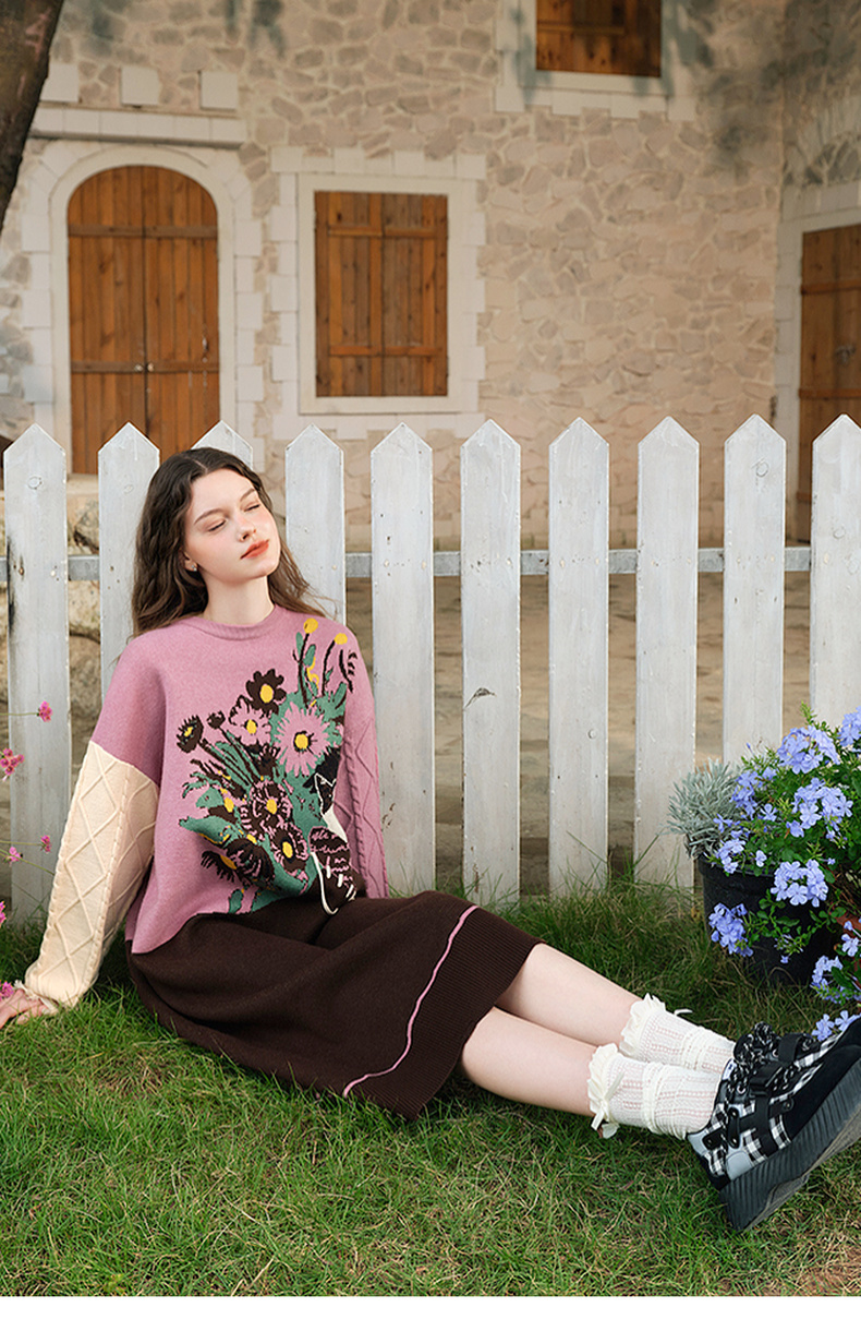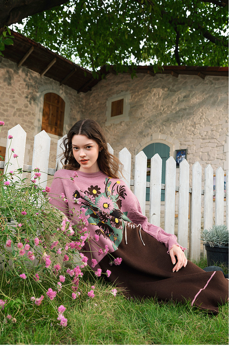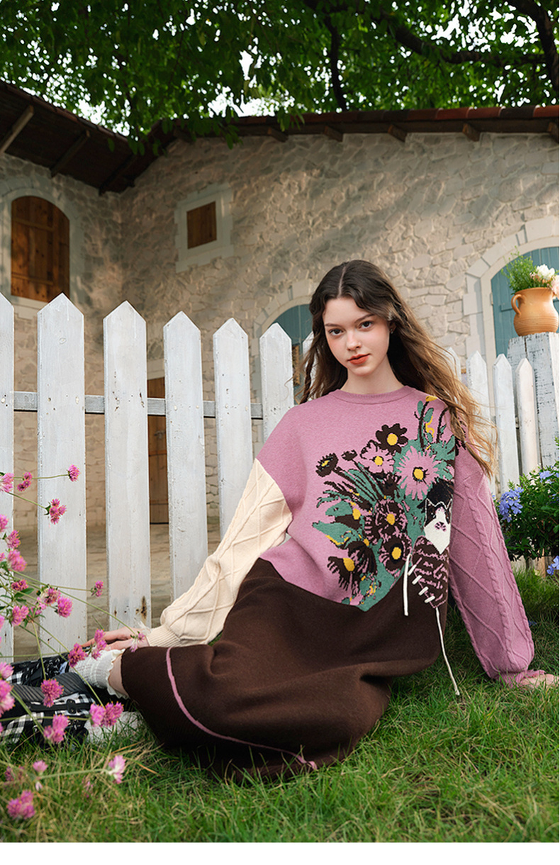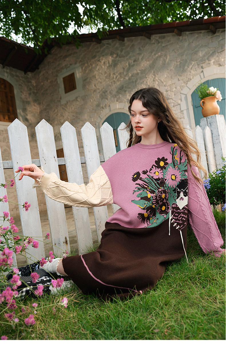 两三事花雨传信2025春新款拼色流苏花卉图案磨破袖口毛衣裙连衣裙