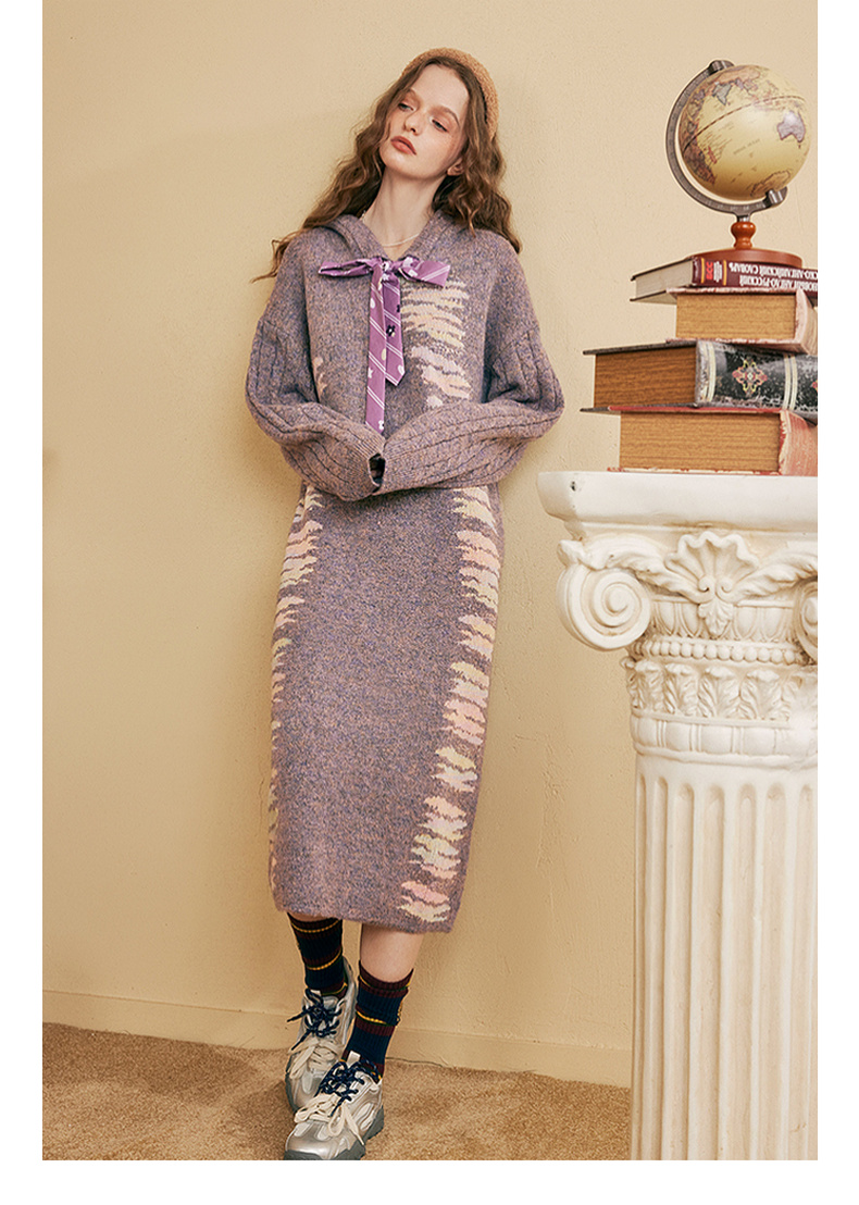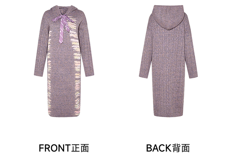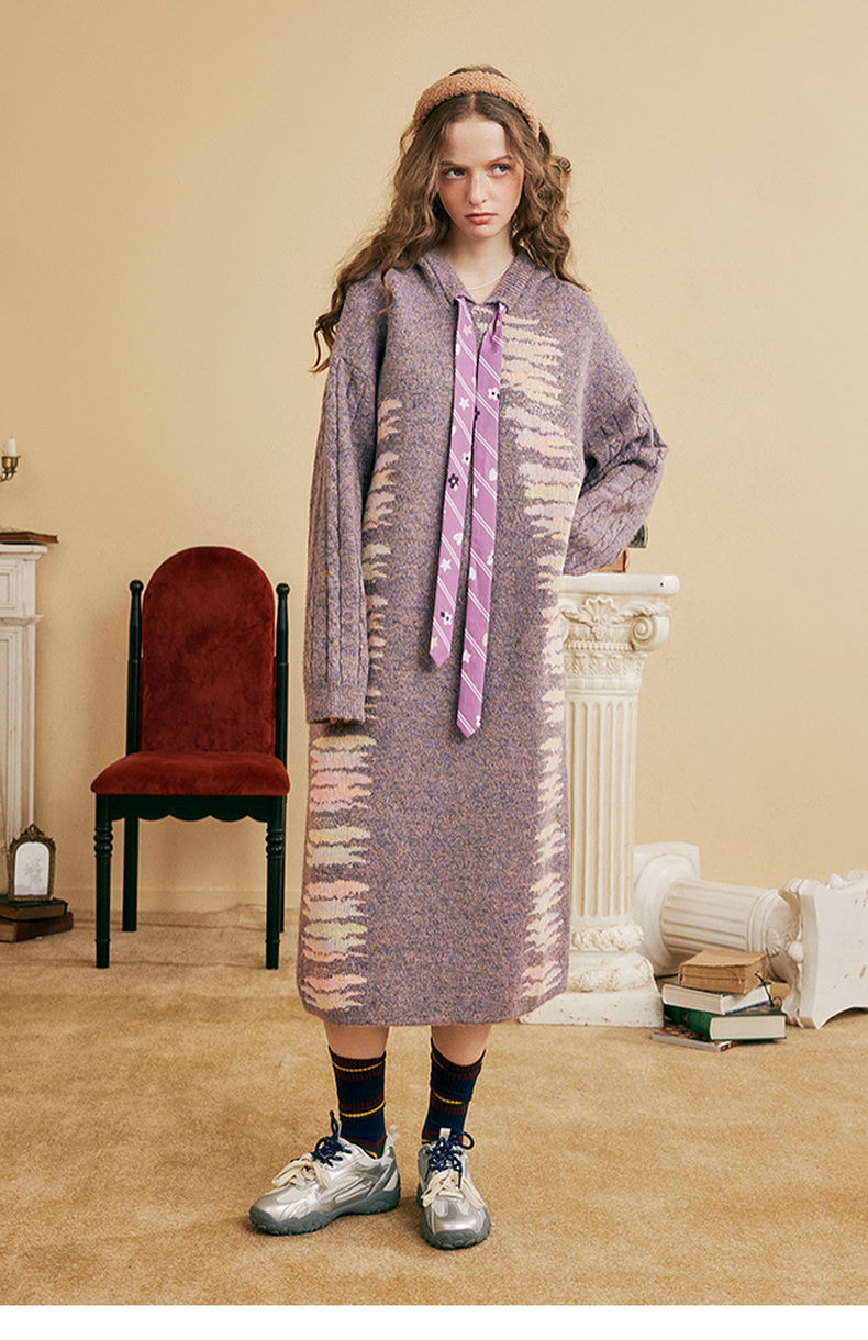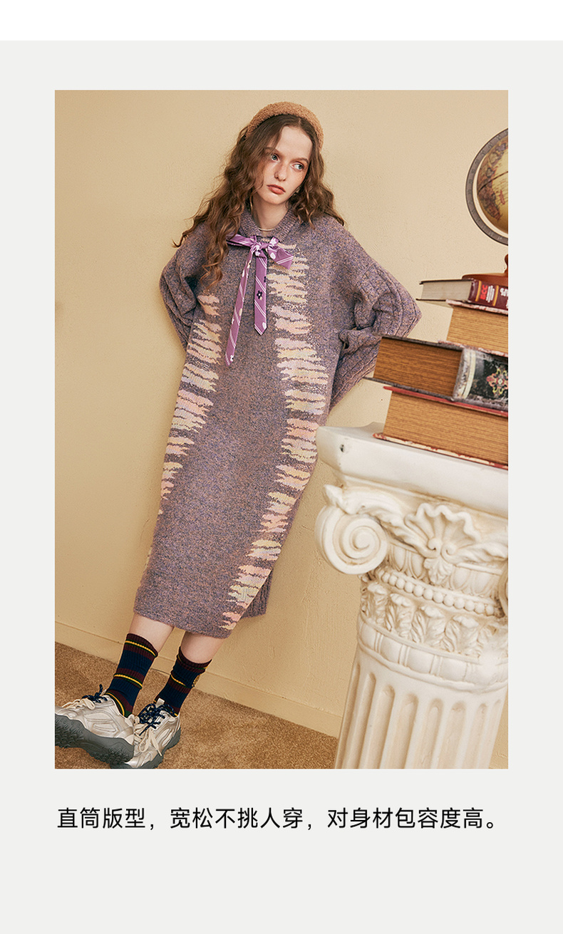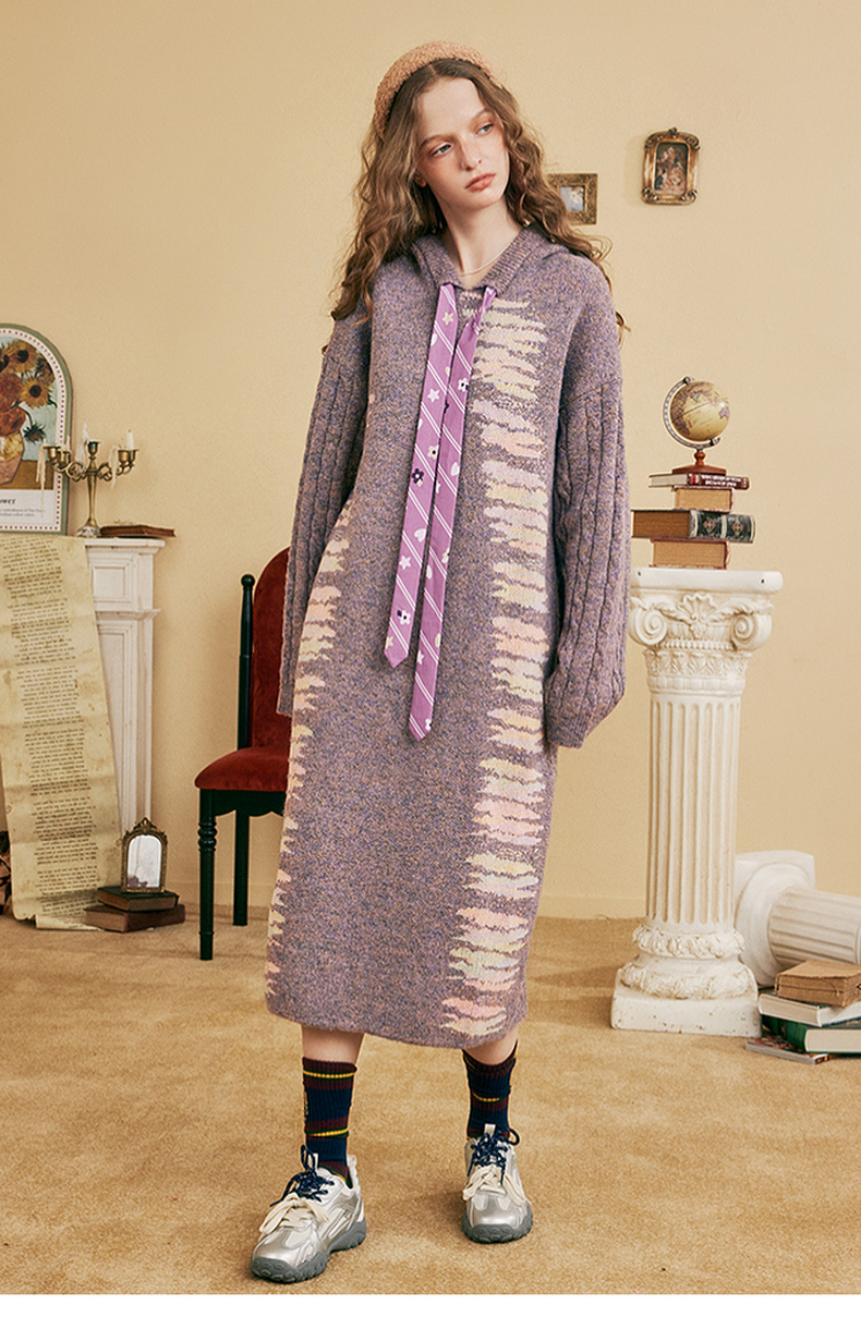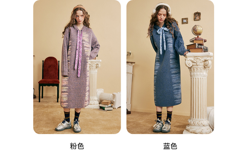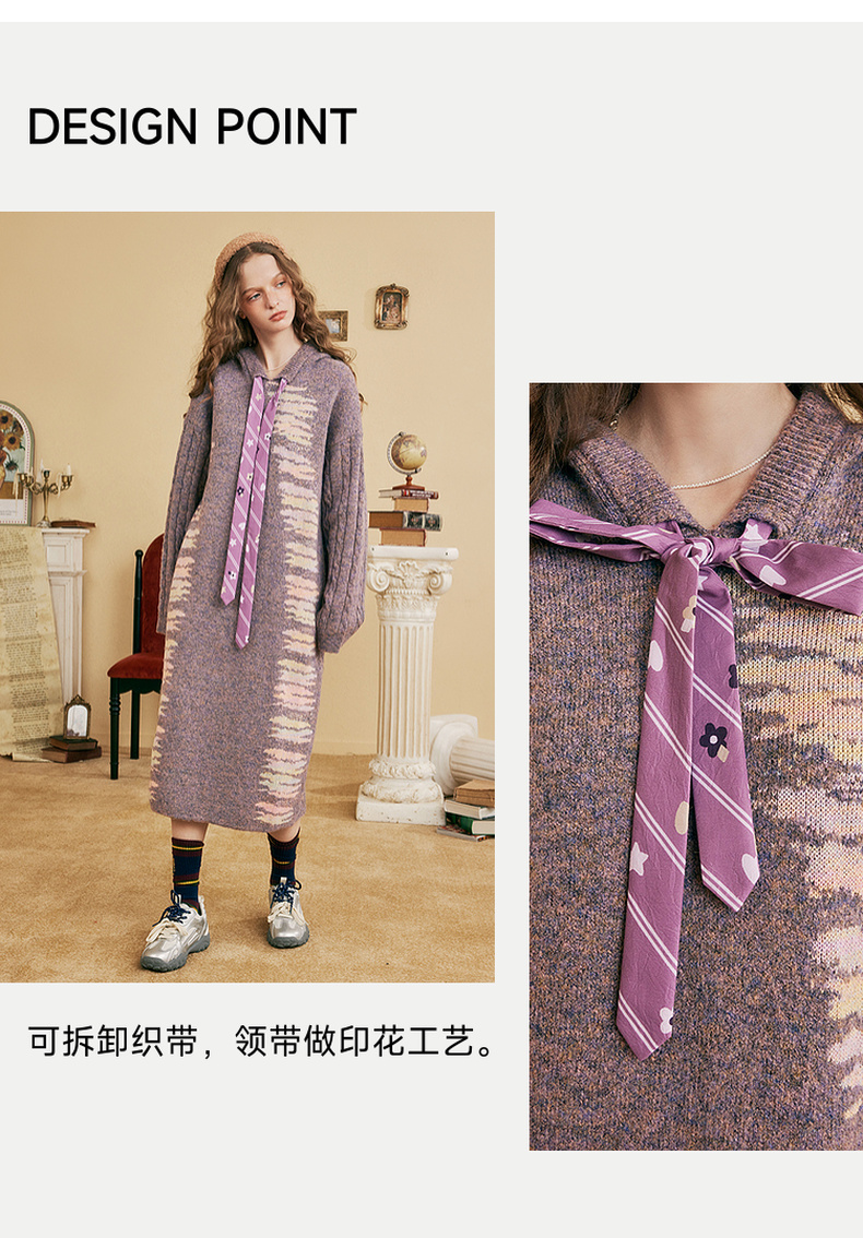 两三事 同频奏鸣 2024秋季新款复古花色绑带连帽针织裙宽松连衣裙