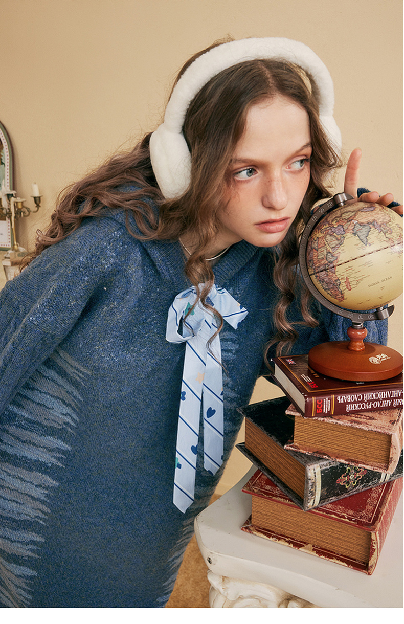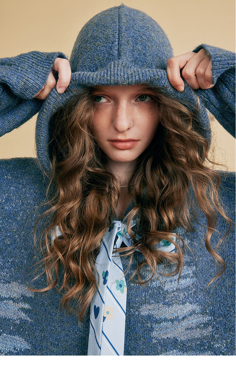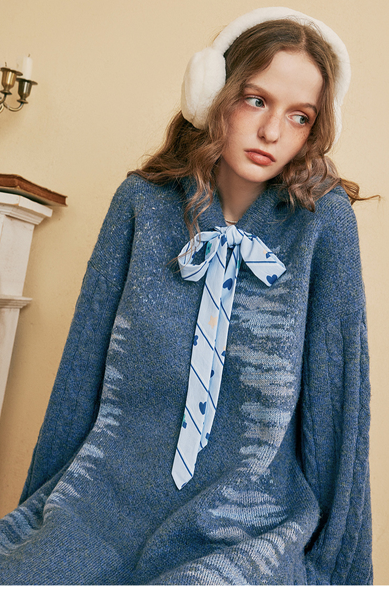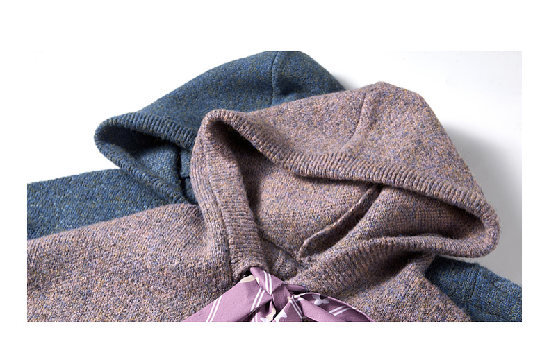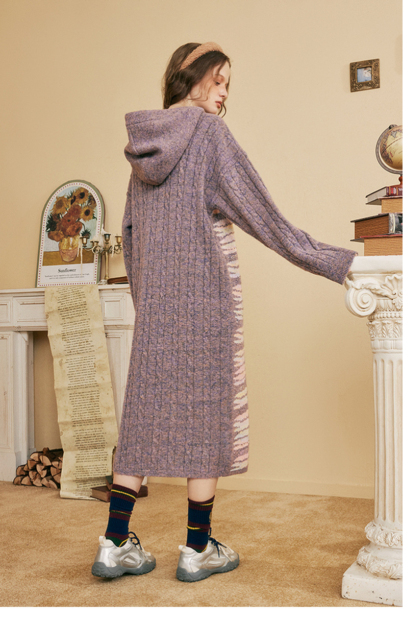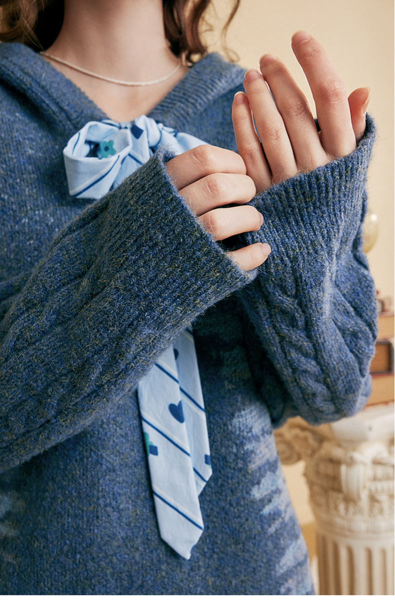两三事 同频奏鸣 2024秋季新款复古花色绑带连帽针织裙宽松连衣裙