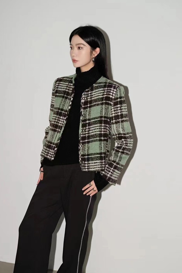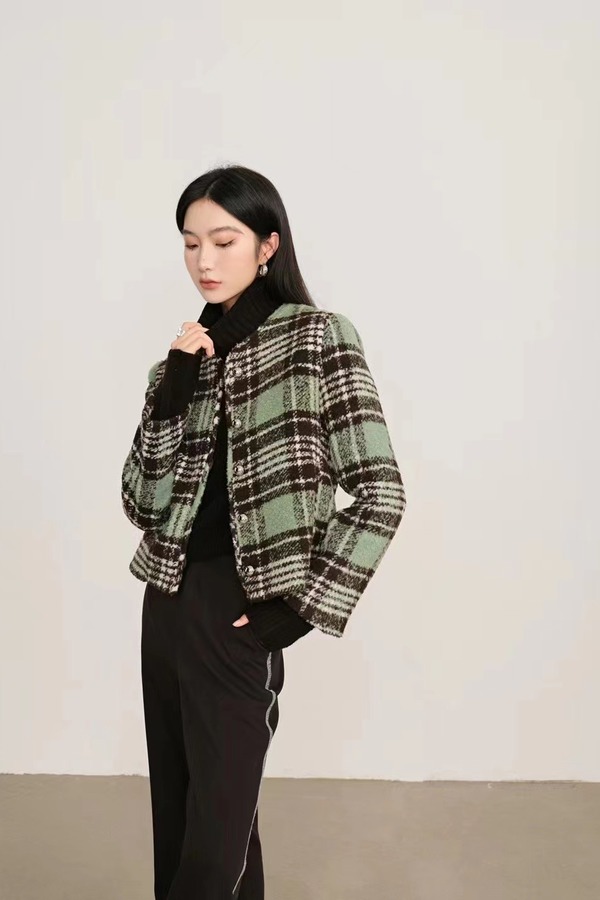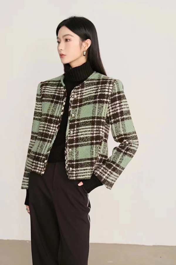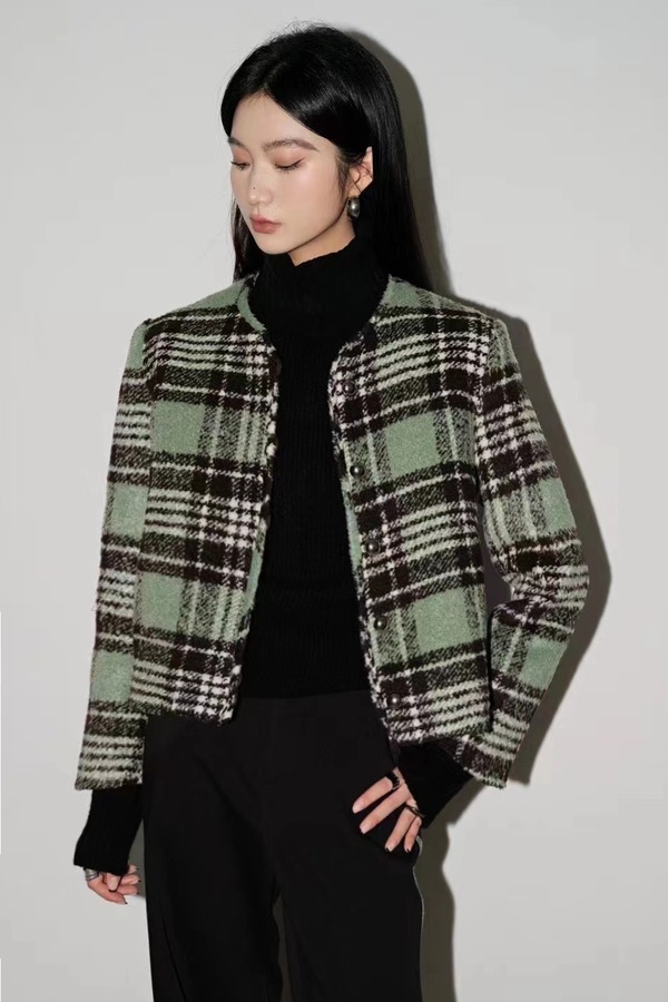 ANSUABEL 绿棕色格纹圆领小香风外套 17721