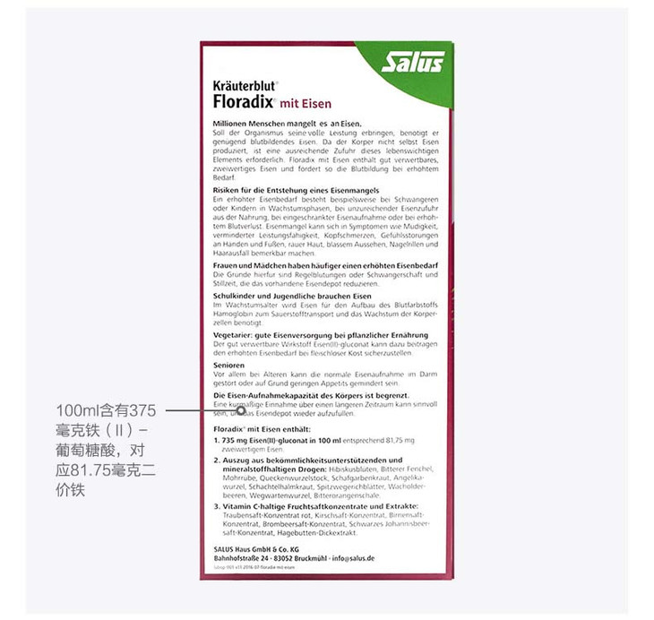 (保税区)德国Salus铁元Floradix salus红版女性孕妇补铁补血口服液 500ml*1瓶
