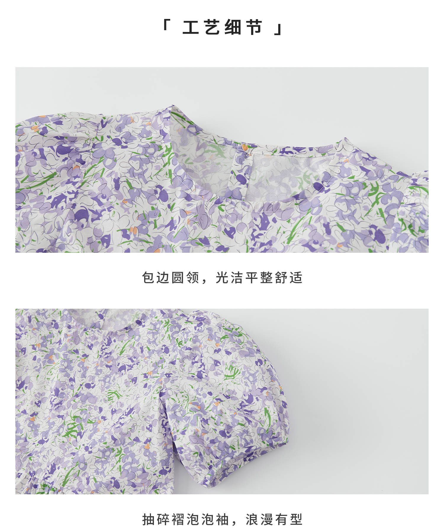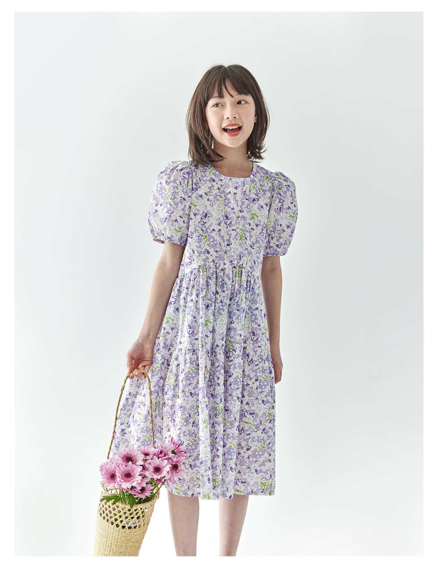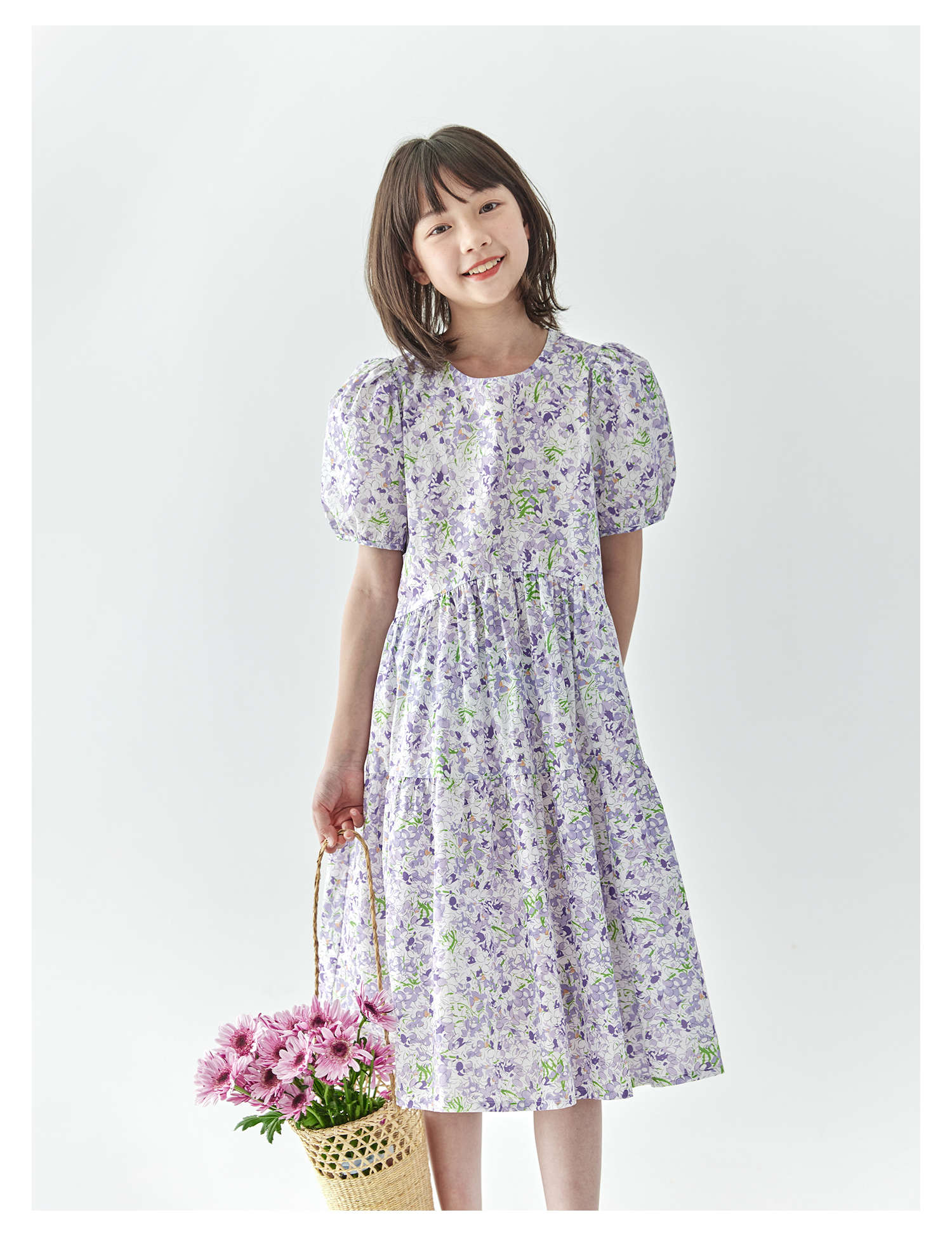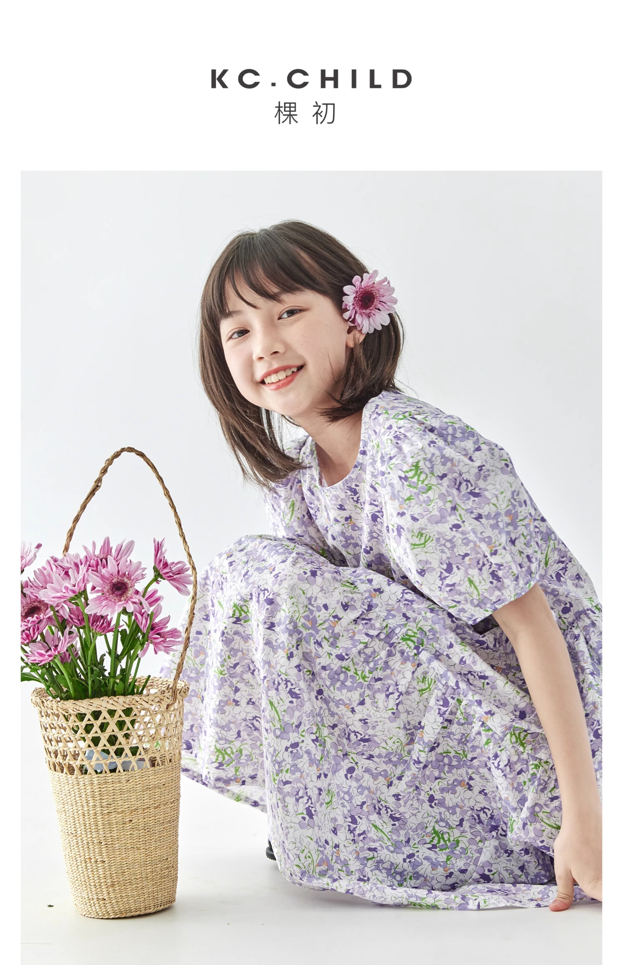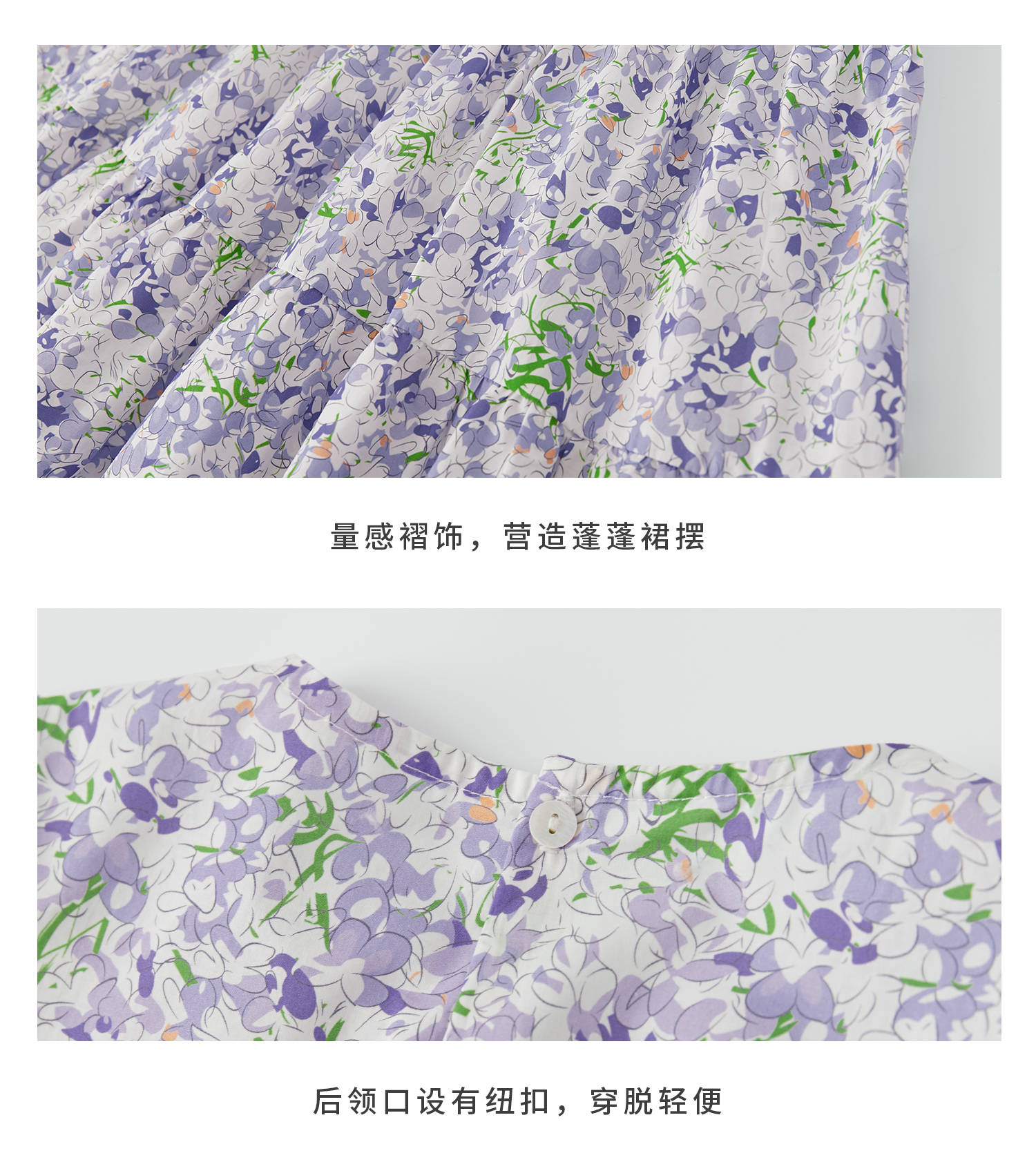 棵初2025夏季新款亲子中大女童碎花连衣裙纯棉紫色蓬蓬裙