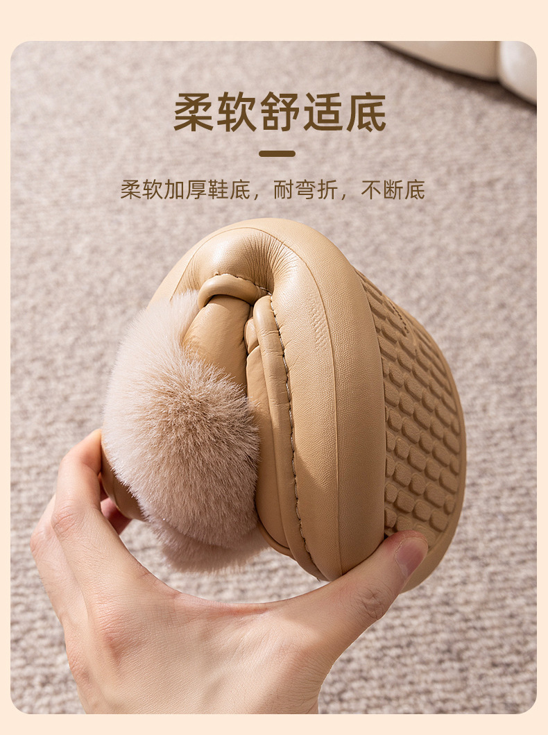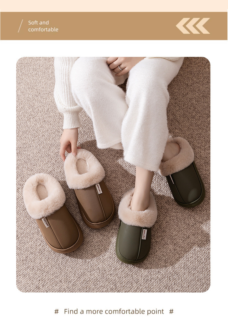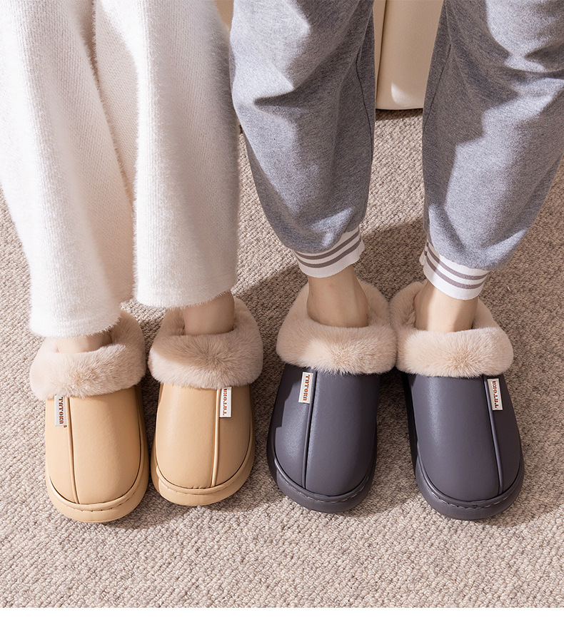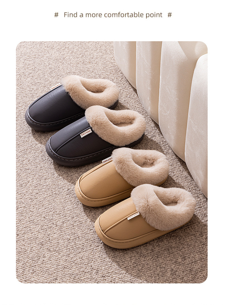 「PU防水鞋面!EVA厚底」2024新款棉拖鞋 女生秋冬季pu皮防水保暖加绒简约情侣居家毛绒拖鞋