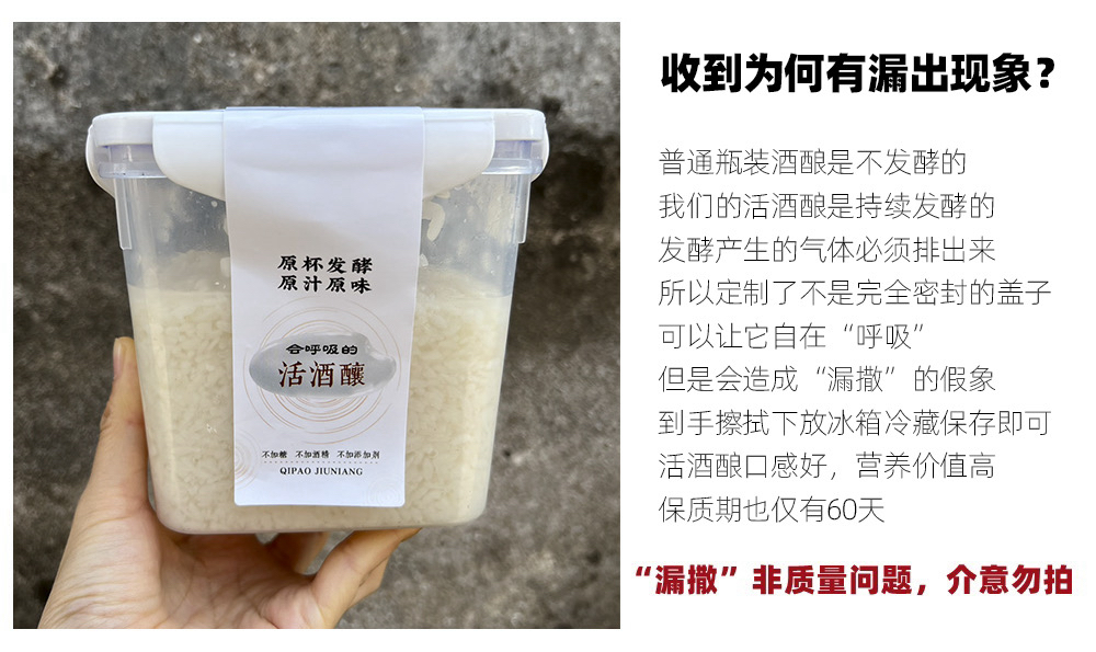 【产品优势】跟市面上大多数酒酿不同,我们的酒酿是非高温灭活,含有活性酵母菌,会吐泡泡,所以我们称它为气泡酒酿,同时保留了更多的营养成分!随着时间的延长,口味也会一点点改变,从刚开始甜滋滋的,到后期酒味会越来越浓,泡泡也越来越多。