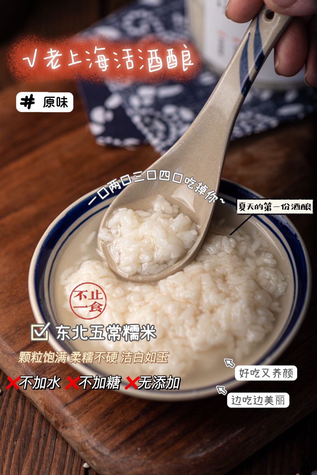 【特色】用的是东北五常糯米,颗粒饱满、柔糯不硬、洁白如玉,没有兑水、兑糖调味,百分百还原手工酒酿的原始滋味。