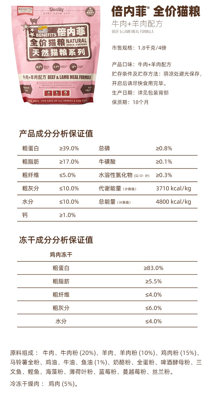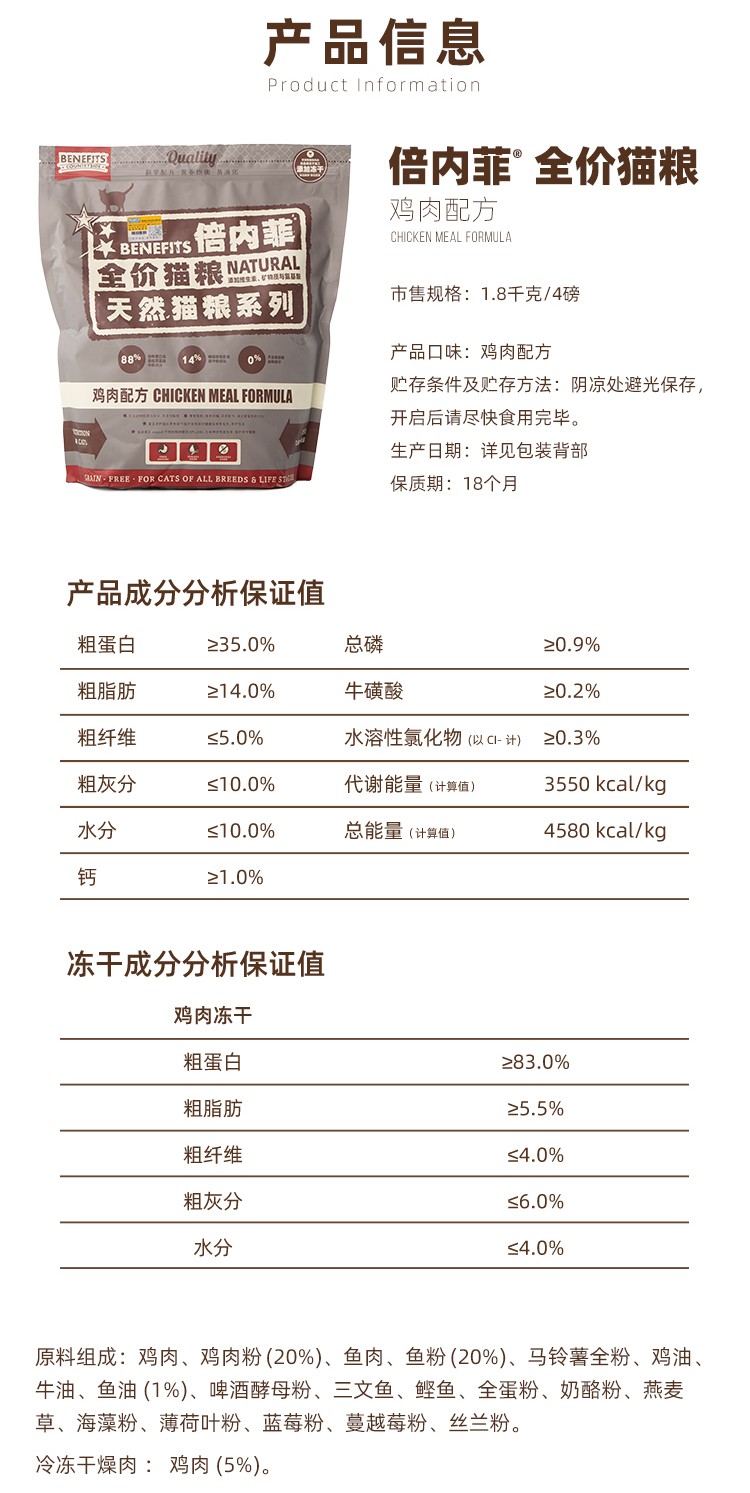 倍内菲无谷冻干猫粮1.8kg 全阶段期猫主粮