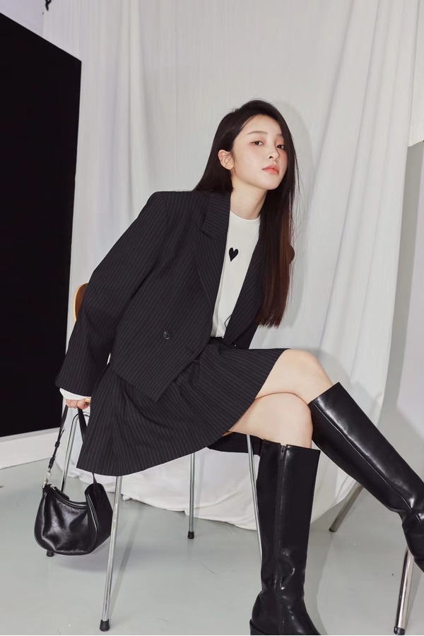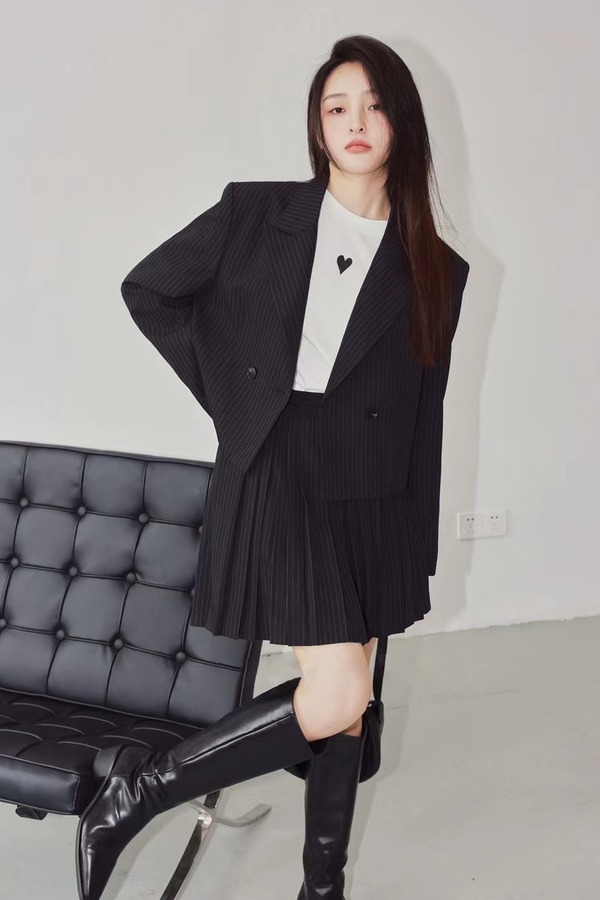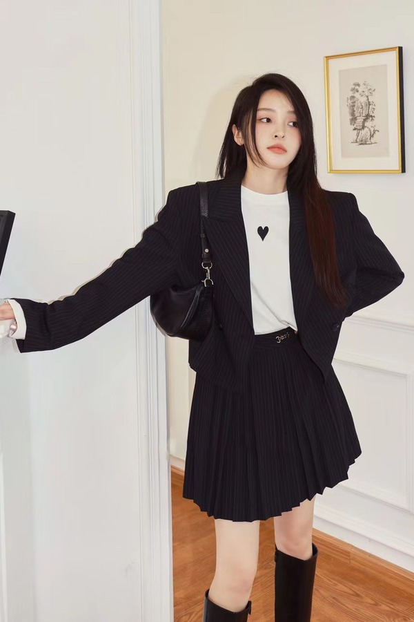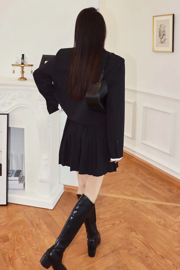 amadella 黑色条纹短款西装百褶裙套装 13820