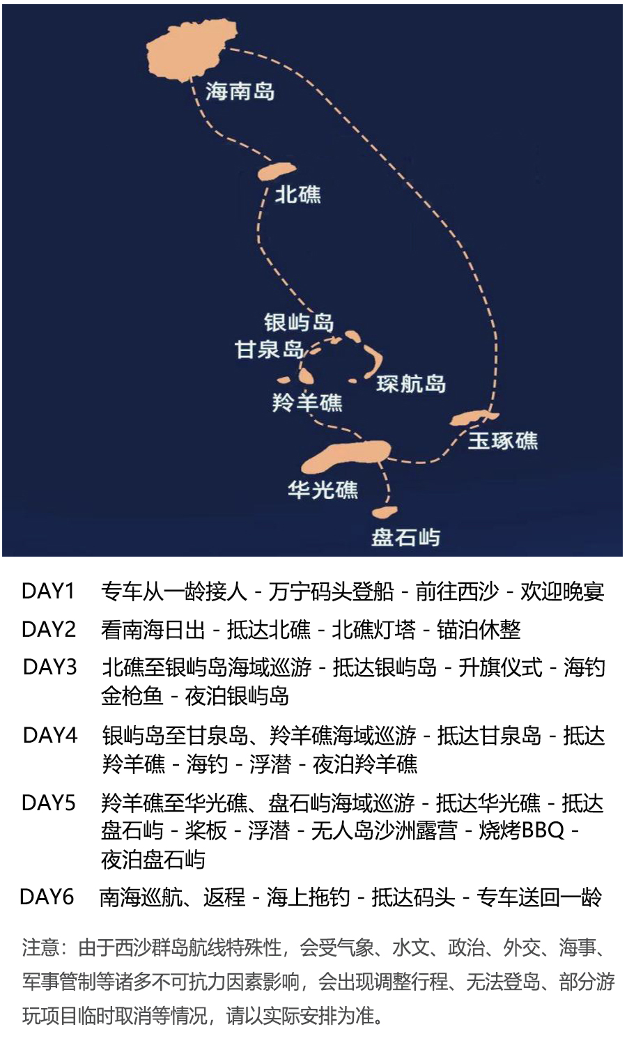 三、由于西沙航线的特殊性,受气象、水文、政治、外交、海事、军事管制、船只故障等诸多不可抗力因素影响巨大,可能会导致改期、调整行程、无法登岛、部分游玩项目临时取消等情况,请配合我们及船长及时调整行程安排,由此产生的额外费用由游客自行承担,我司不承担违约责任。