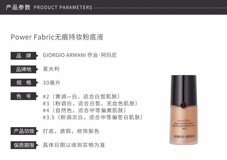 ARMANI阿玛尼 新POWER FABRIC持久零瑕遮瑕清爽权力粉底液 30ml 意大利