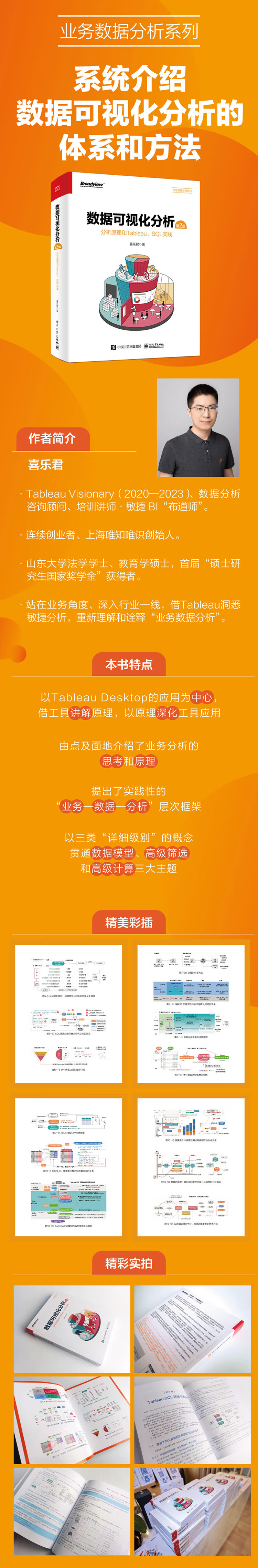 Tableau为基础,部分章节辅以SQL讲解,系统介绍了数据可视化分析的体系和方法,内容涵盖问题分析方法、数据合并和建模、可视化图形的选择和构建、多种交互方式及其组合、仪表板设计与*级交互、基本计算和*级计算等