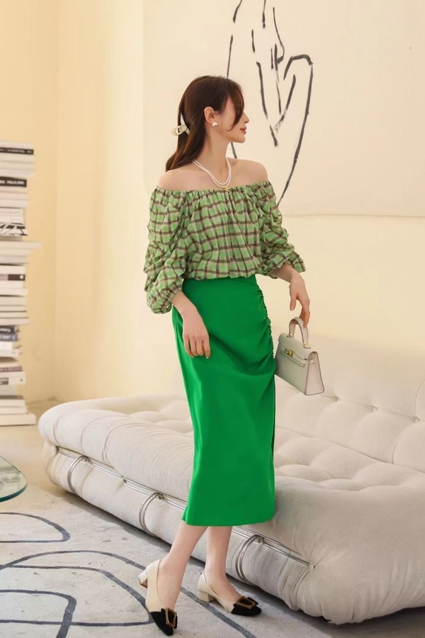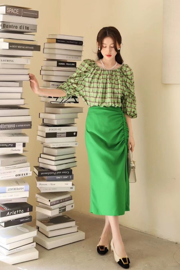 ANSUABEL 缎面抽褶亮绿色半裙 18465