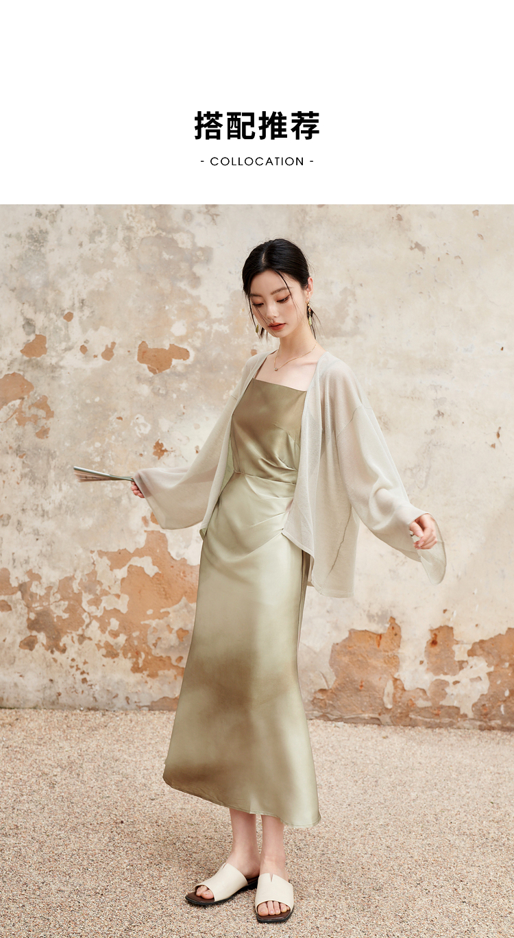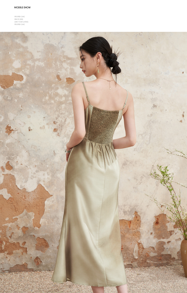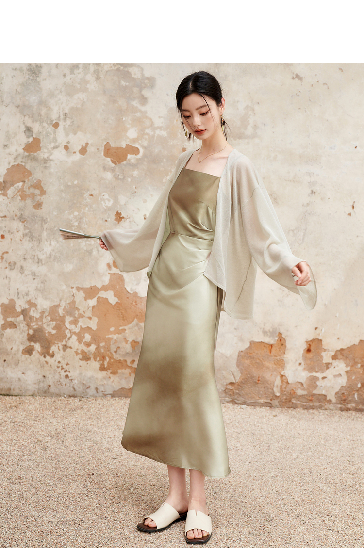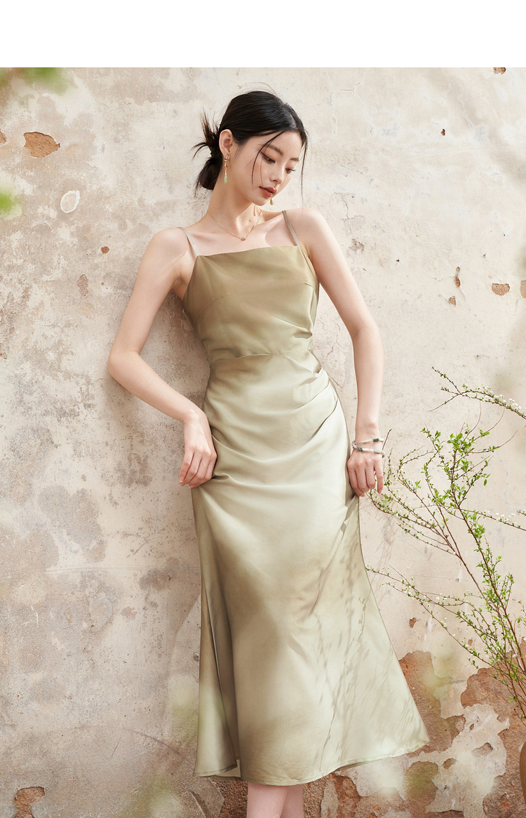 简约设计感缎面吊带裙女夏季国风晕染平领聚褶收腰连衣裙V1341040