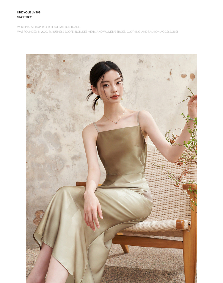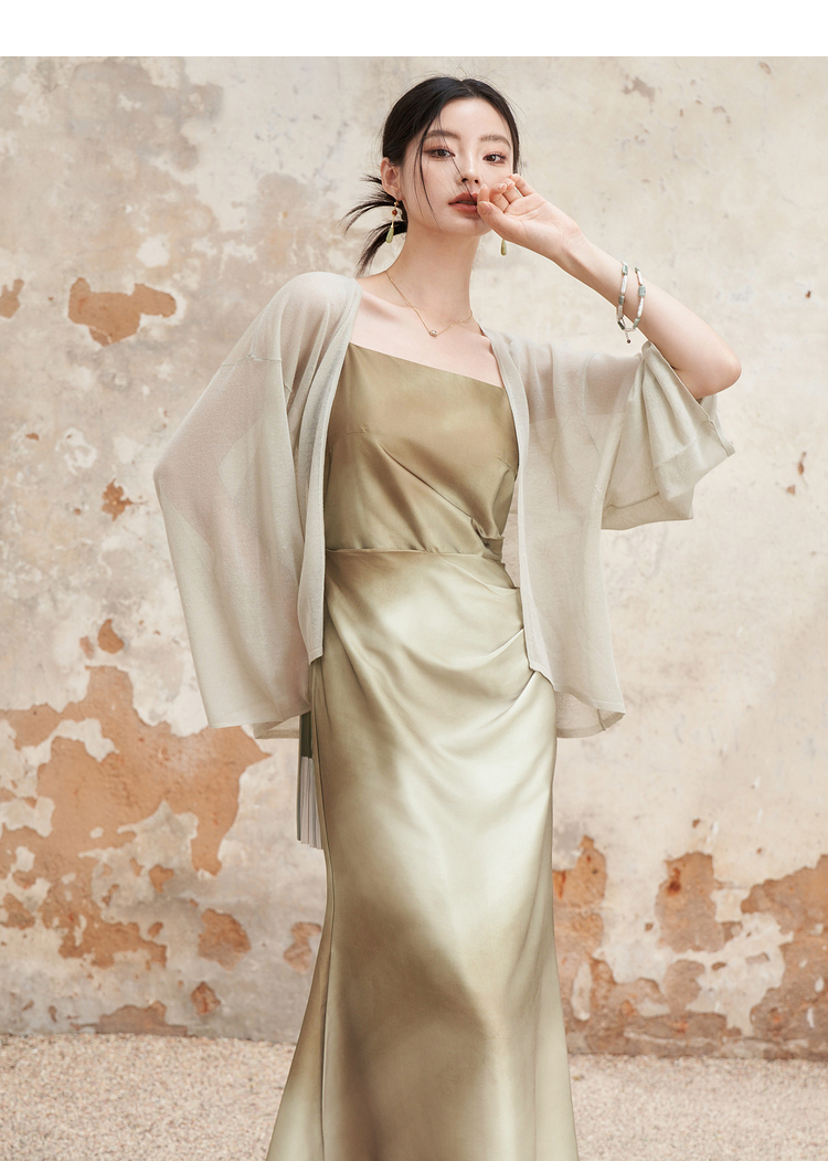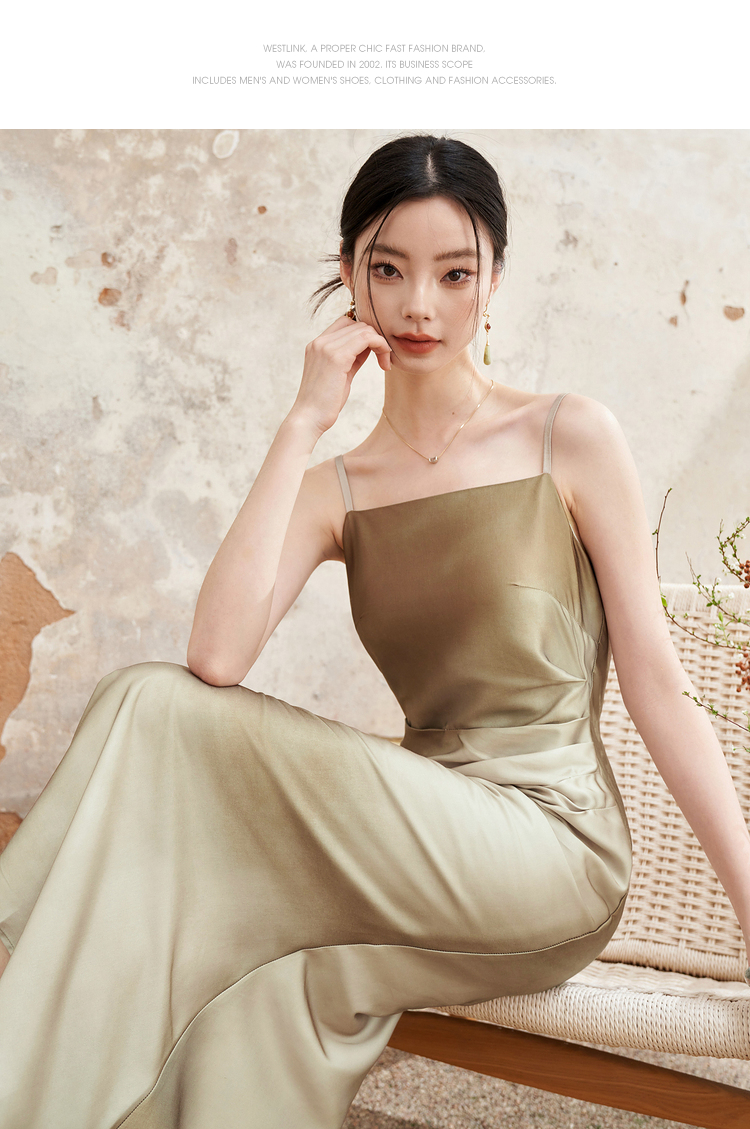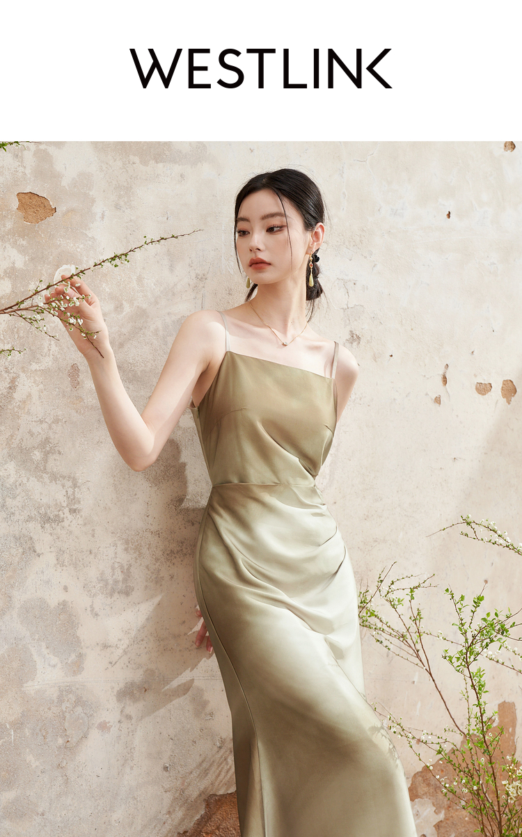 简约设计感缎面吊带裙女夏季国风晕染平领聚褶收腰连衣裙V1341040
