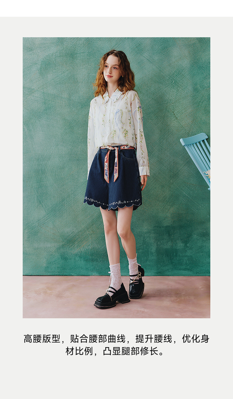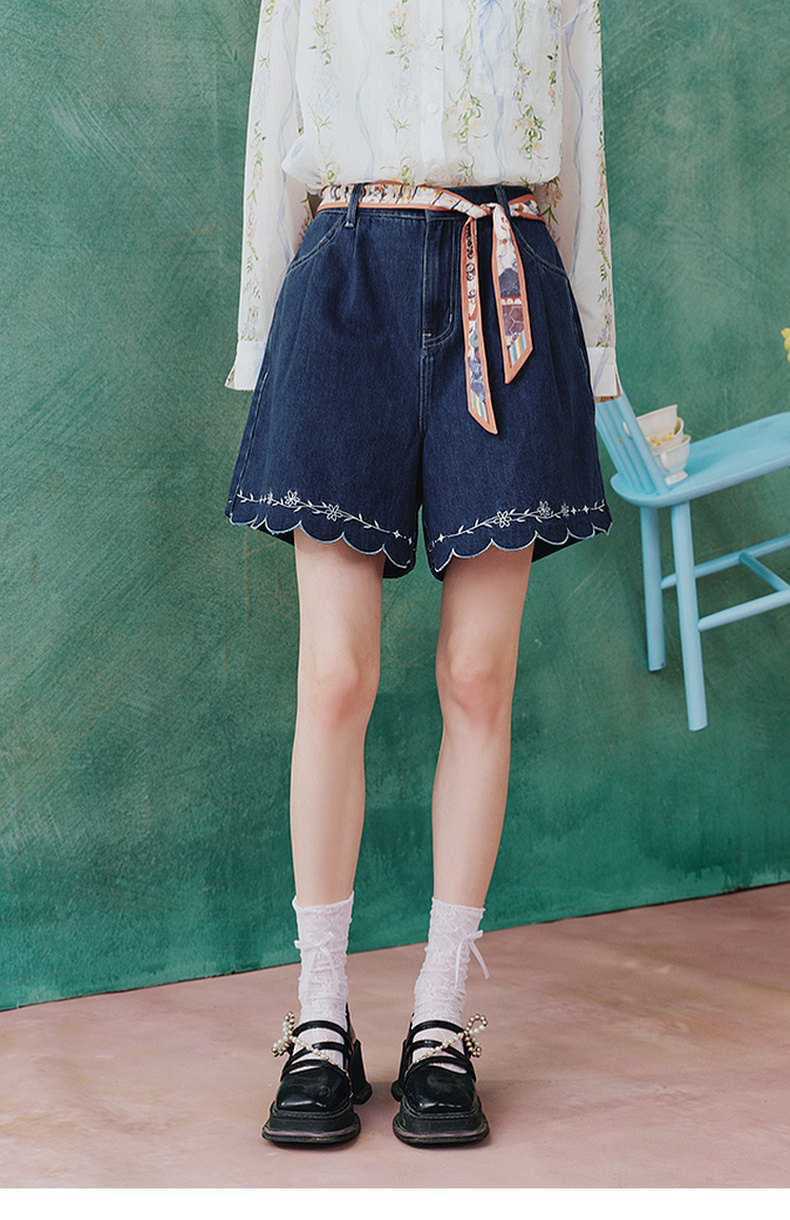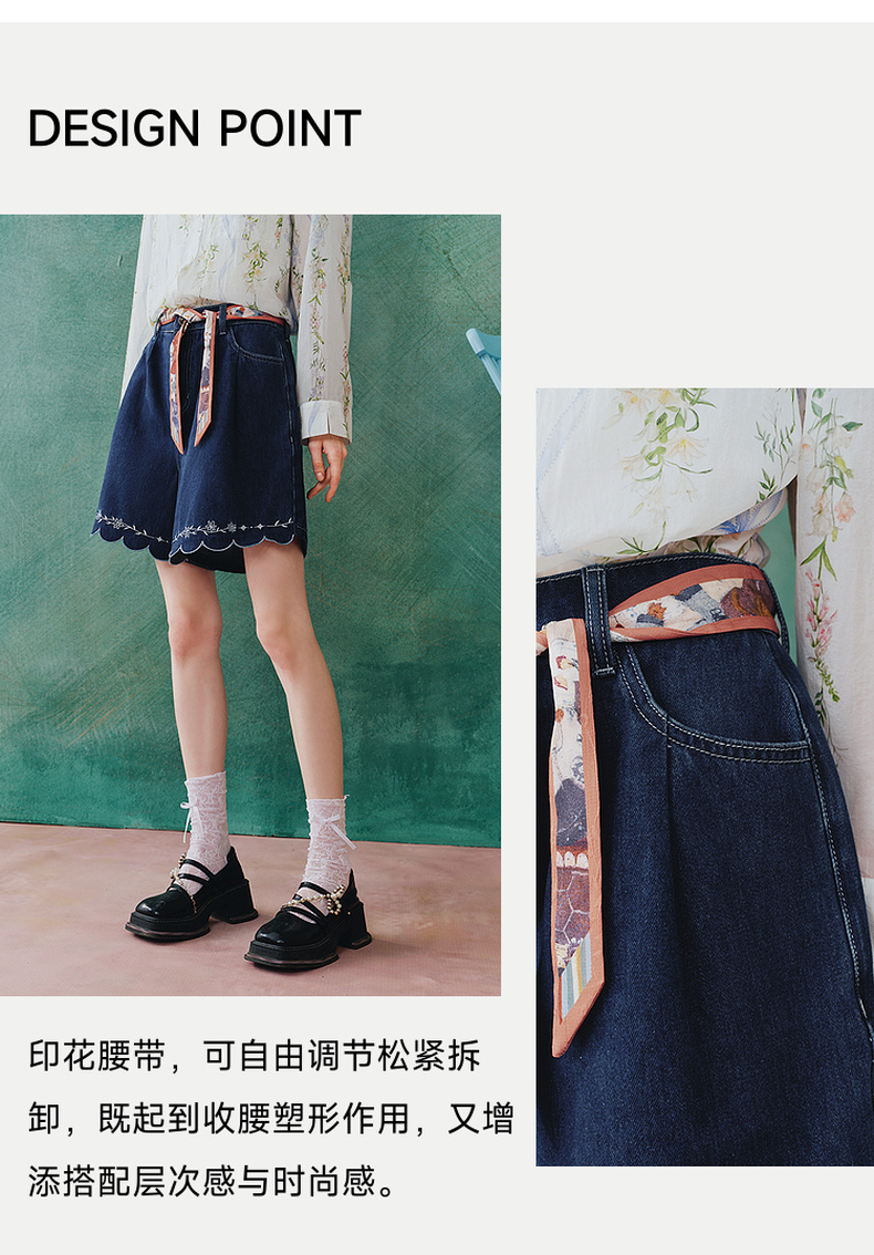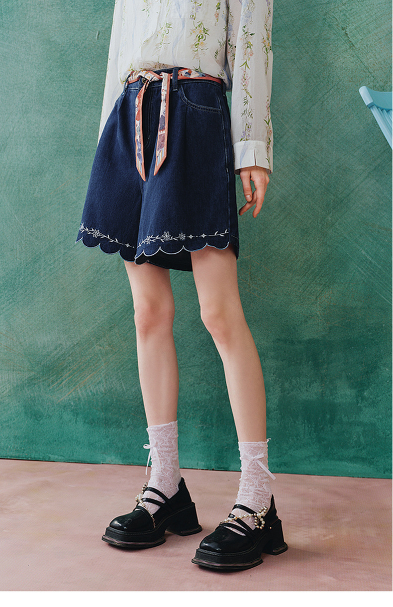 两三事 萤火岛屿 2025夏季新款休闲绣花波浪边裤脚绑带牛仔裤女