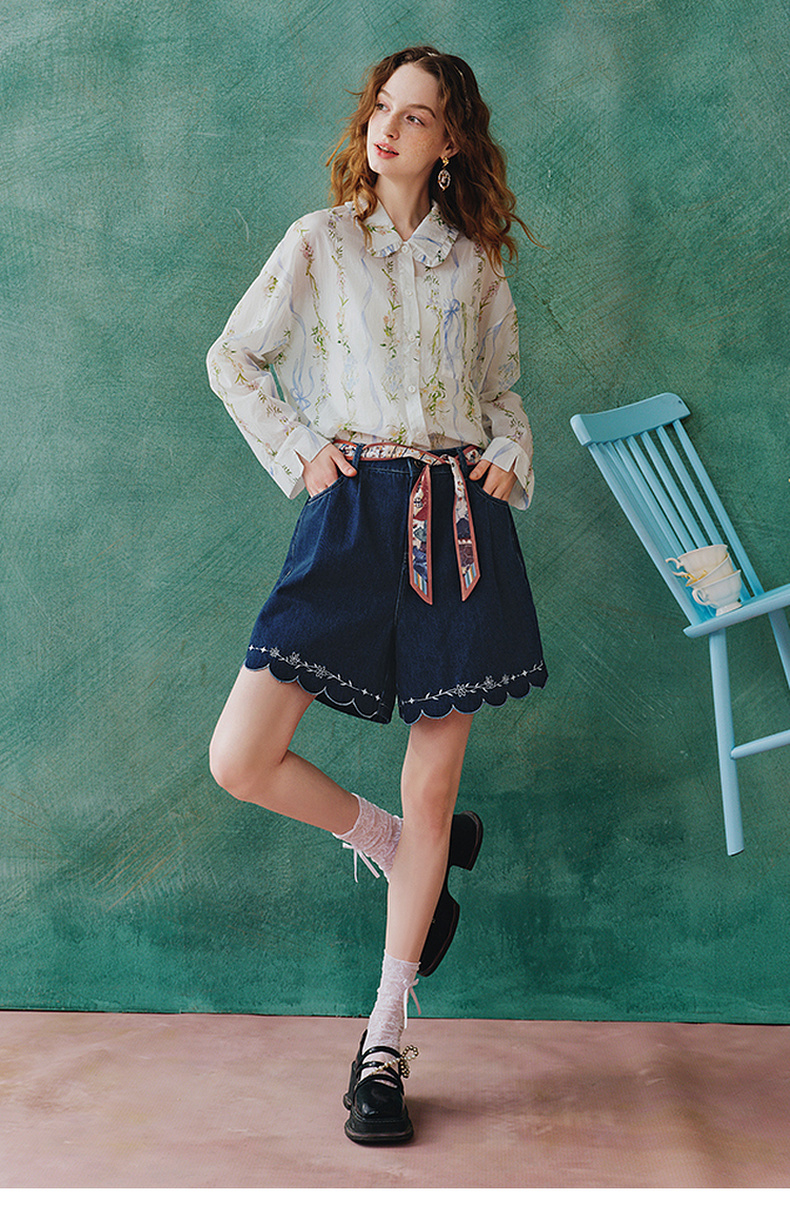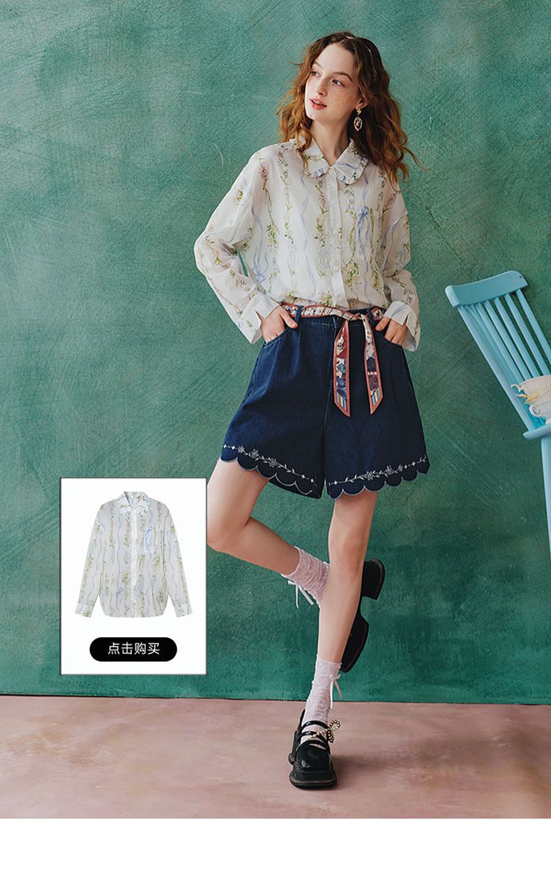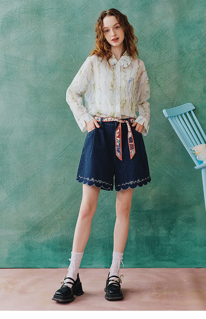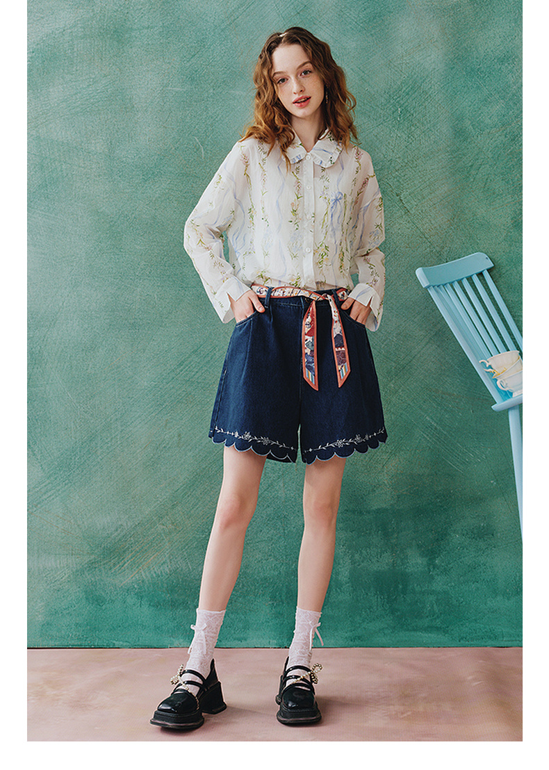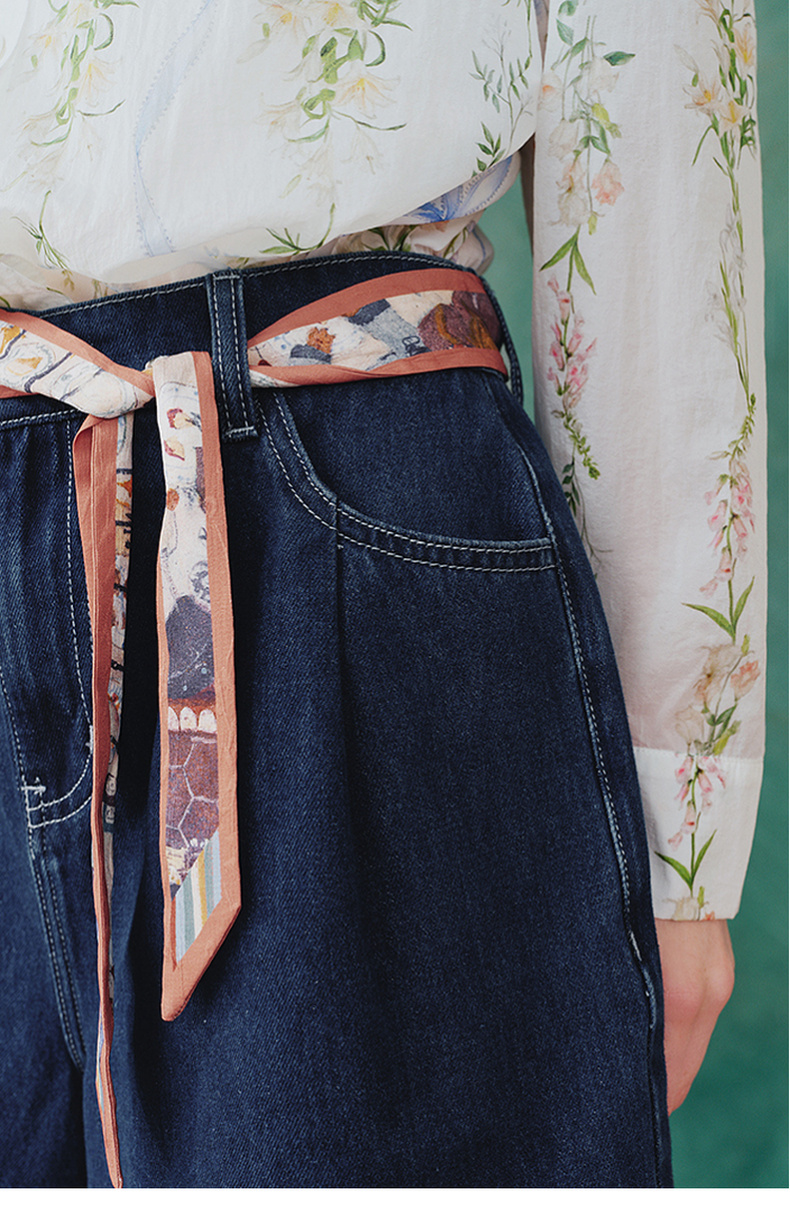 两三事 萤火岛屿 2025夏季新款休闲绣花波浪边裤脚绑带牛仔裤女