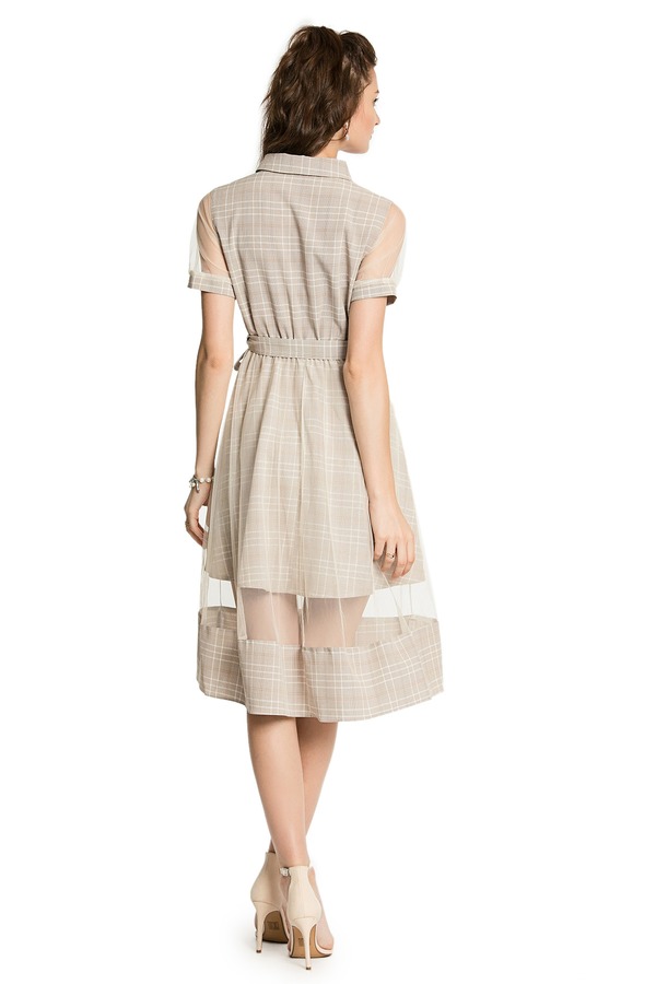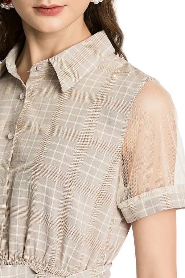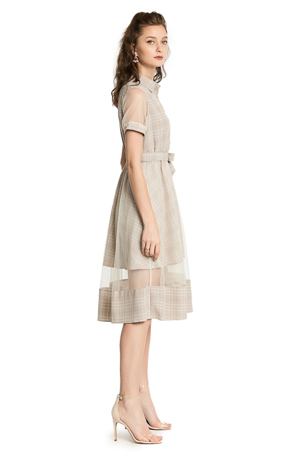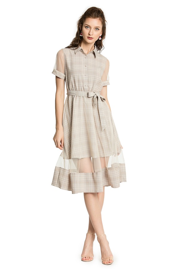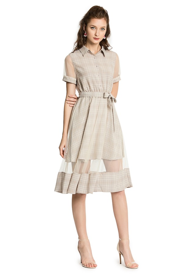 ZVY 杏色网格拼接连衣裙 2918