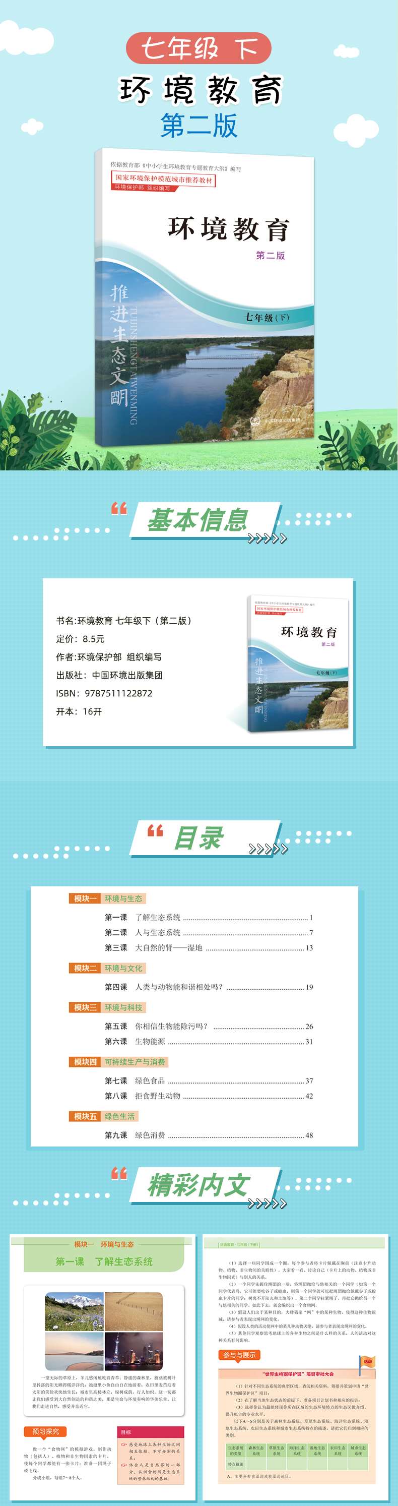 环境教育 第二版 七年级下 环保模范城市教材 环境科普读物 环境保护 中国环境出版社 9787511122872