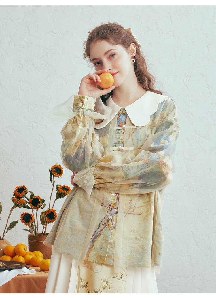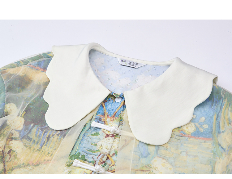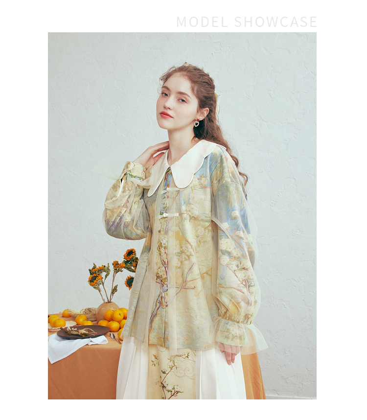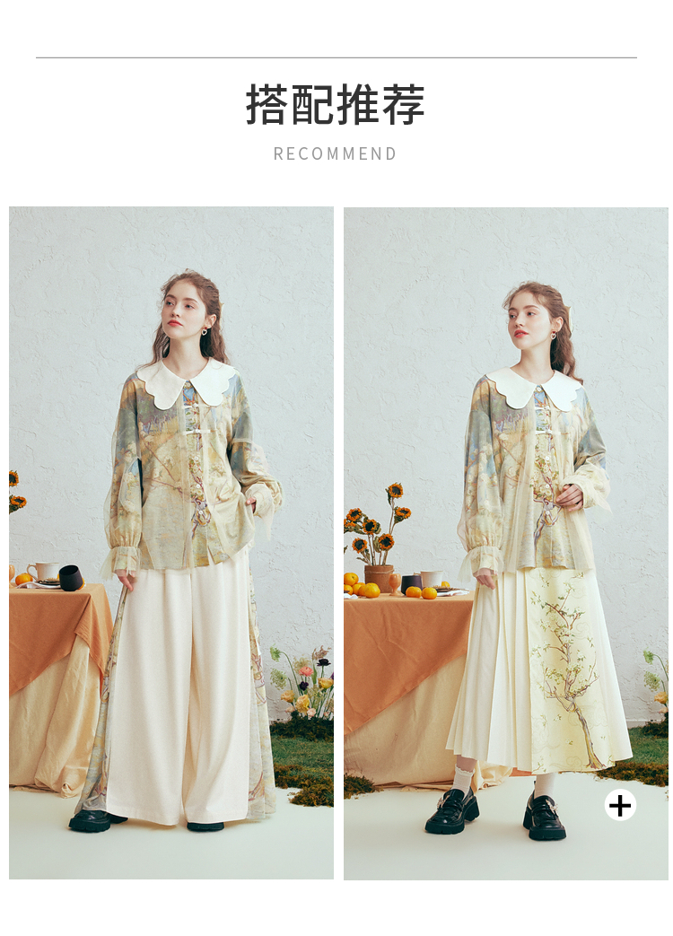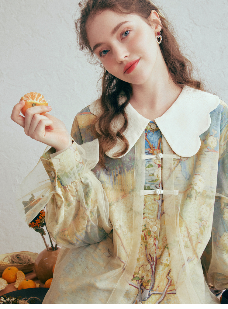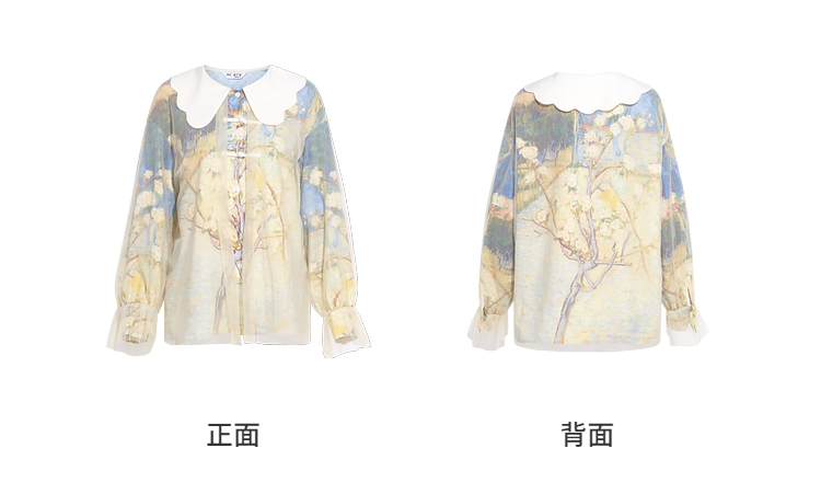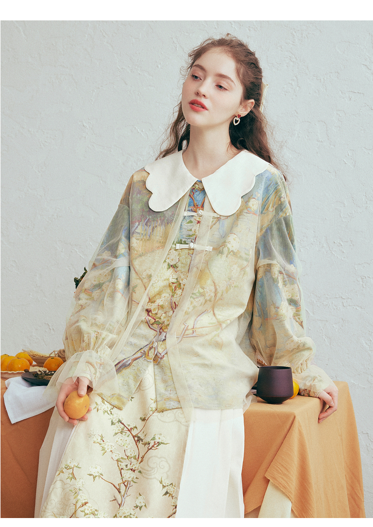 两三事梵高文艺 素雾缠枝 2026春季新款甜美娃娃领印花盘扣衬衫女