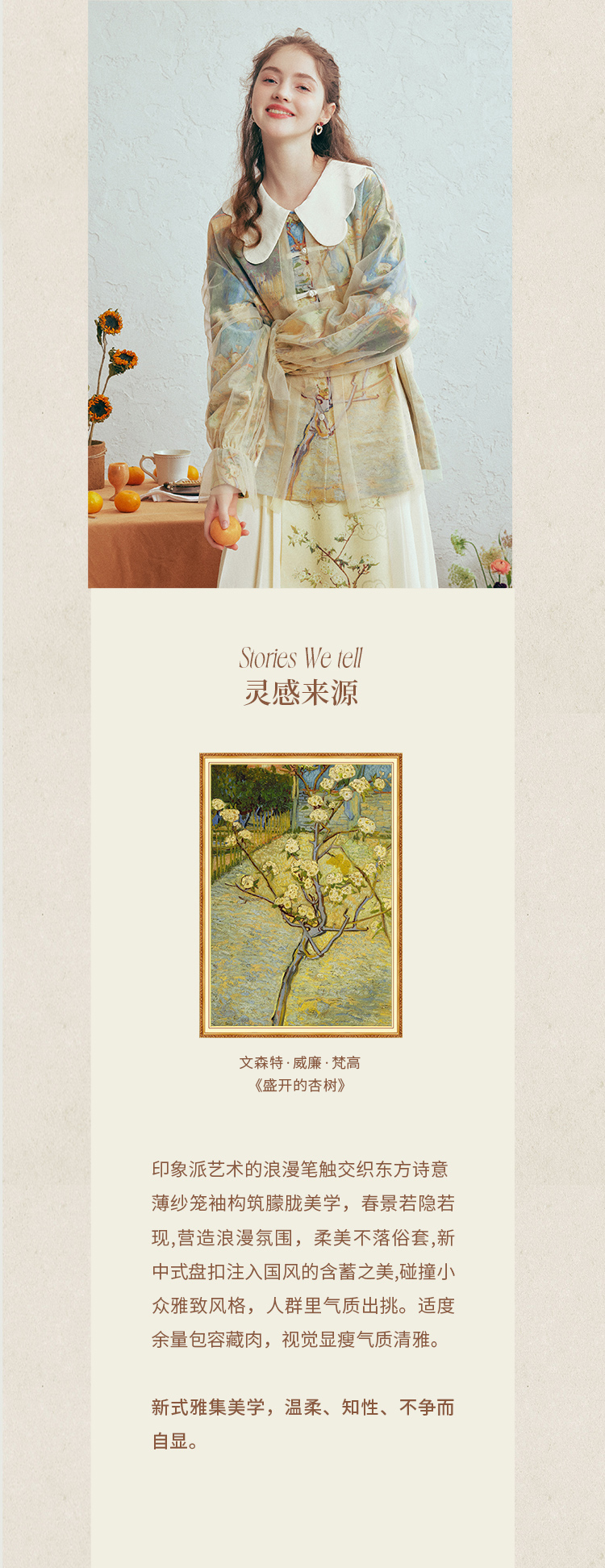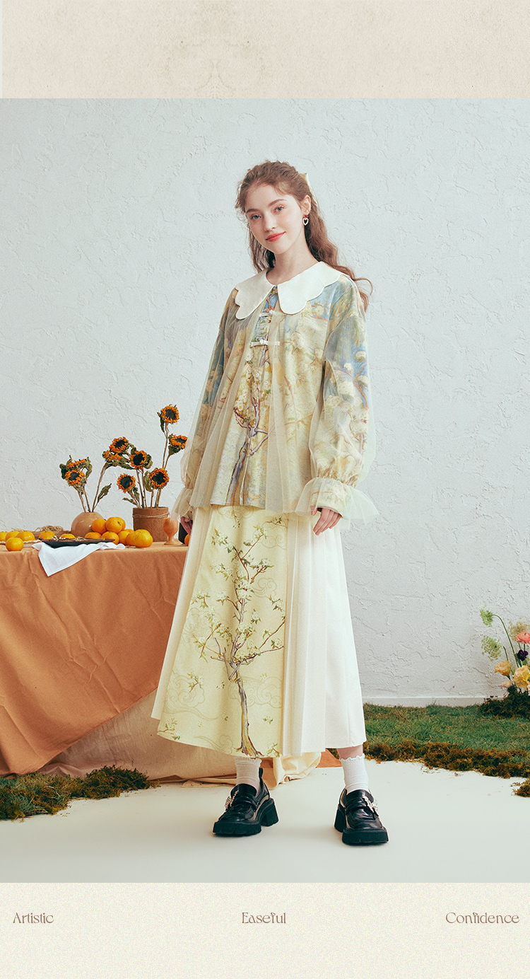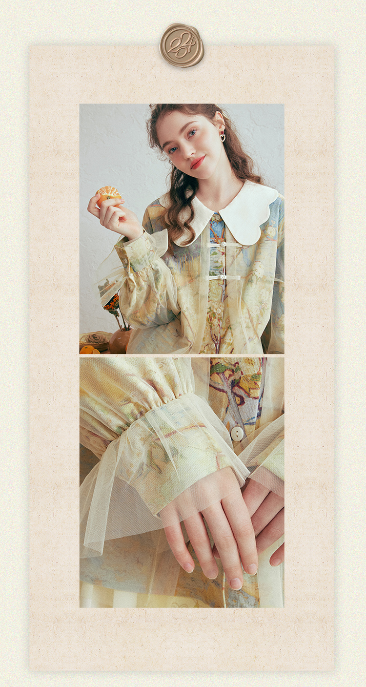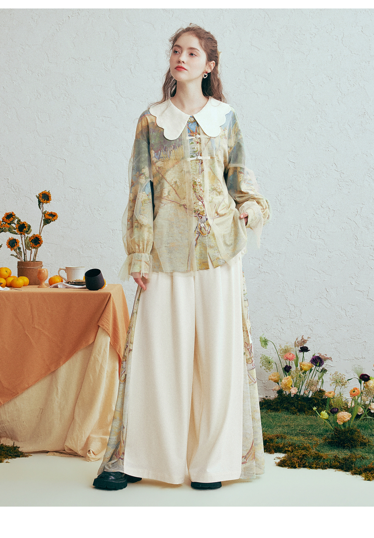 两三事梵高文艺 素雾缠枝 2026春季新款甜美娃娃领印花盘扣衬衫女