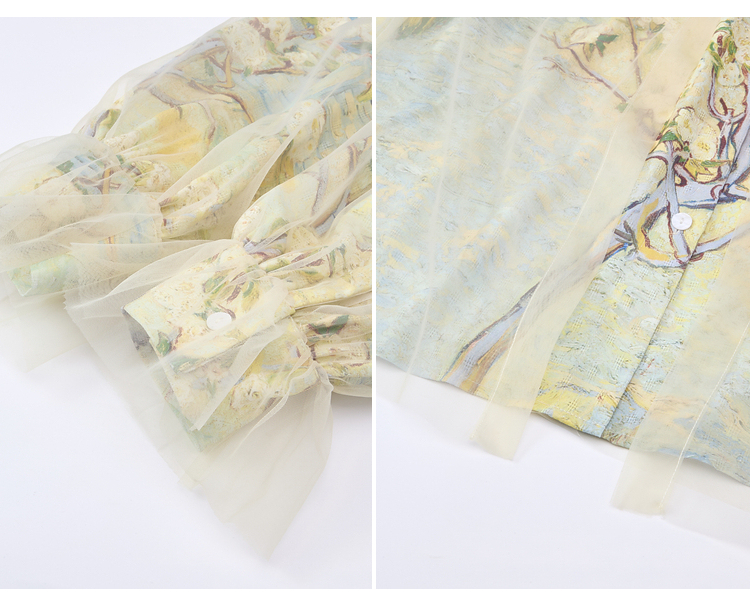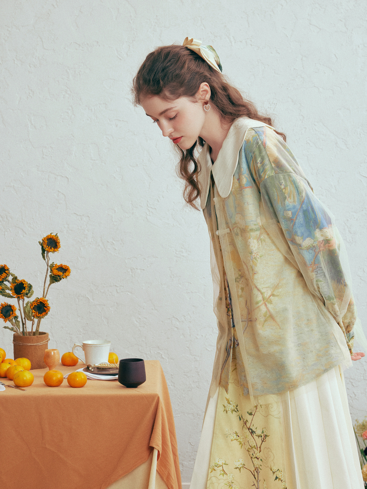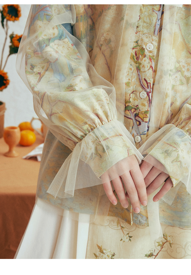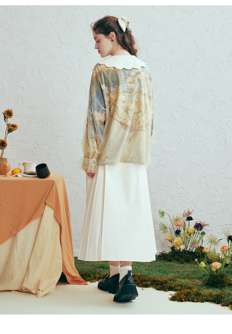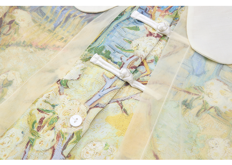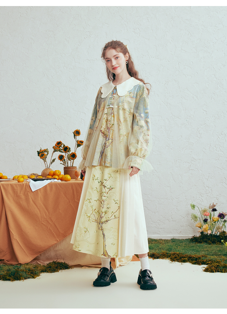 两三事梵高文艺 素雾缠枝 2026春季新款甜美娃娃领印花盘扣衬衫女