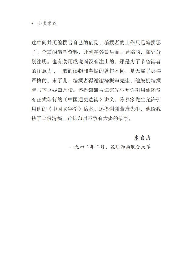 《经典常谈》写于1942年,出版于1946年,包括《说文解字》、《周易》、《尚书》、《诗经》、三礼、《春秋》三传(《国语》附)、四书、《战国策》、《史记》《汉书》、诸子、辞赋、诗、文等十三篇,简明扼要地介绍了中国传统文化经典的精髓,是普及中国传统文化的典范之作。 朱自清先生认为:“在中等以上的教育里,经典训练应该是一个必要的项目。经典的价值不在实用,而在文化。”全书以书为主,讲解中国传统文化,简洁精辟,深入浅出,通俗流畅,是驶入经典的一只航船。