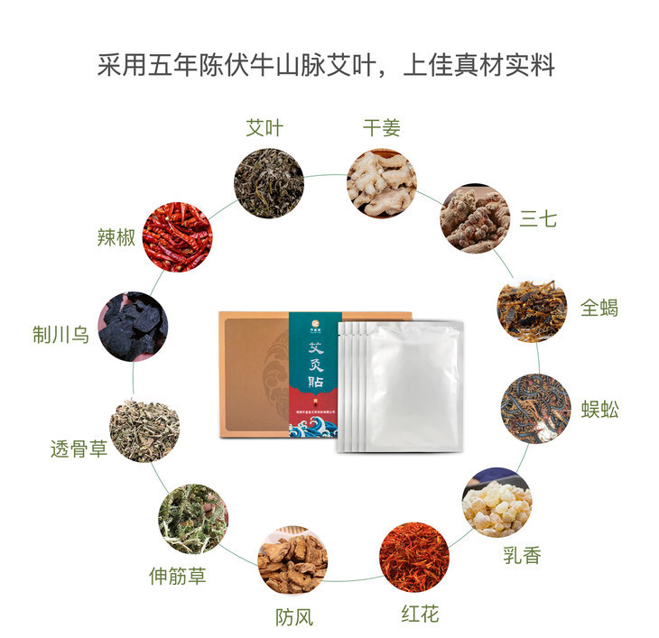 还加上10余种其余地道草本:艾叶、干姜、三七 、红花、防风、透骨草、制川乌、辣椒、乳香、伸筋草等。
