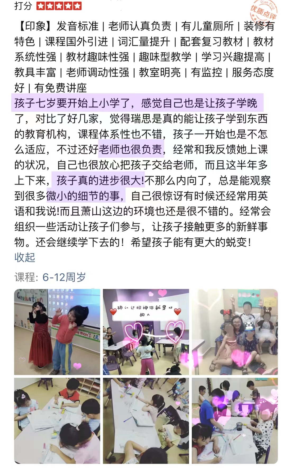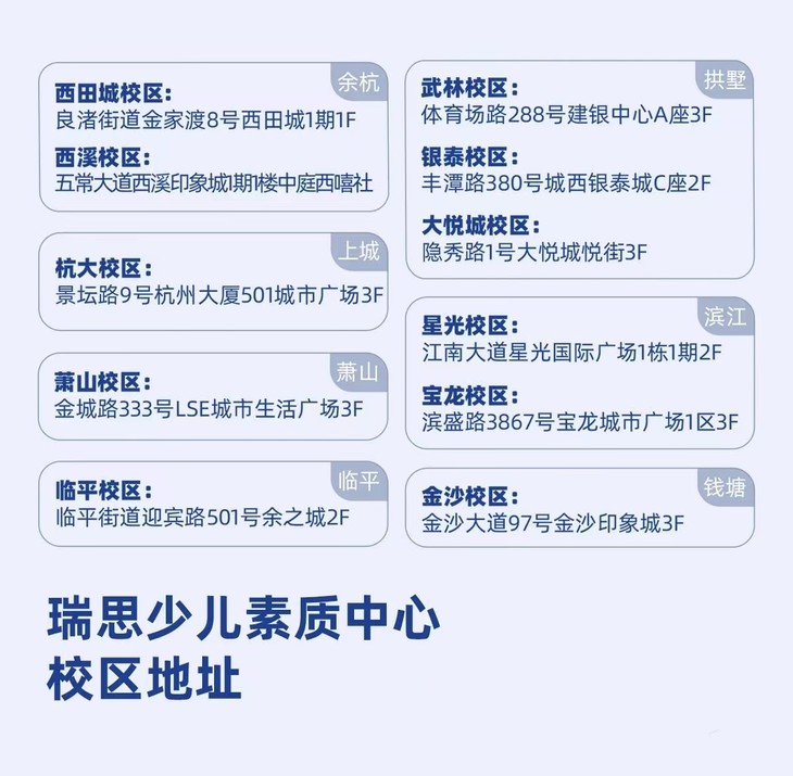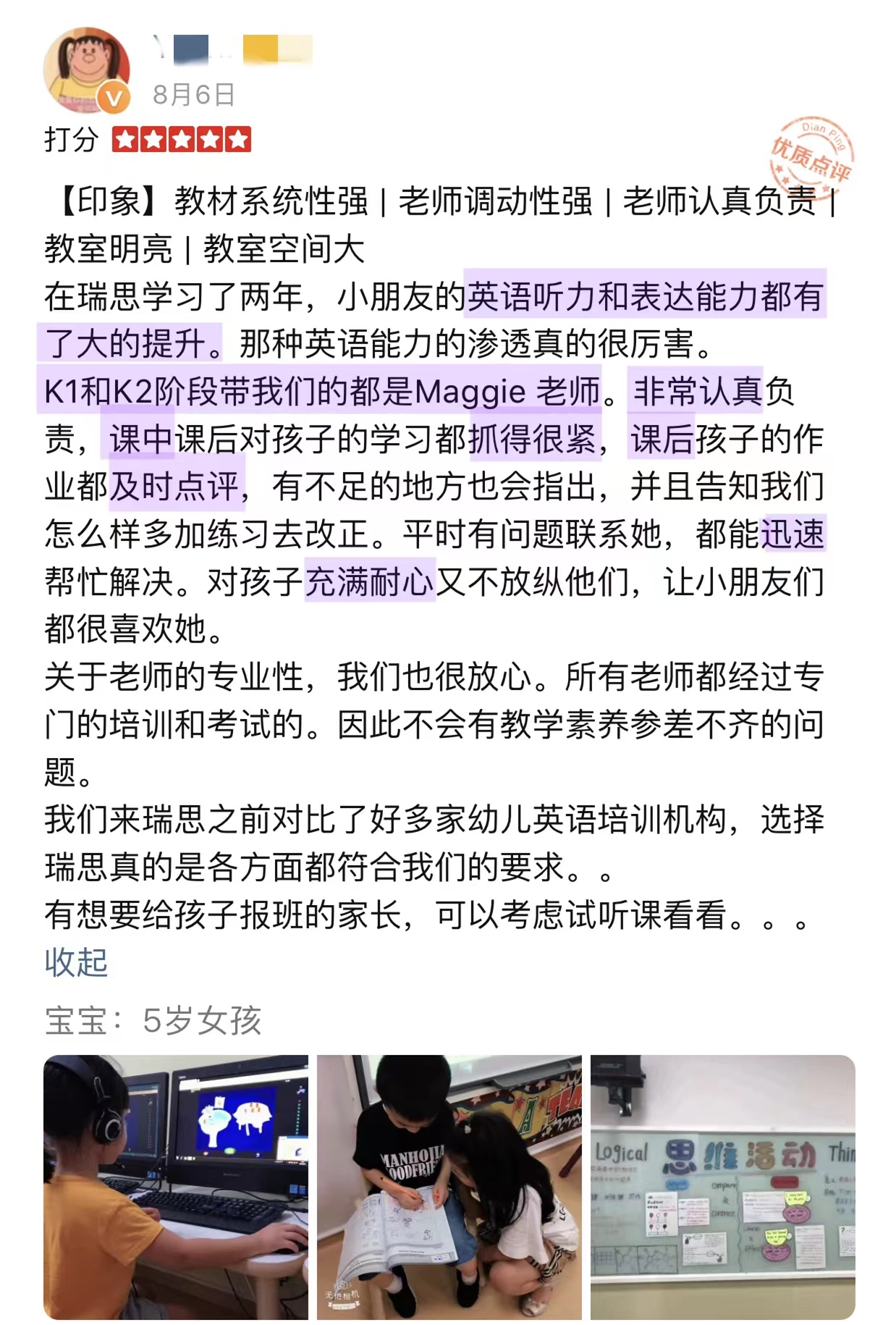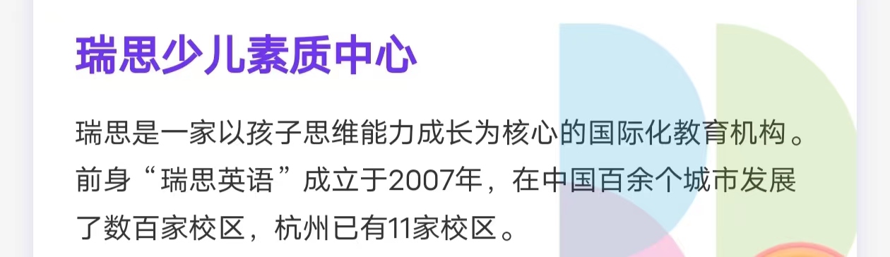 瑞思为2.5-12岁孩子提供英语教育。全英文授课,以探索、创造性游戏型教学活动为课堂内容,挖掘孩子多元潜能,培养孩子学习兴趣和英语应用能力。