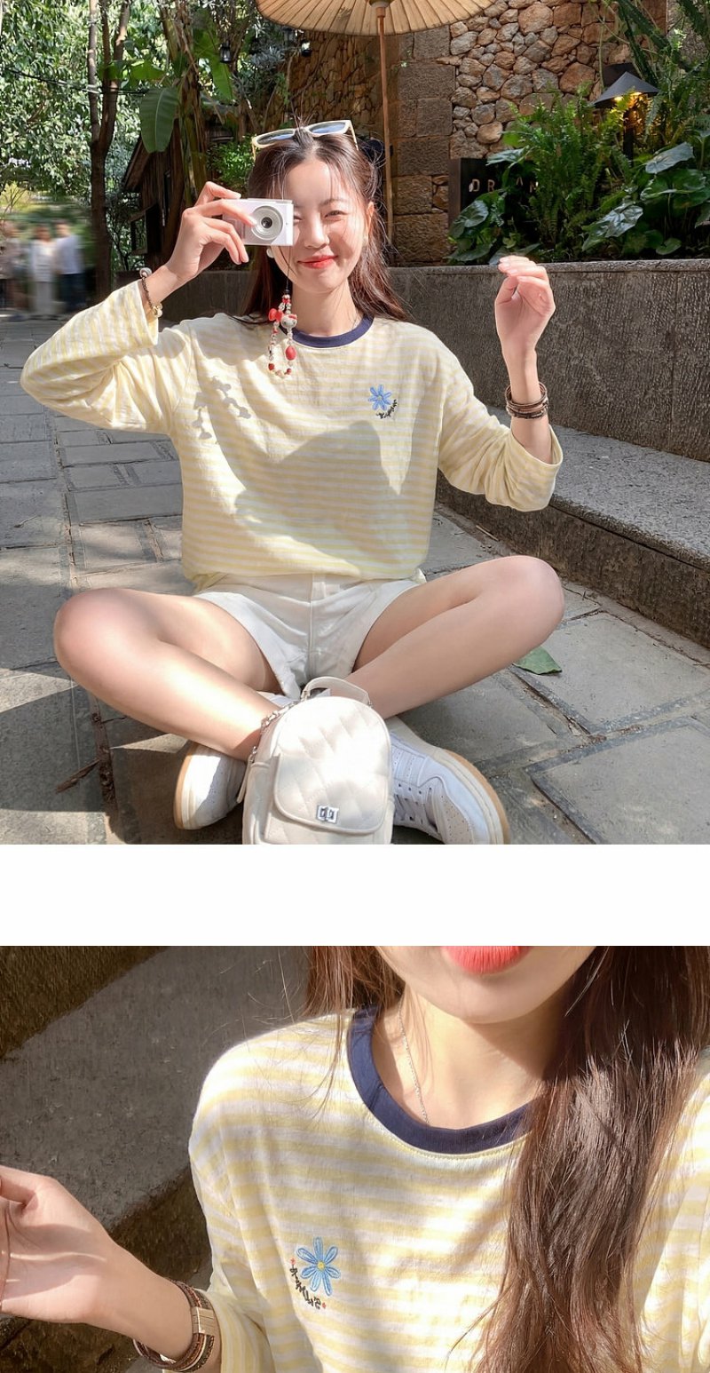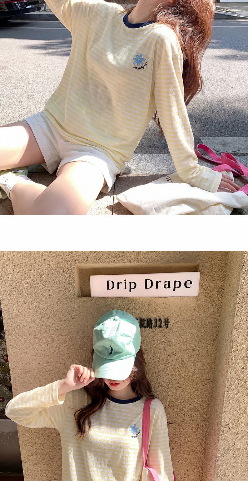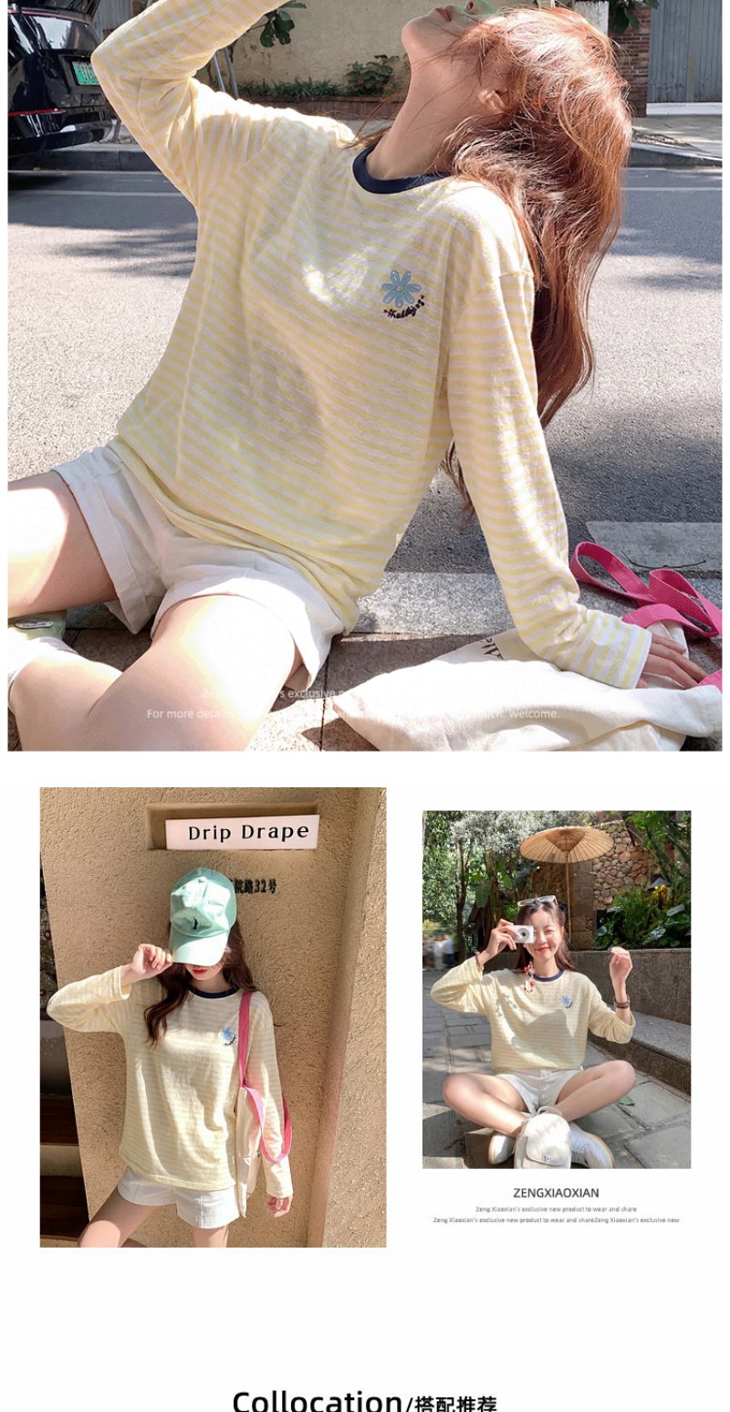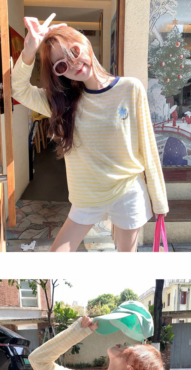 曾小咸 韩系刺绣黄色条纹薄款长袖t恤女夏季新款宽松防晒罩衫上衣【预售7-15天发货】