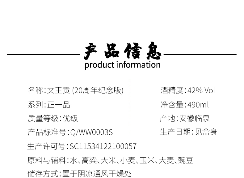 文王贡酒 情怀酒 42°正一品 上市20周年纪念版490ml *4