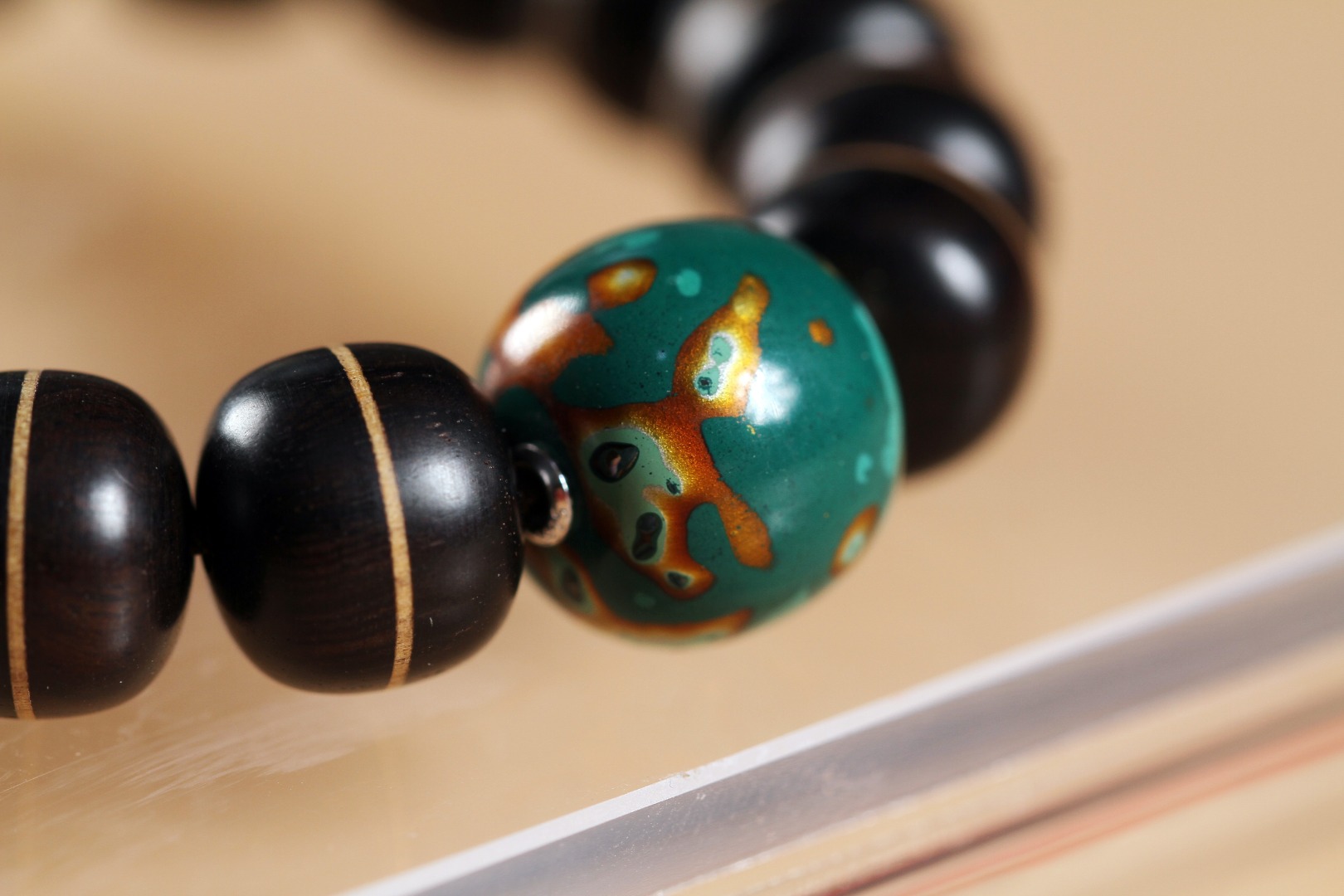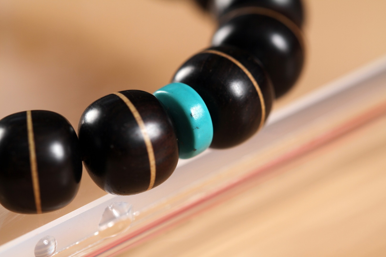 搭配:以紫光檀双色珠镶嵌黄杨木,配大漆珠及绿松隔片