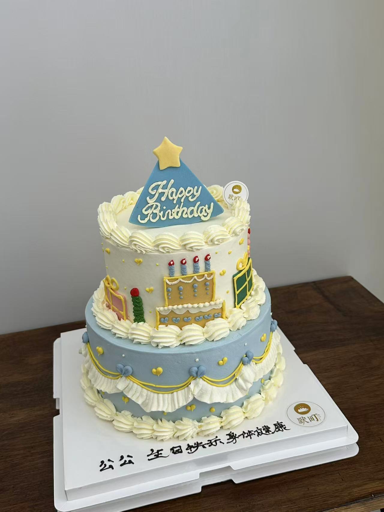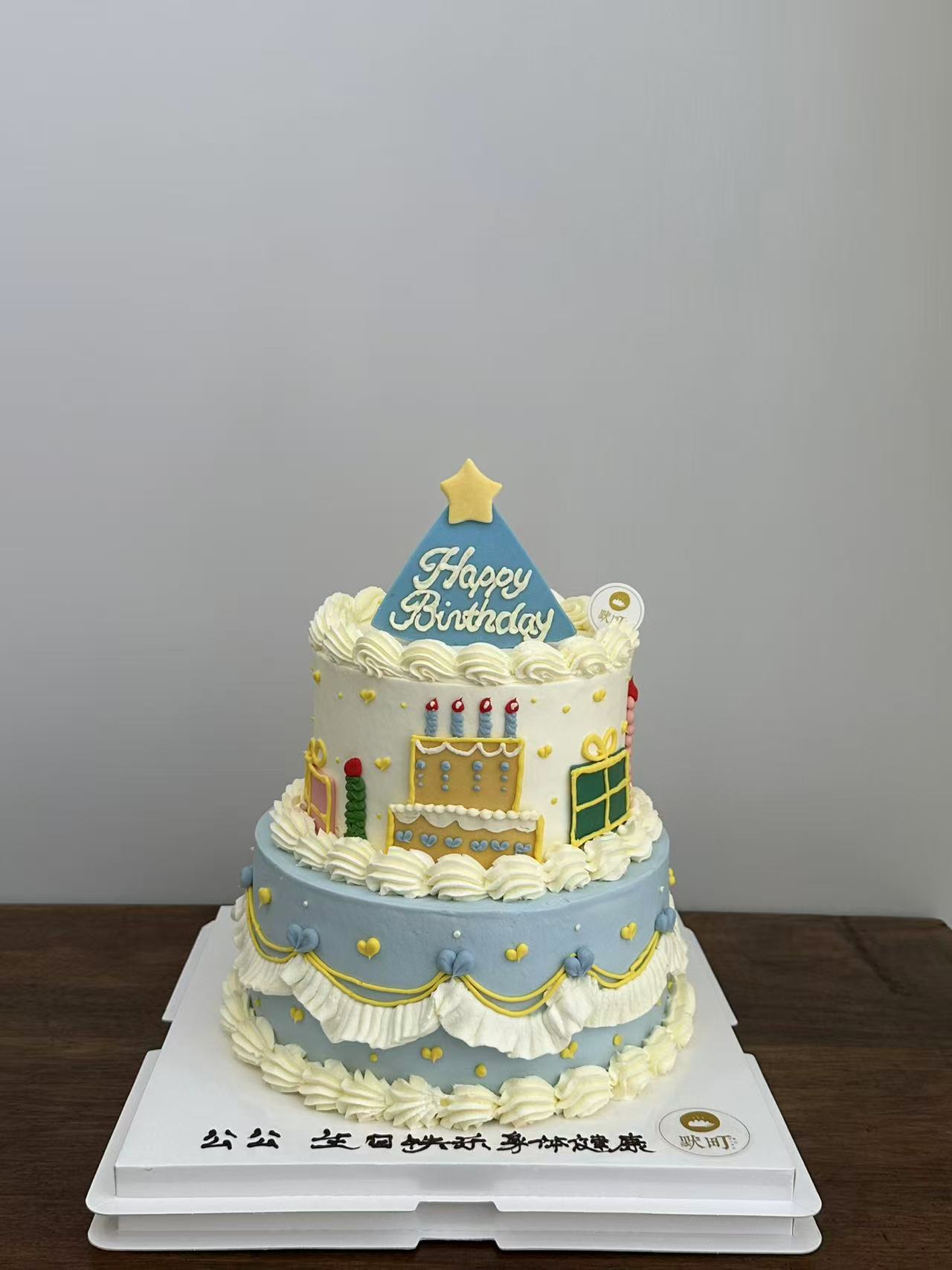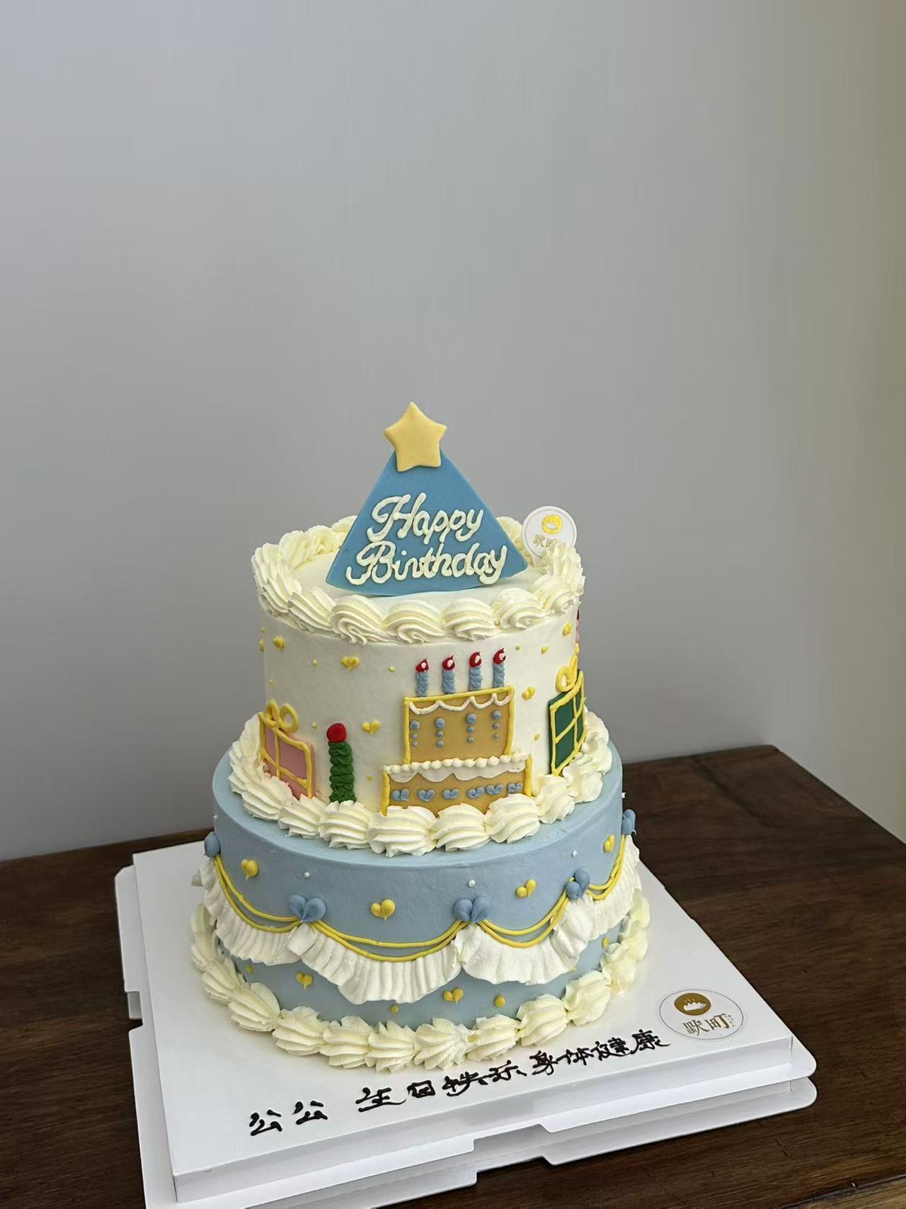 复古吹蜡烛-裱花浅蓝色蛋糕