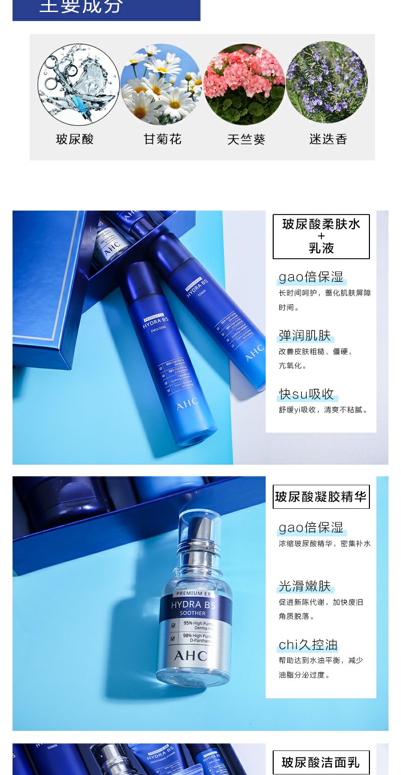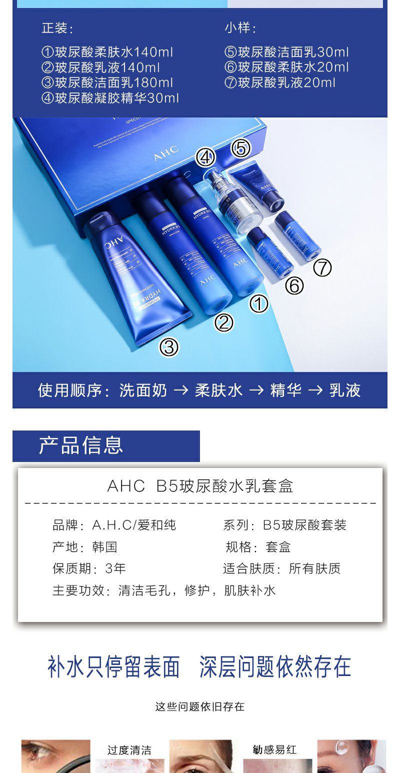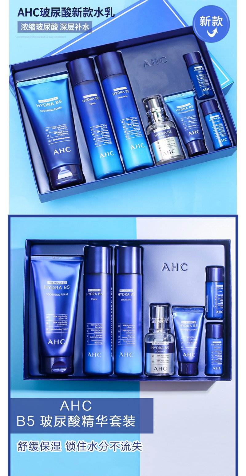 韩国AHCB5玻尿酸水乳7件套补水保湿套盒洁面精华清爽面部修护套装