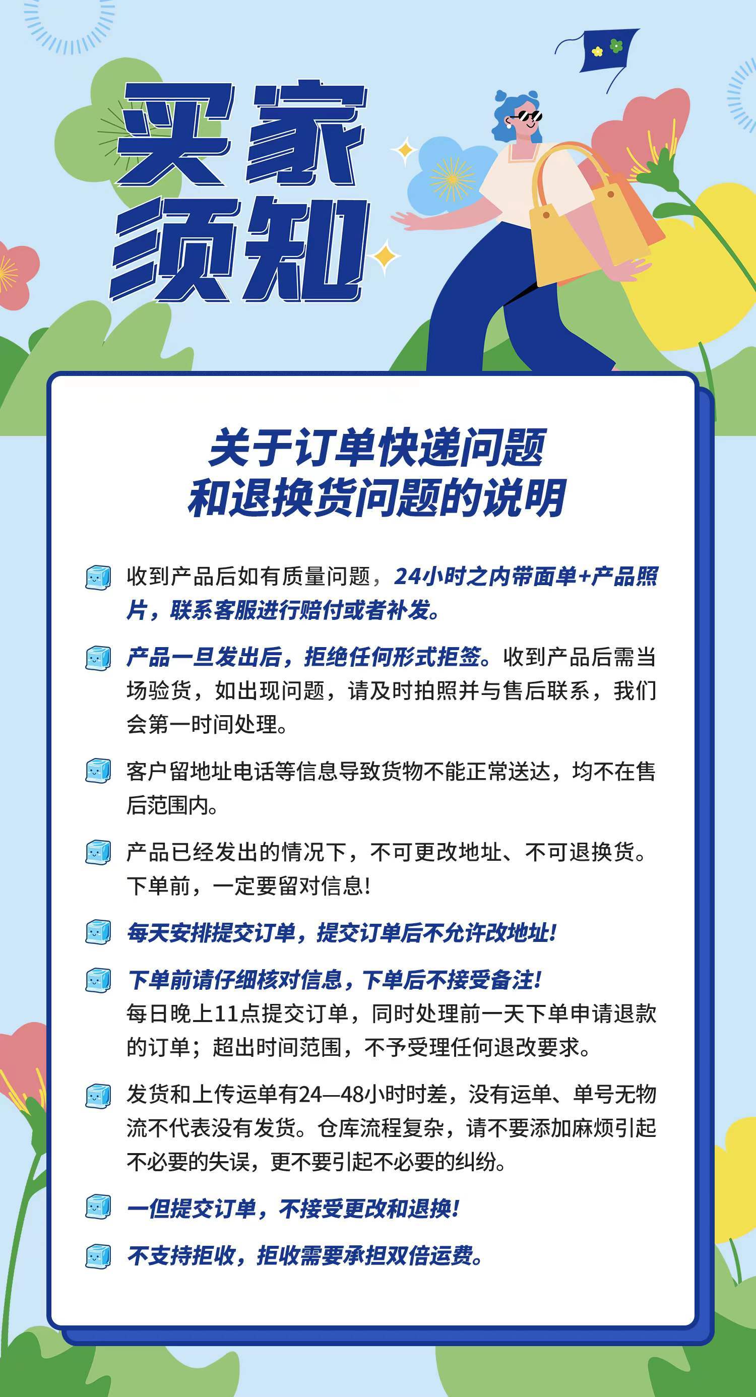 ■ 签收后第一时间验货,若有问题,请于【12小时】内拍照,问题单和快递单【合影拍照】,单号必须【清晰可见】过期不予处理,没有面单恕不处理!