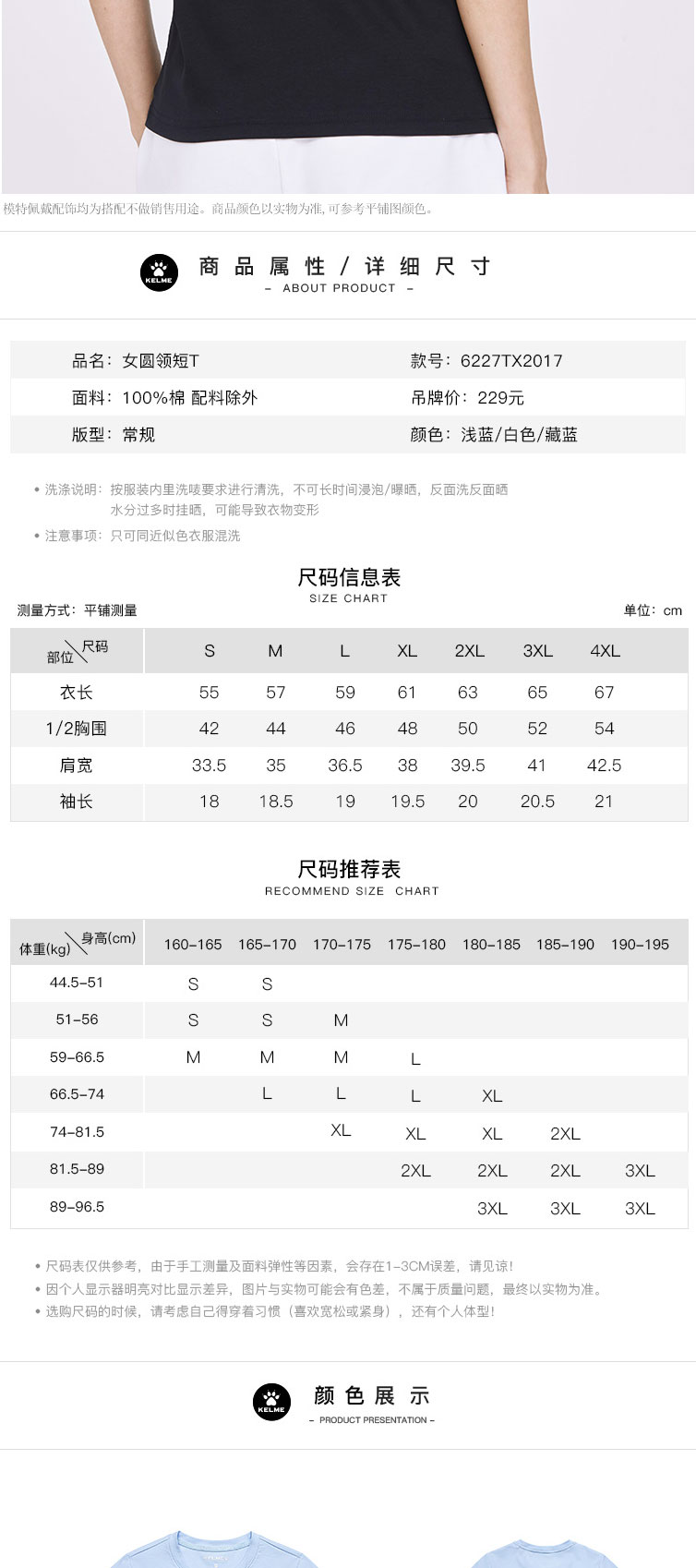 KELME卡尔美女士短袖T恤夏季新款透气纯棉ins潮运动圆领上衣6227TX2017