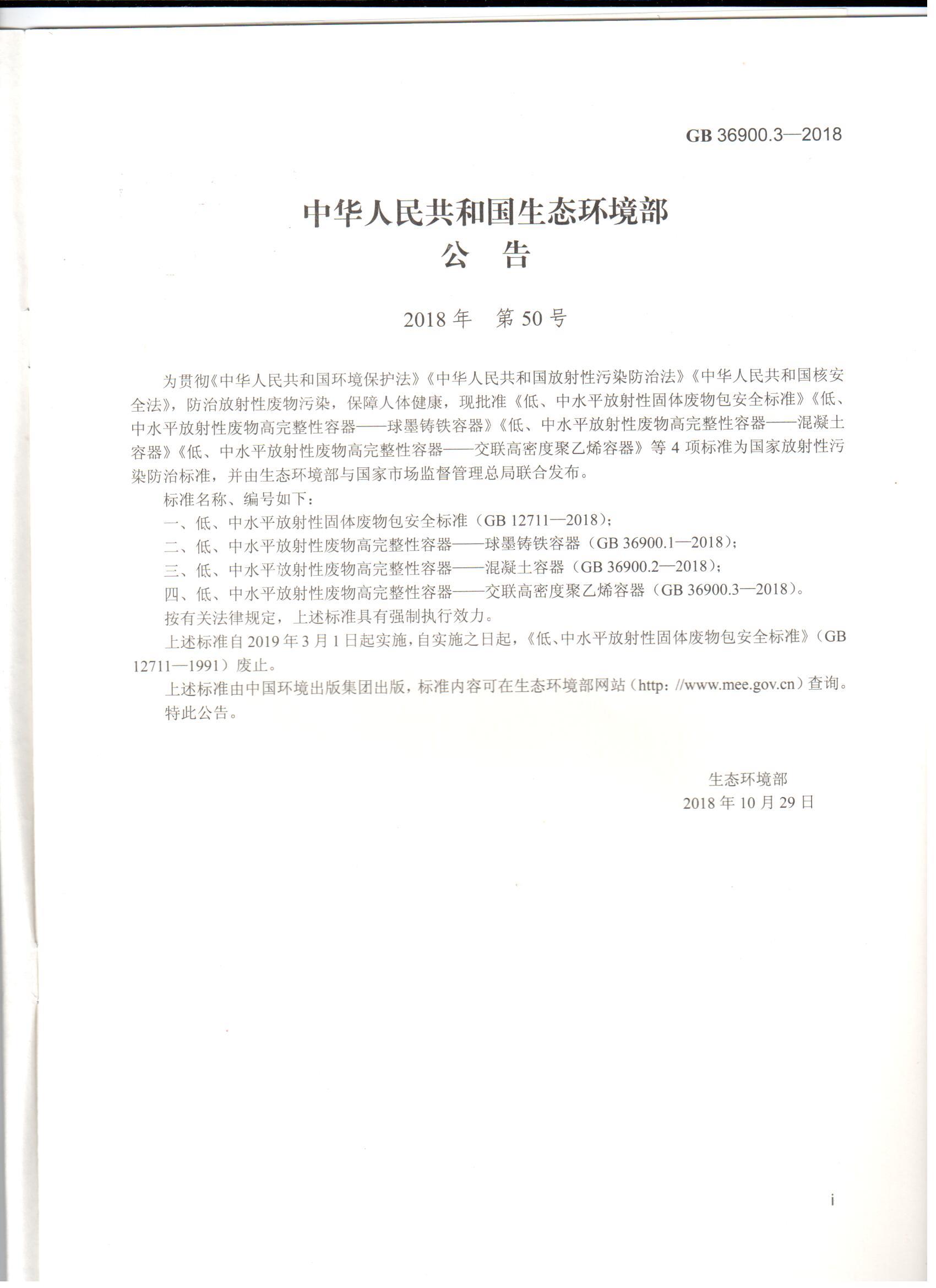 GB36900.3-2018 低、中水平放射性废物高完整性容器-交联高密度聚乙烯容器 国家标准