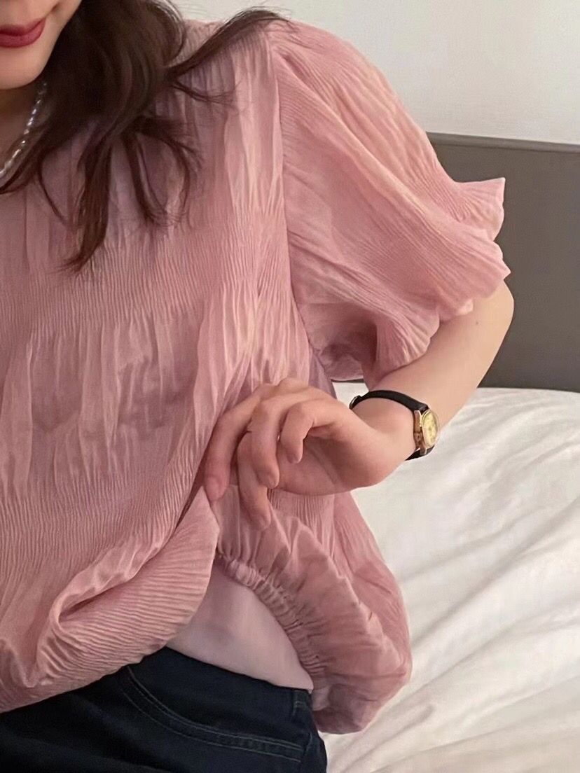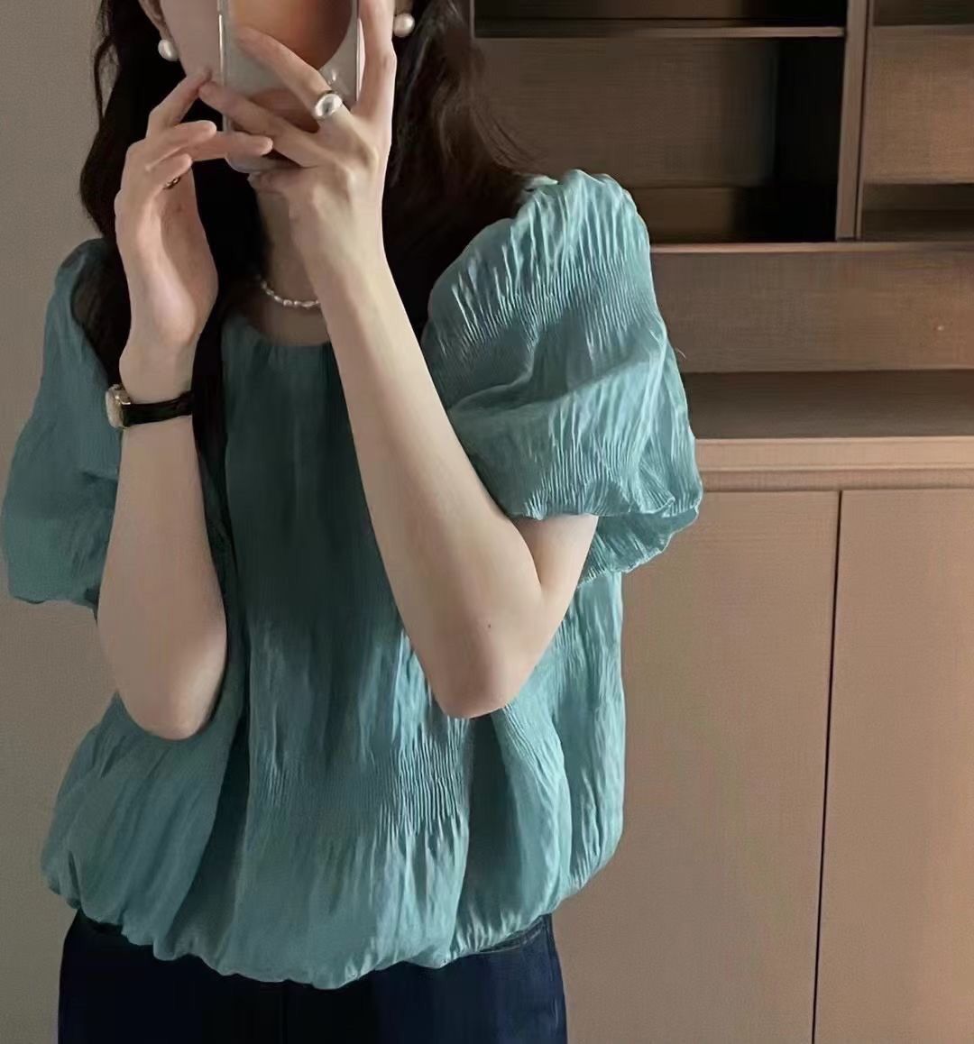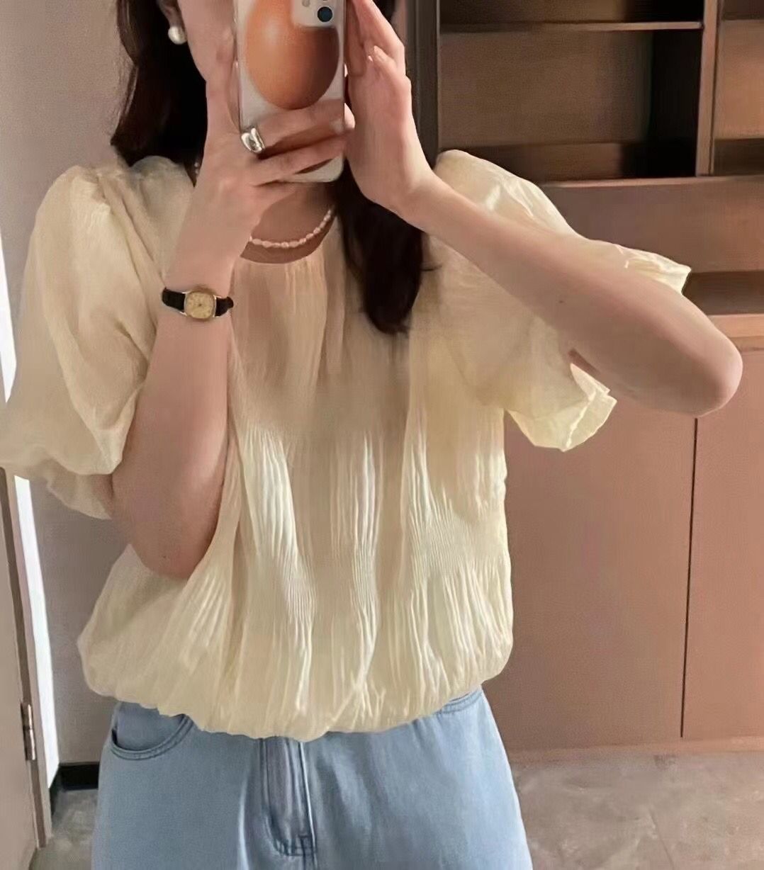 【限时折扣】韩版温柔风圆领泡泡袖小衫雪纺上衣均码 (非质量问题不退不换)