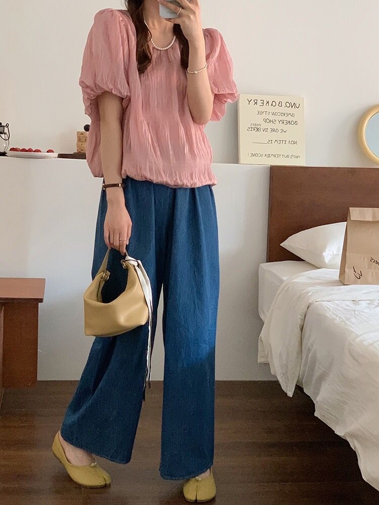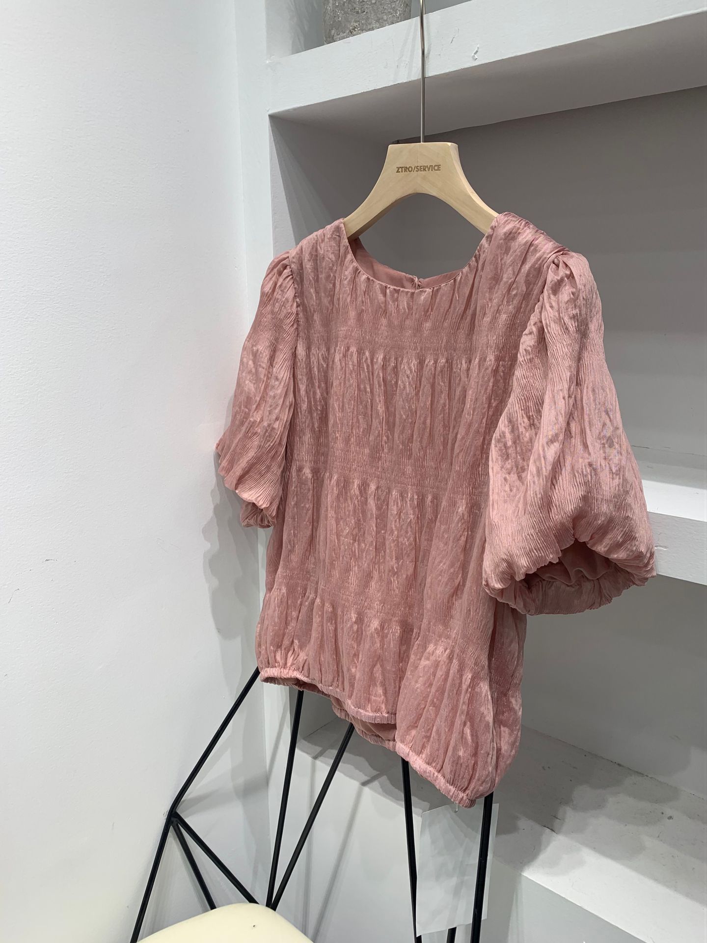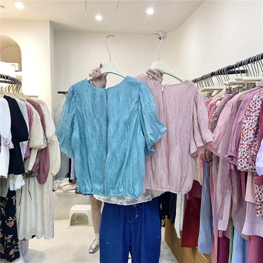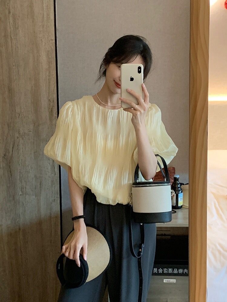 【限时折扣】韩版温柔风圆领泡泡袖小衫雪纺上衣均码 (非质量问题不退不换)
