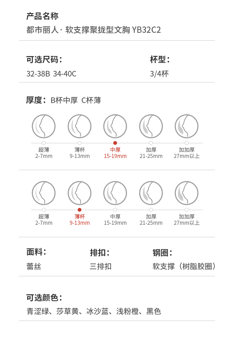 都市丽人聚拢升杯内衣B:中厚C:薄3/4杯蕾丝文胸三排树脂胶圈YB32C2