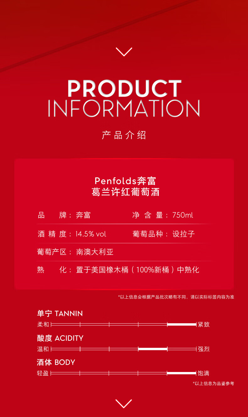 Penfolds奔富葛兰许设拉子红葡萄酒澳洲原装进口干红正品官方旗舰店