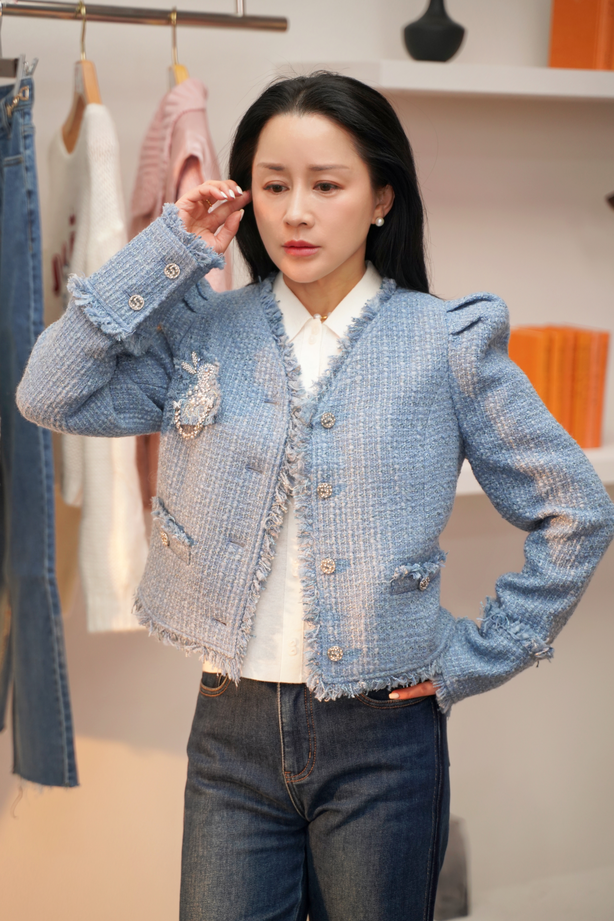 1、钮扣巧思:门襟第一粒扣子可解开,方便穿脱,其余钮扣为装饰点缀,又能防走光,设计绝绝子