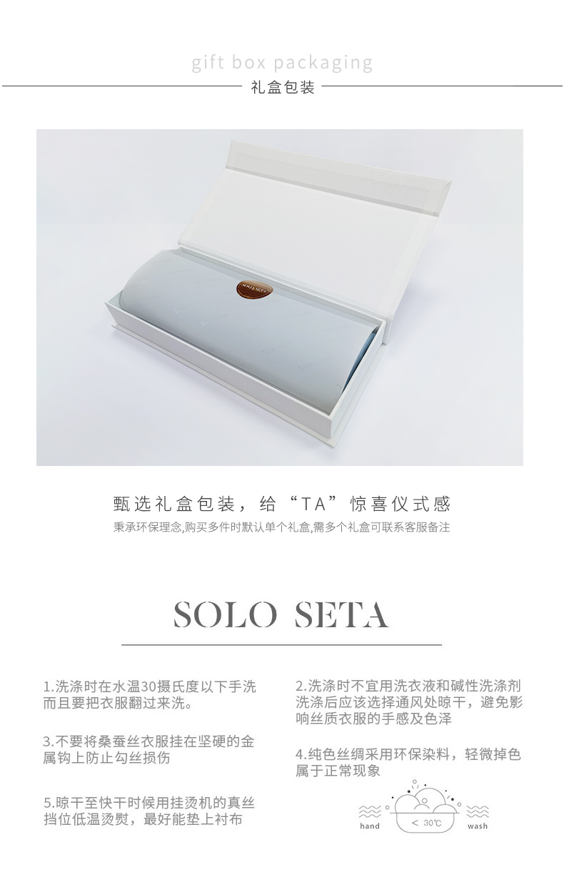 - soloseta专注于真丝织物,灵感源自意大利语,中文含义为“只做真丝”的意思。让睡衣变时尚,居家和外出瞬间切换,使其更具有出街,度假,参加宴会等功能。